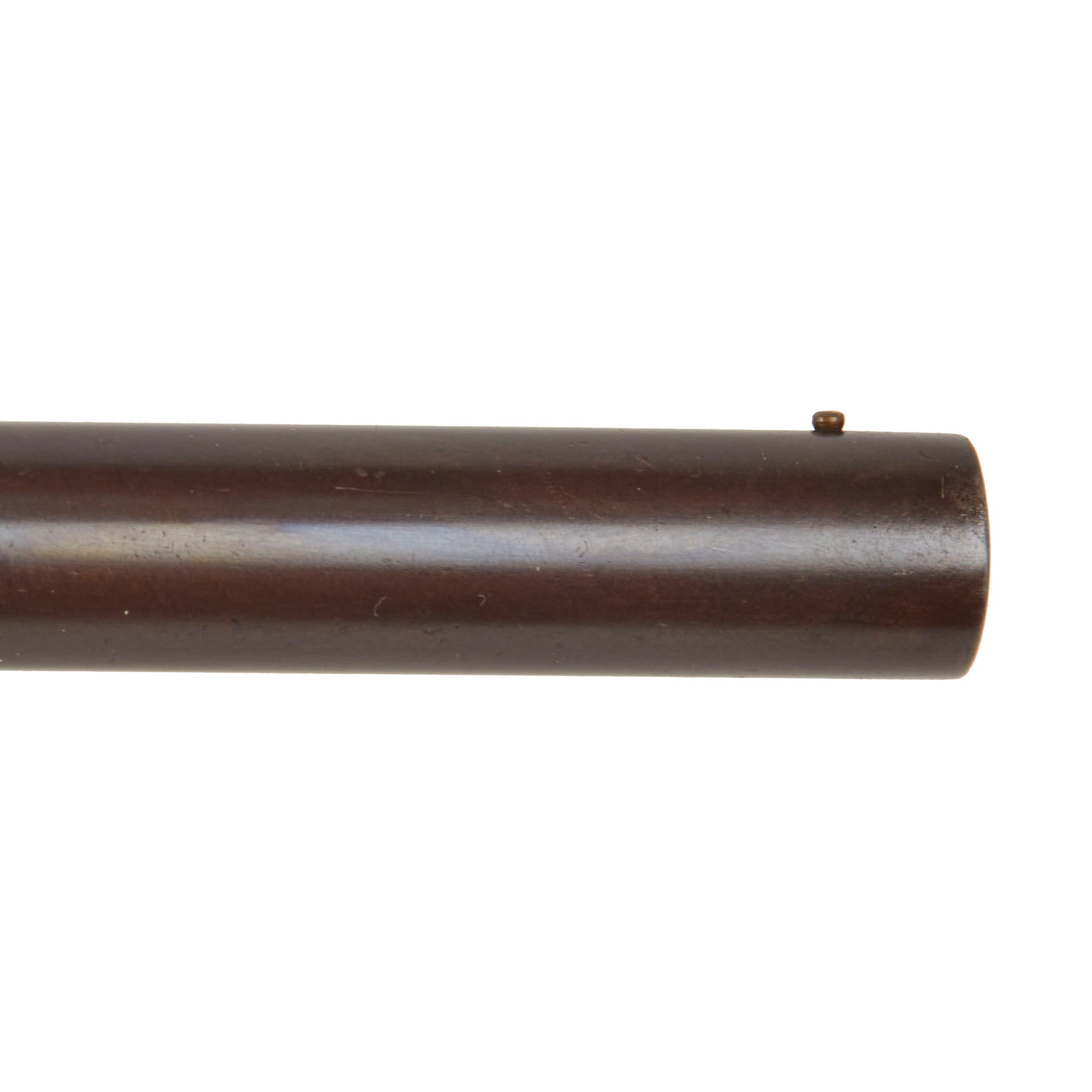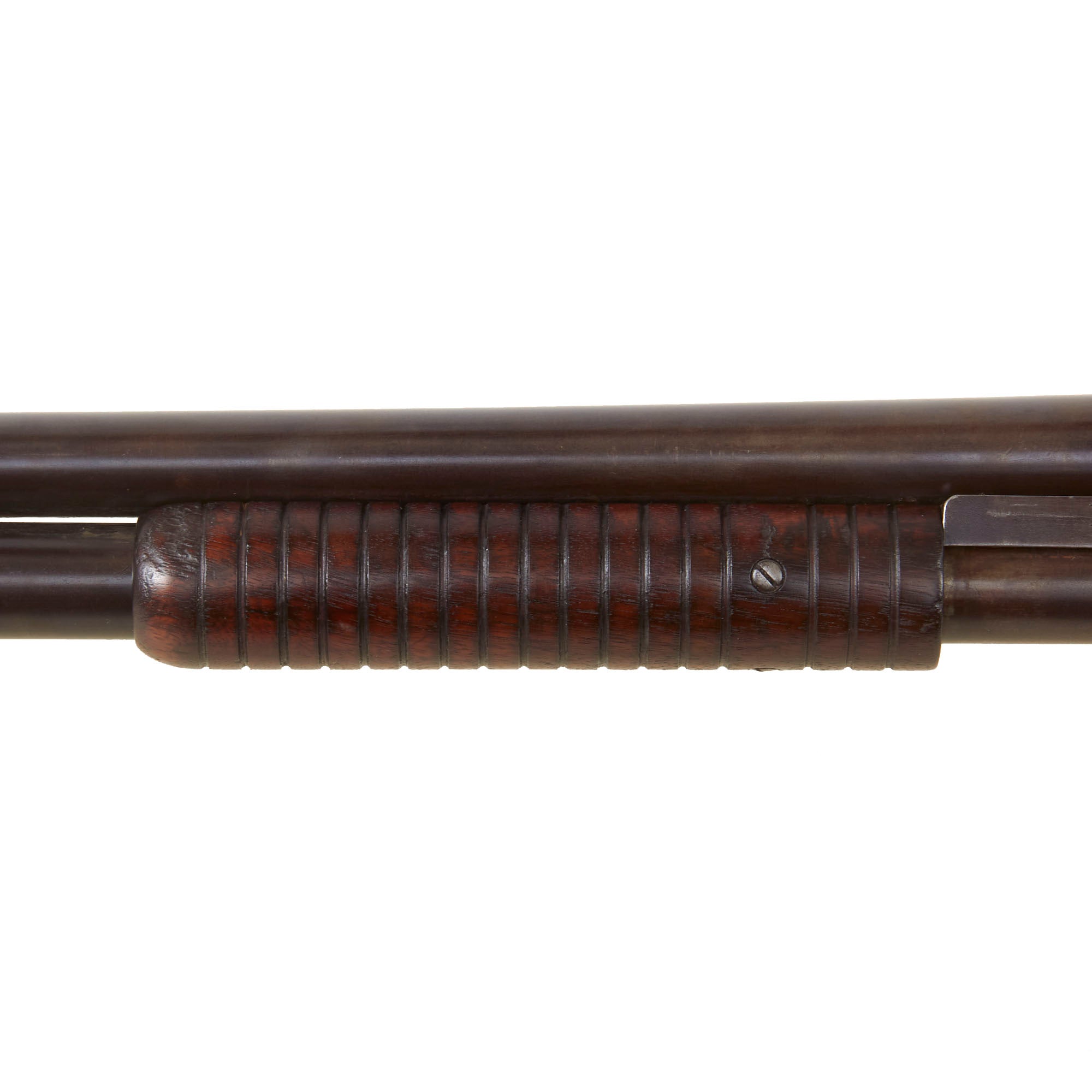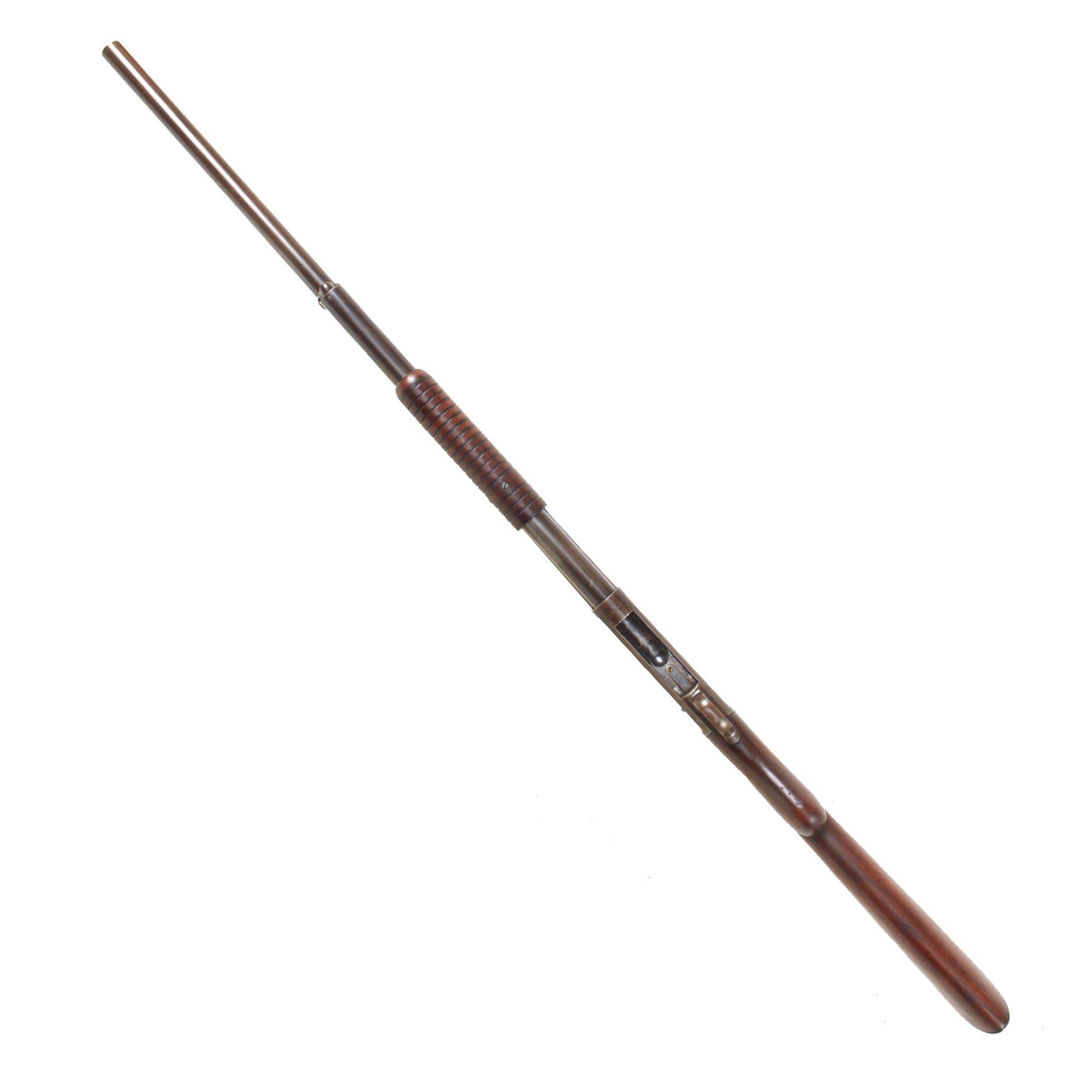 The bore is clear and partly bright, with past powder fouling and oxidation present in areas. It looks to have seen a good amount of use while in service. The metalwork overall is faded to a lovely plum patina on the barrel, which was original blued. The magazine has more of the bluing intact in front of the fore stock, while behind it the finish is worn to plum. When cycling the gun we can see that the under the pump / slide most of the finish is missing. The action was originally case hardened, but now is worn to mottled blue brown patina in most areas, except on the carrier, which still retains a good amount of the original bluing. The action works well, though we have no way to check to see if it still feeds well. We did notice that hammer very often does not end up fully cocked after cycling, and needs to be pulled back manually.