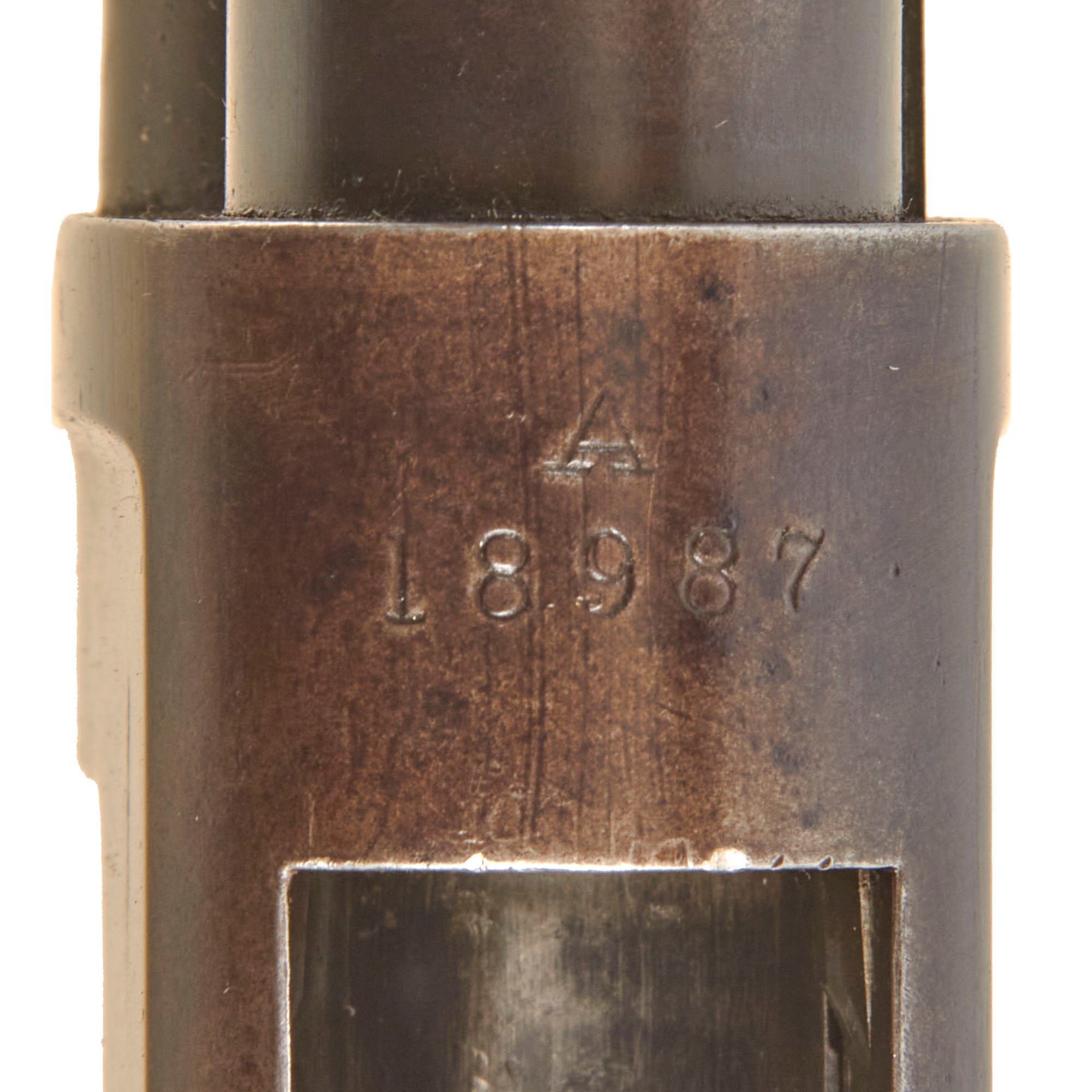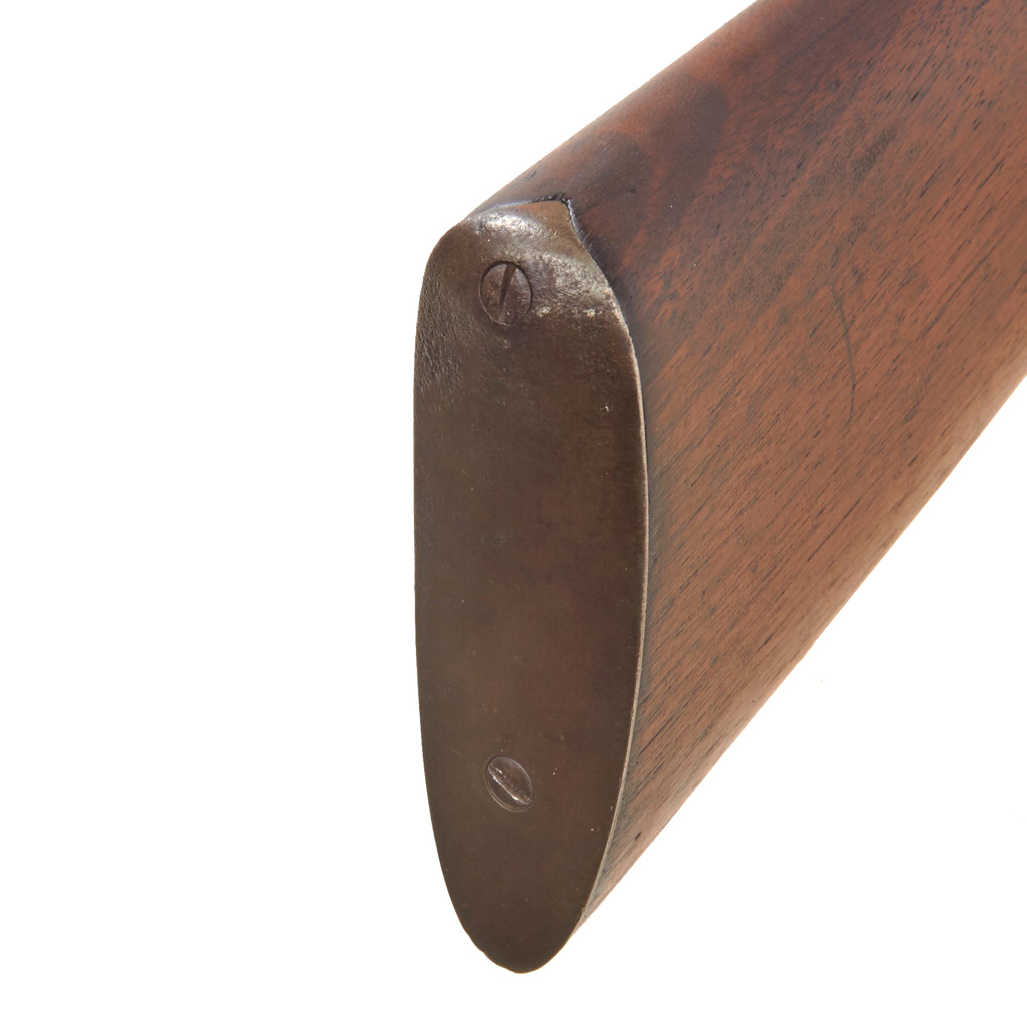 Original walnut stocks are in good solid condition with the classic dark red brown color of aged oiled walnut, and have a lovely glow. The butt stock is in great shape, with a carved in pistol grip, and has a bit of past oxidation on the metal butt plate. The fore stock is also in great shape, with the grip grooves still crisp, showing just a few missing chunks. All three of the retaining screws are still present.
