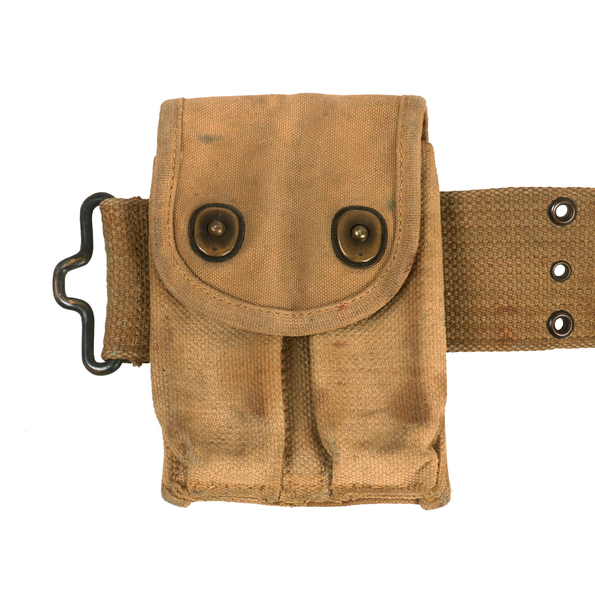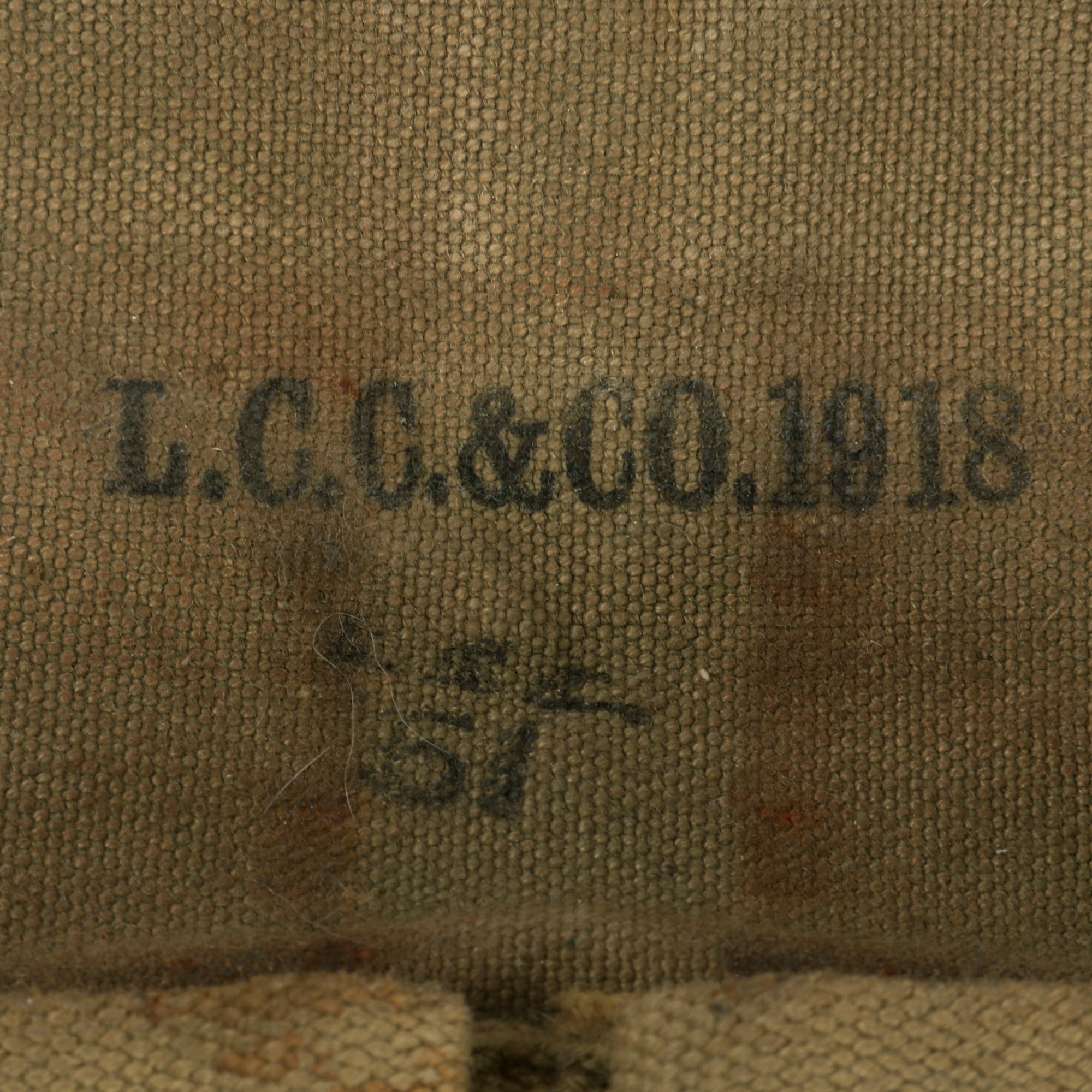 - Original WWI issue M1911 double magazine web pouch dated 1918: Free of damage and looks to have seen very little use in service. It is marked on the inside “L.C.C.& Co.1918”