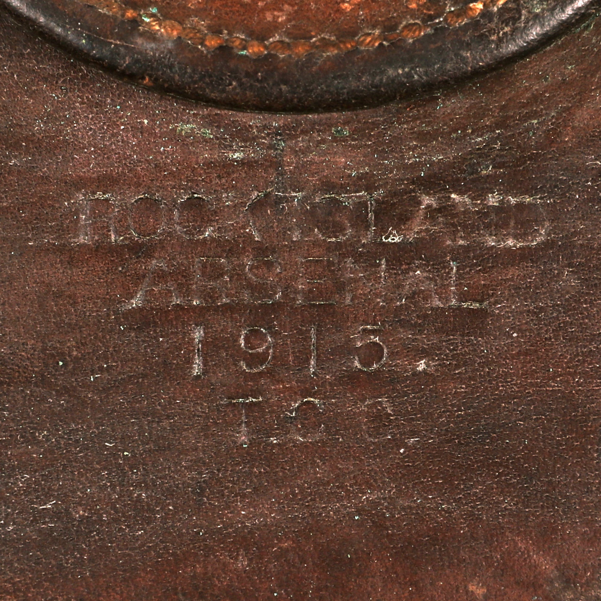 - Original WWII issue M1912 Mounted Swivel Holster. The holster is in great shape, with a darkened appearance as a result of oiling. The leather is slightly stiff from age. The holster still has the original leather leg tie down strap. It is marked with ROCK ISLAND ARSENAL / 1915 / T.C.C.