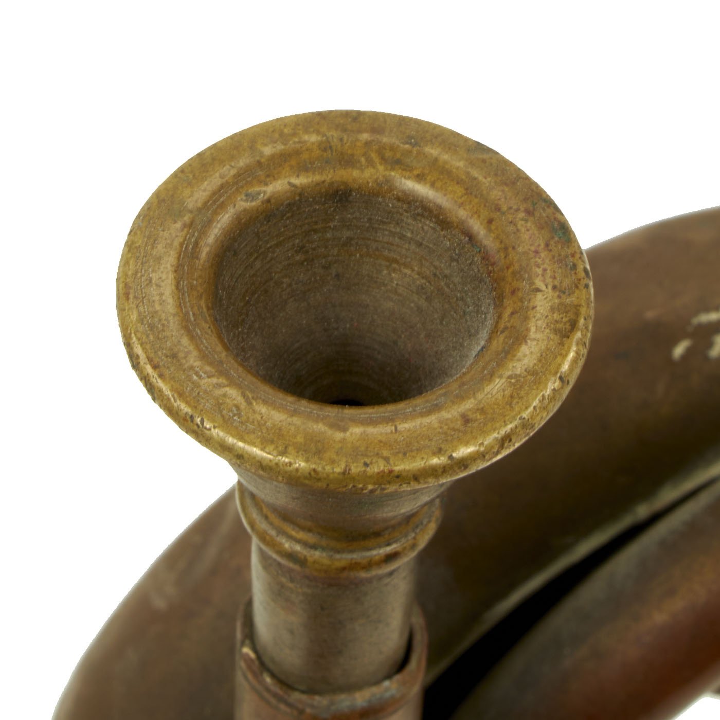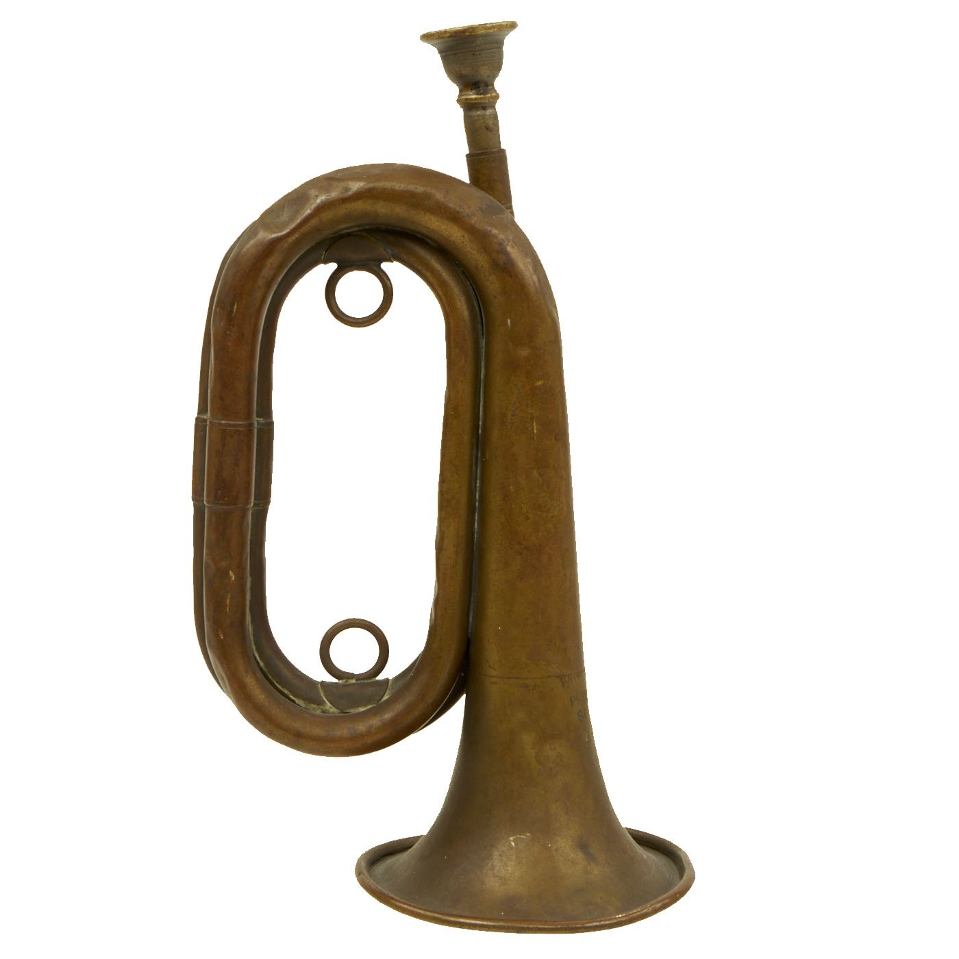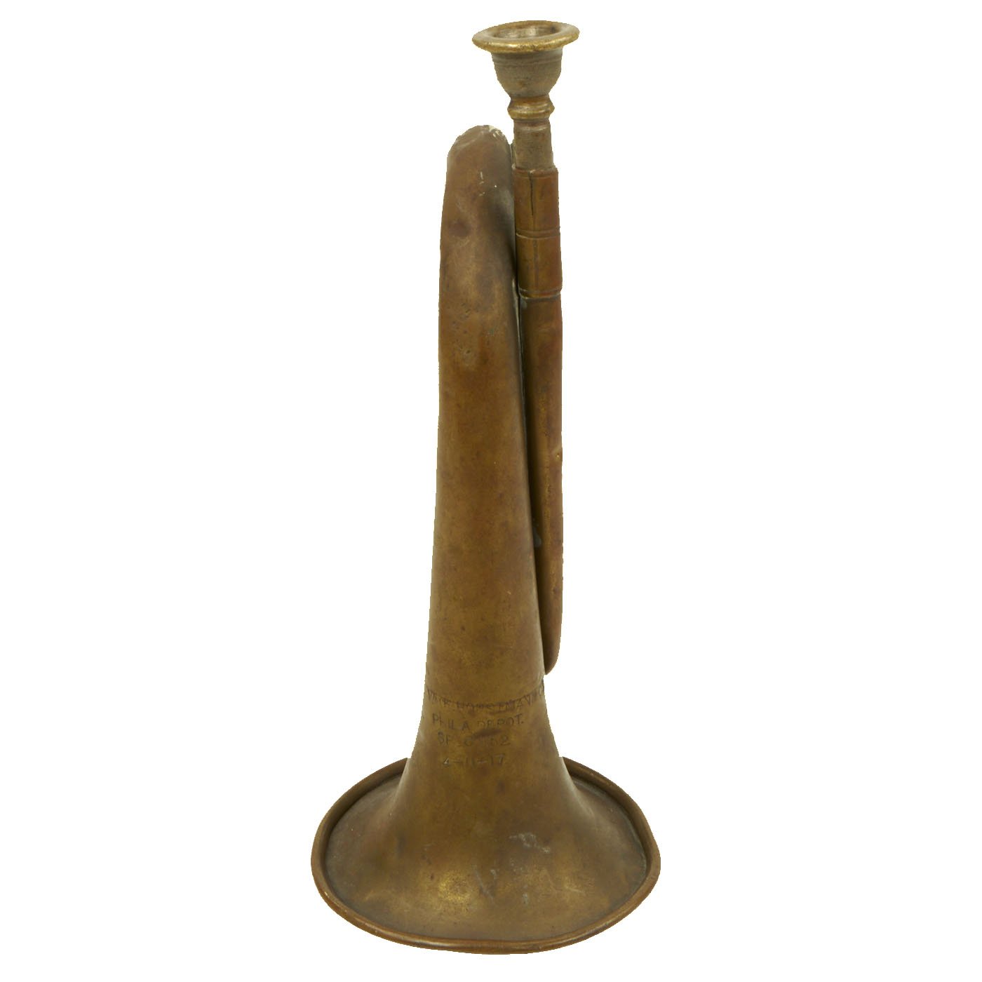 Original Item: Only One Available. This is a very nice U.S. WWI Issue Military Bugle, complete with the original mouthpiece. The bugle is made completely of brass, and is most likely in Eb, the usual key that bugles of the time were pitched in. The bell shows a brazing seam around the flare spout, which is easier to see on the inside of the bell. It still has the complete maker marking and date: