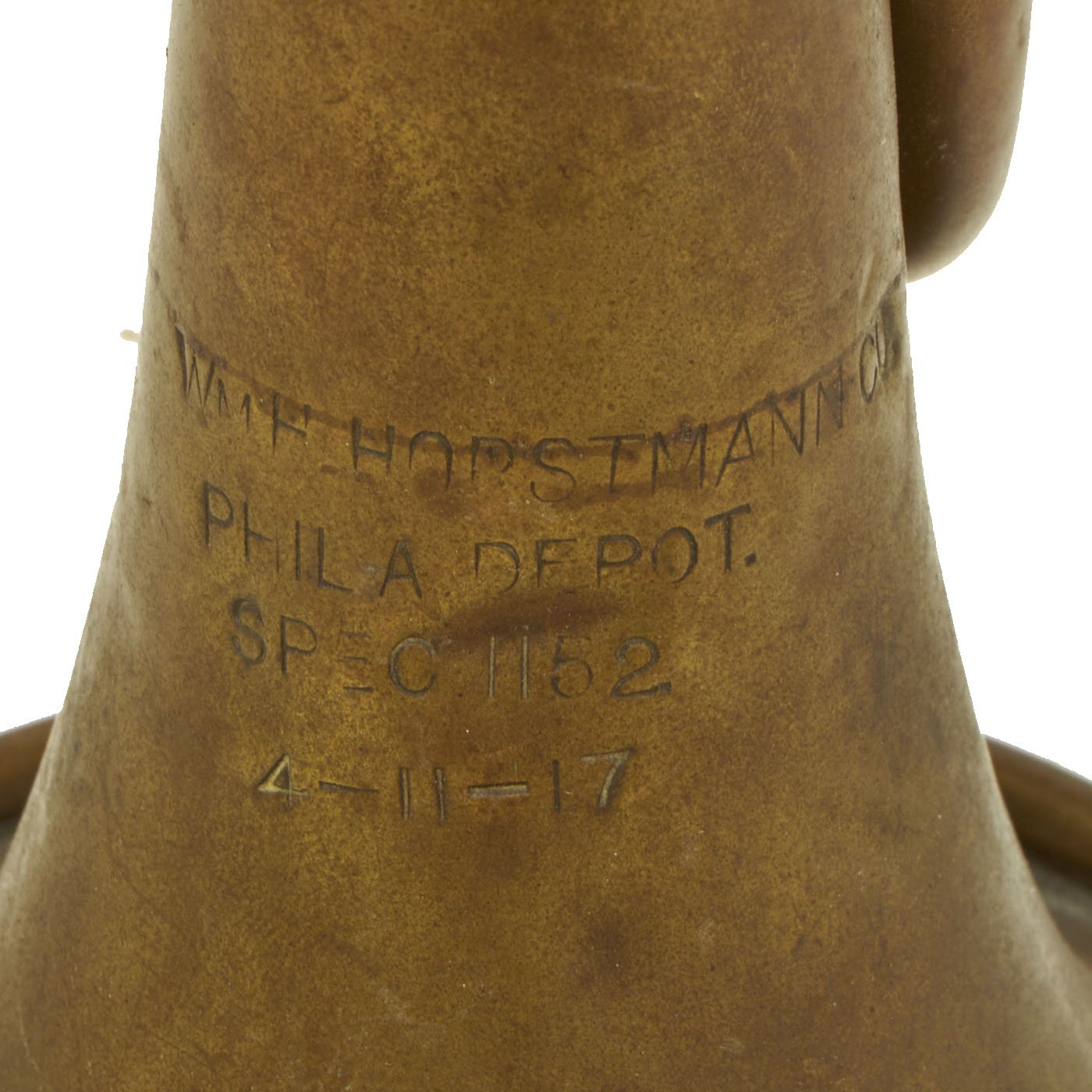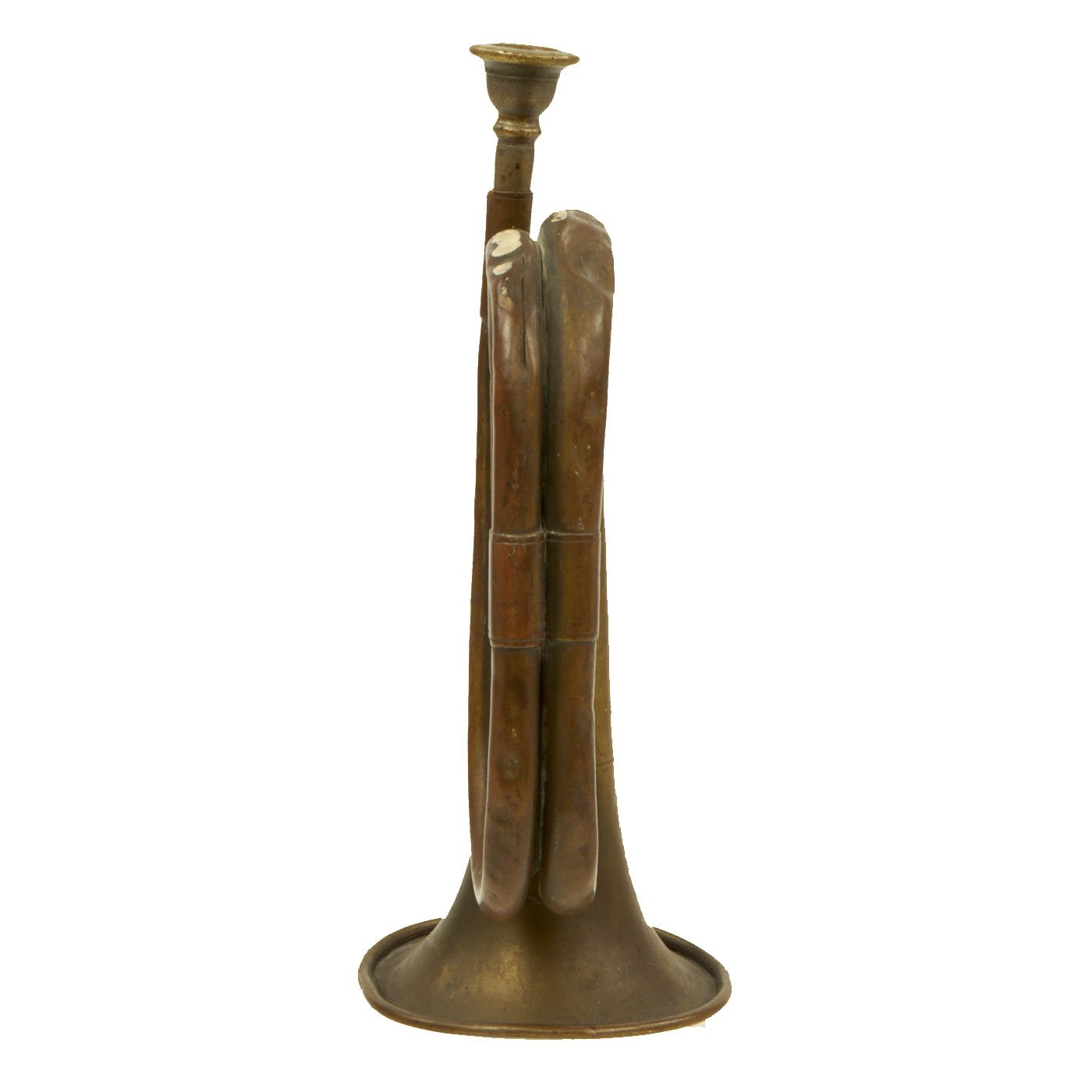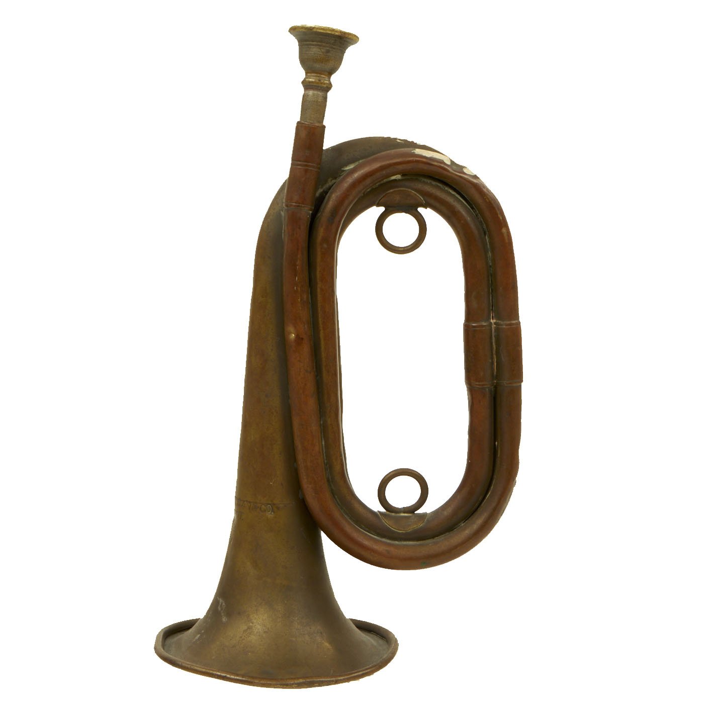 Original Item: Only One Available. This is a very nice U.S. WWI Issue Military Bugle, complete with the original mouthpiece. The bugle is made completely of brass, and is most likely in Eb, the usual key that bugles of the time were pitched in. The bell shows a brazing seam around the flare spout, which is easier to see on the inside of the bell. It still has the complete maker marking and date: