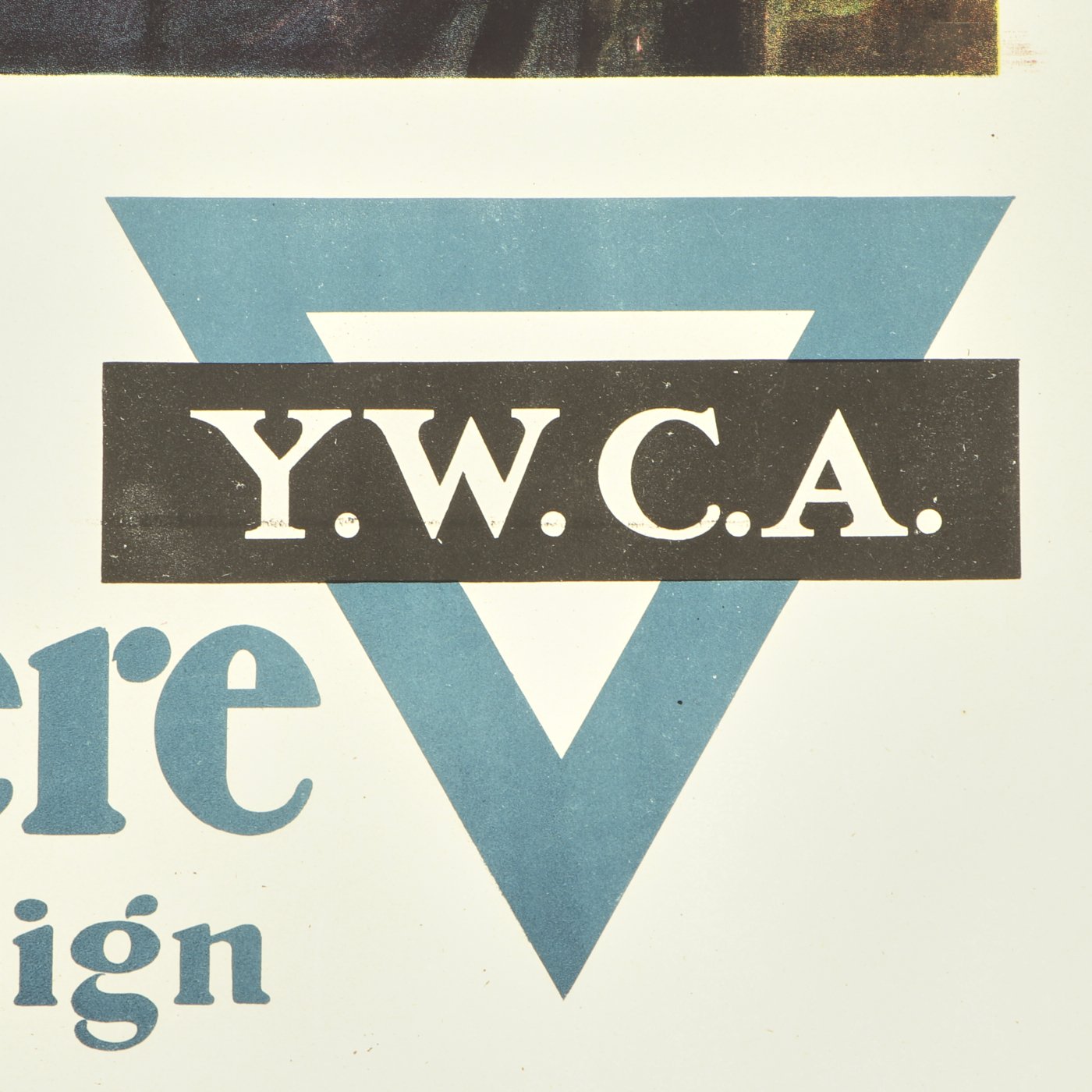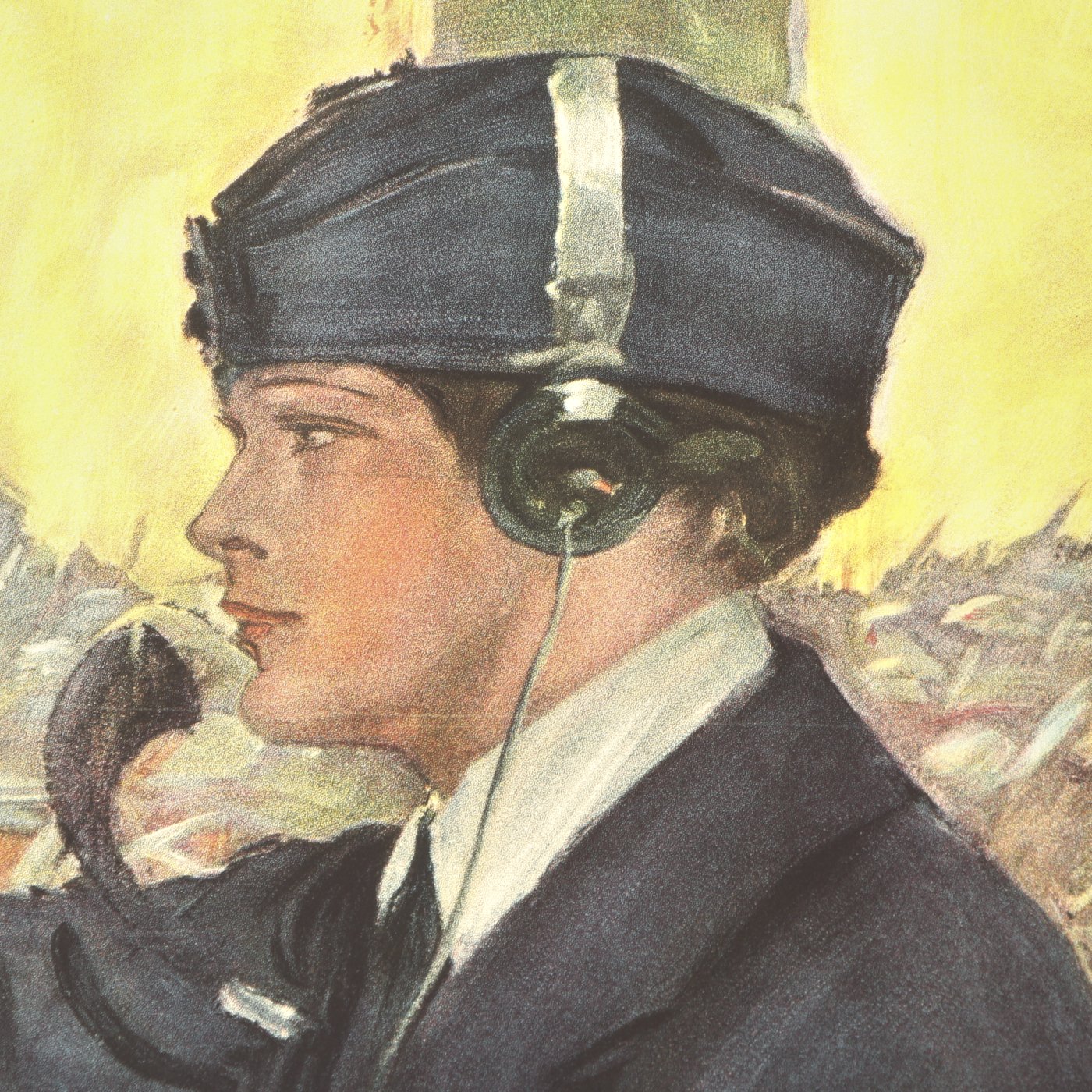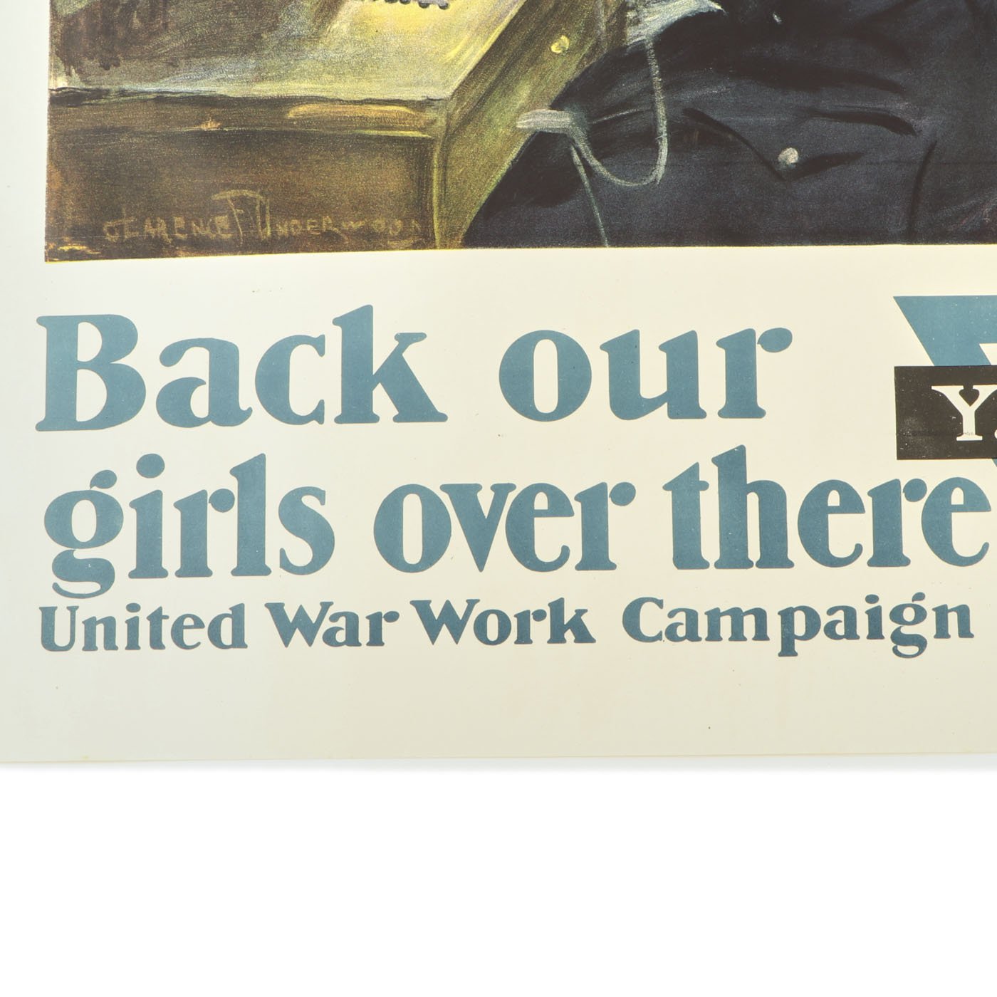 Original Item: Only One Available. World War One "Back Our Girls Over There", 28" x 21" Artist: Clarence Underwood. Printed for the Y.W.C.A., this poster promoted women's work in the war effort overseas. The United War Work Campaign represented several prominent organizations that were active in providing services to those in the military. Represented were the Y.M.C.A., Y.W.C.A., National Catholic War Council, Knights of Columbus, Jewish Welfare Board, War Camp Community Service, American Library Association, and Salvation Army. The goal for the group was to raise over 170 million dollars. This poster is one of many which promoted the women's work overseas. The army hired women to serve as telephone operators overseas, as this poster shows. The United War Work Campaign was a combined effort of several organizations, including the Y.W.C.A., to raise money for the war. World War I was the first time in American history that women were officially part of the military and government agencies. But, while women were being encouraged to serve in the war, women were also protesting for their right to vote.