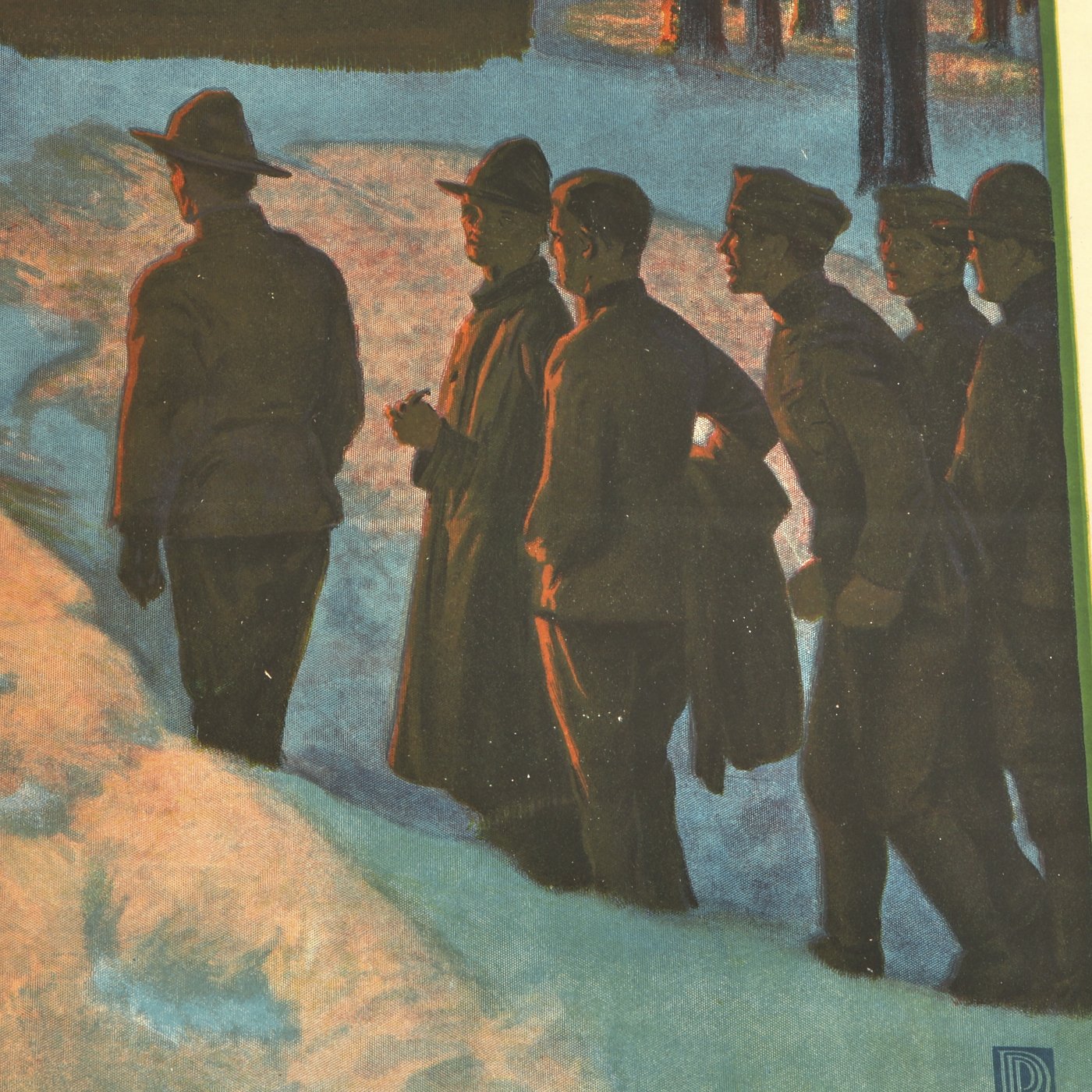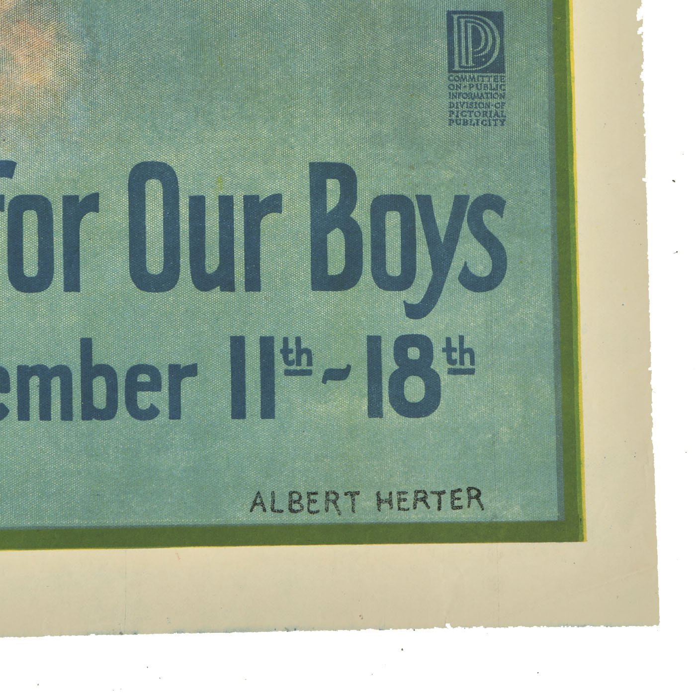 This poster asked for donations for the United War Work Campaign for 17,500,000 dollars. The United War Work Campaign was created a the day WWI ended. It was formed by a coalition of America’s biggest organizations: YMCA, YWCA, The American Library Association, Jewish Welfare Board, Knights of Columbus, the Salvation Army, and War Camp Community Service. These groups combined were called the “Seven Sisters.” They raised money to help war-torn Europe and the troops that stayed in Europe well past 1919. The groups worked to put aside their differences to help the soldiers in Europe. This poster was created by American artist Albert Herter in either 1917 or 1918. Herter was best known for his work in interior design in New York. The poster was created and reproduced as a lithographic print at the time of it’s distribution.