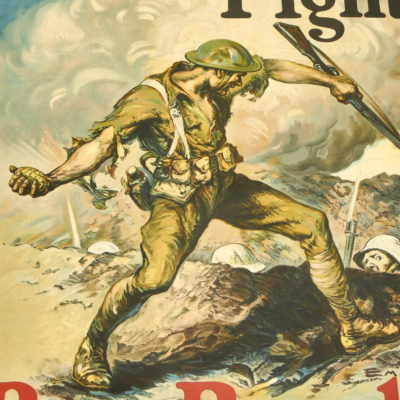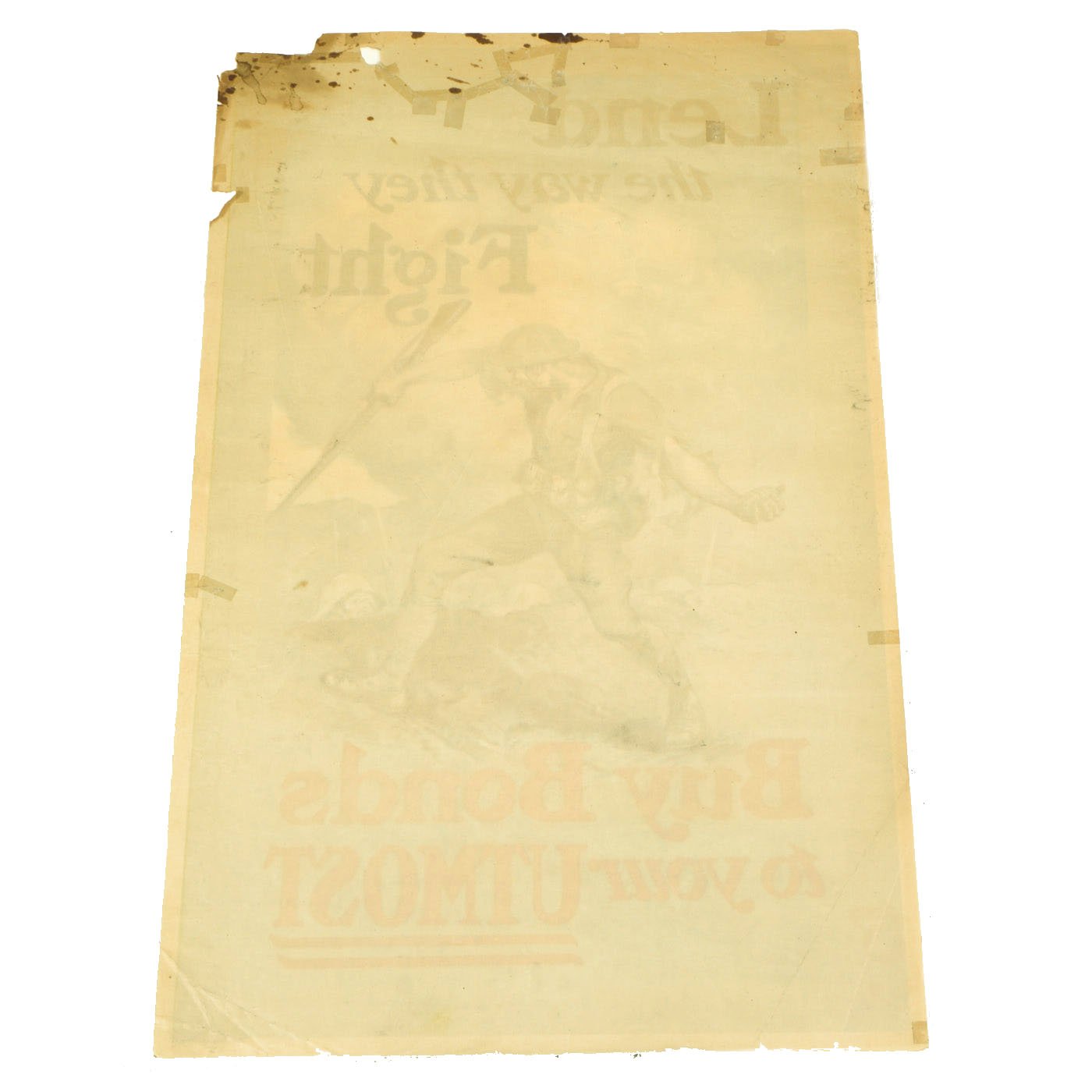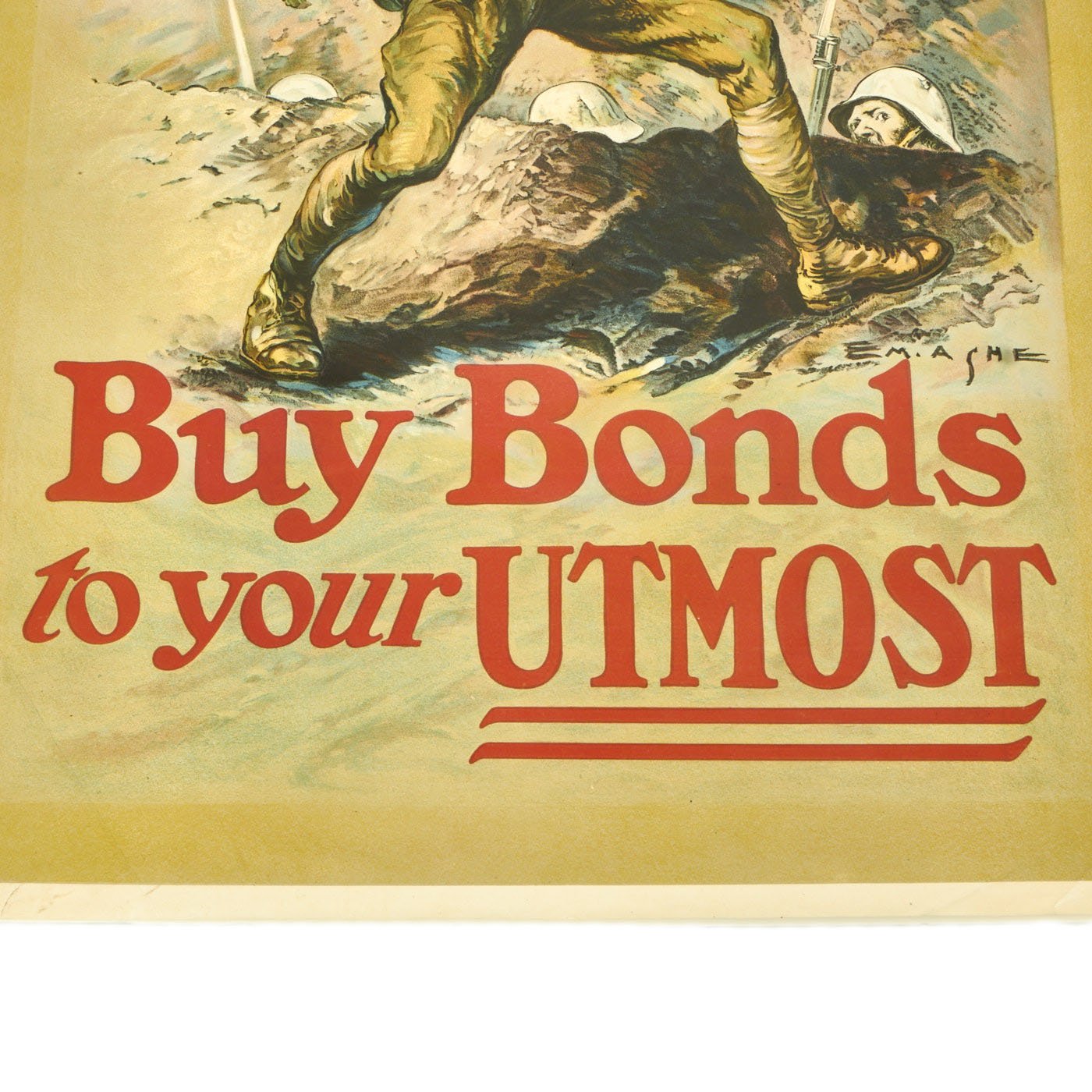 Original Item: Only One Available. This powerful and dramatic WWI poster is the only known war poster designed by the newspaper correspondent and artist Edmund M. Ashe. An American Army doughboy hurls a hand grenade as German soldiers with glistening bayonets look up from the protection of their trench. Smoke billows from something burning in the distance in a hellish war scene adding emphasis to the poster’s message to “Lend As They Fight – Buy War Bonds To Your UTMOST!”. The lower margin indicates “The W.F. Powers Co. Litho, N.Y.”. Measures 40.75" x 26.75"