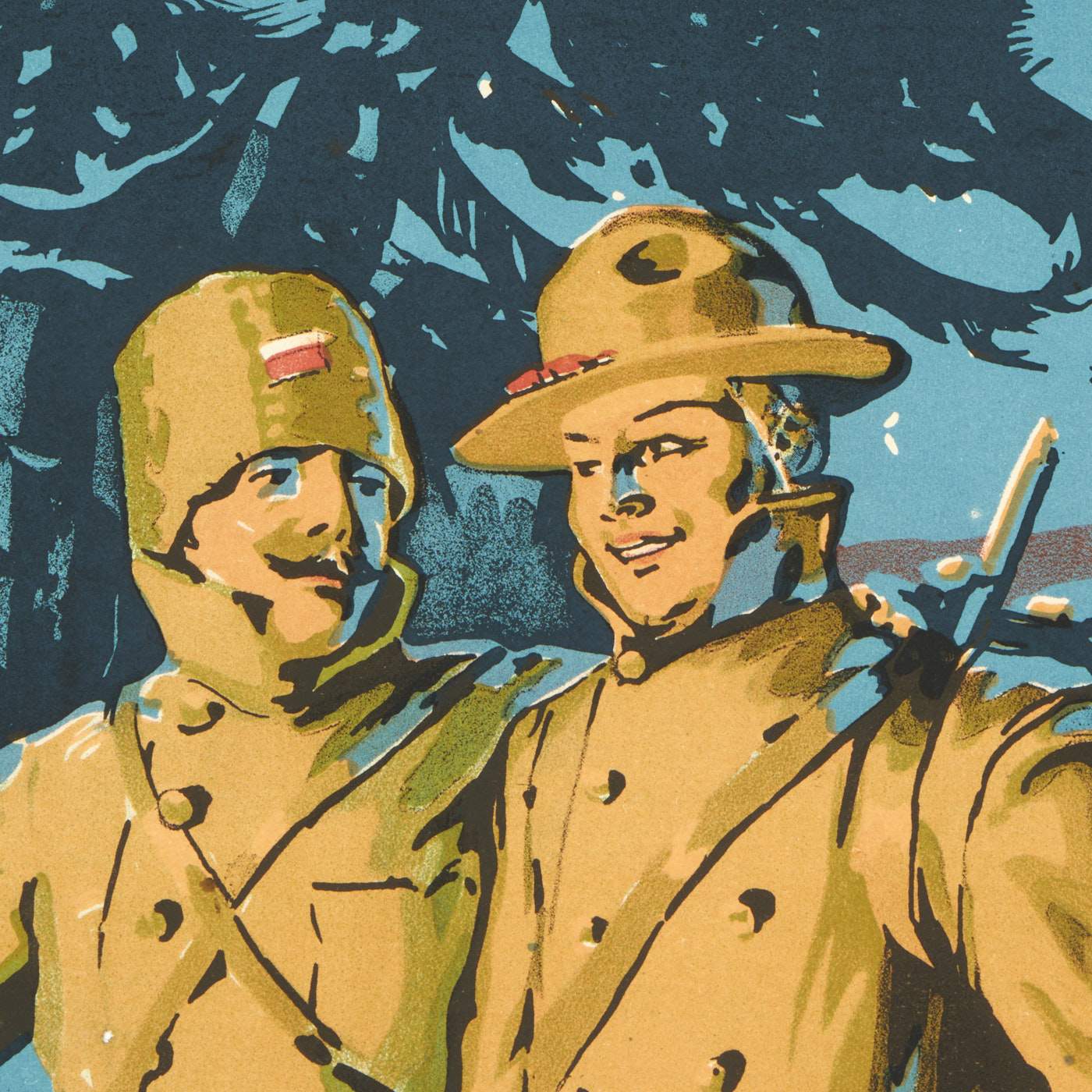 Poster depicts an American soldier and Czech or Slovak soldier walking together in a snowy landscape at night.