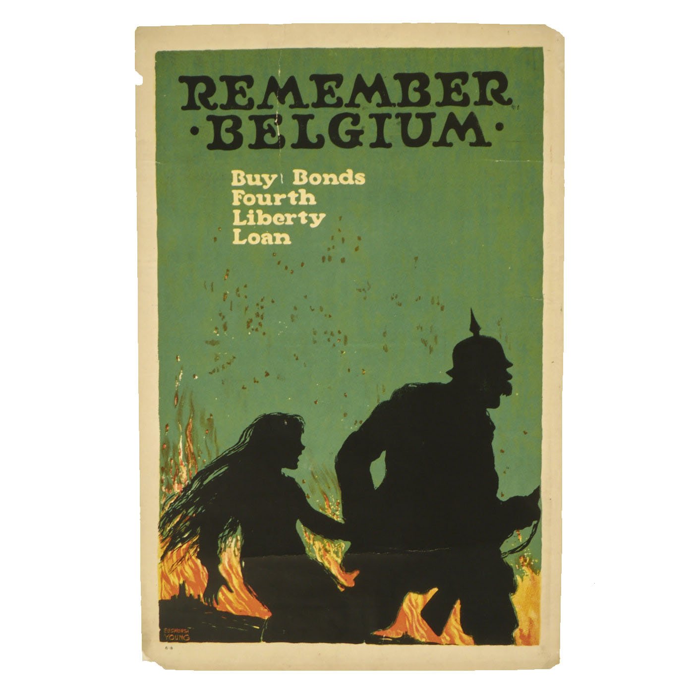Original Items: Only One Available. “Remember Belgium-- Buy Bonds Fourth Liberty Loans” was one of many posters issued by the U.S. government during World War I to encourage support of the war. This poster specifically ignited a multitude of emotions and outrage towards the Germans. The statement “Remember Belgium” was first used in England but was soon also used by the Americans. According to the Imperial War Museum, “In Remember Belgium, the artist uses the alleged atrocities committed by Germans in 1914 to generate sympathy for the Belgians and thereby encourage Americans to invest in war savings.” The Allied countries painted Belgium as a small innocent country that had been occupied and horribly treated by Germany. The U.S. and its allies wanted to paint this picture of the Germans in order to receive more support for the war through bonds or Liberty Loans. Liberty Loans were bonds that the Government sold so they could keep up with the expenses of war. These were sold back to the Government after the war.