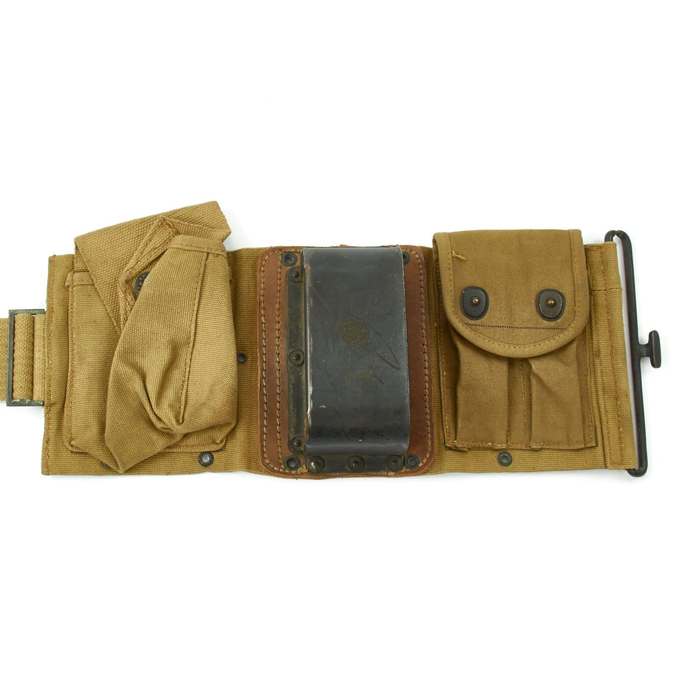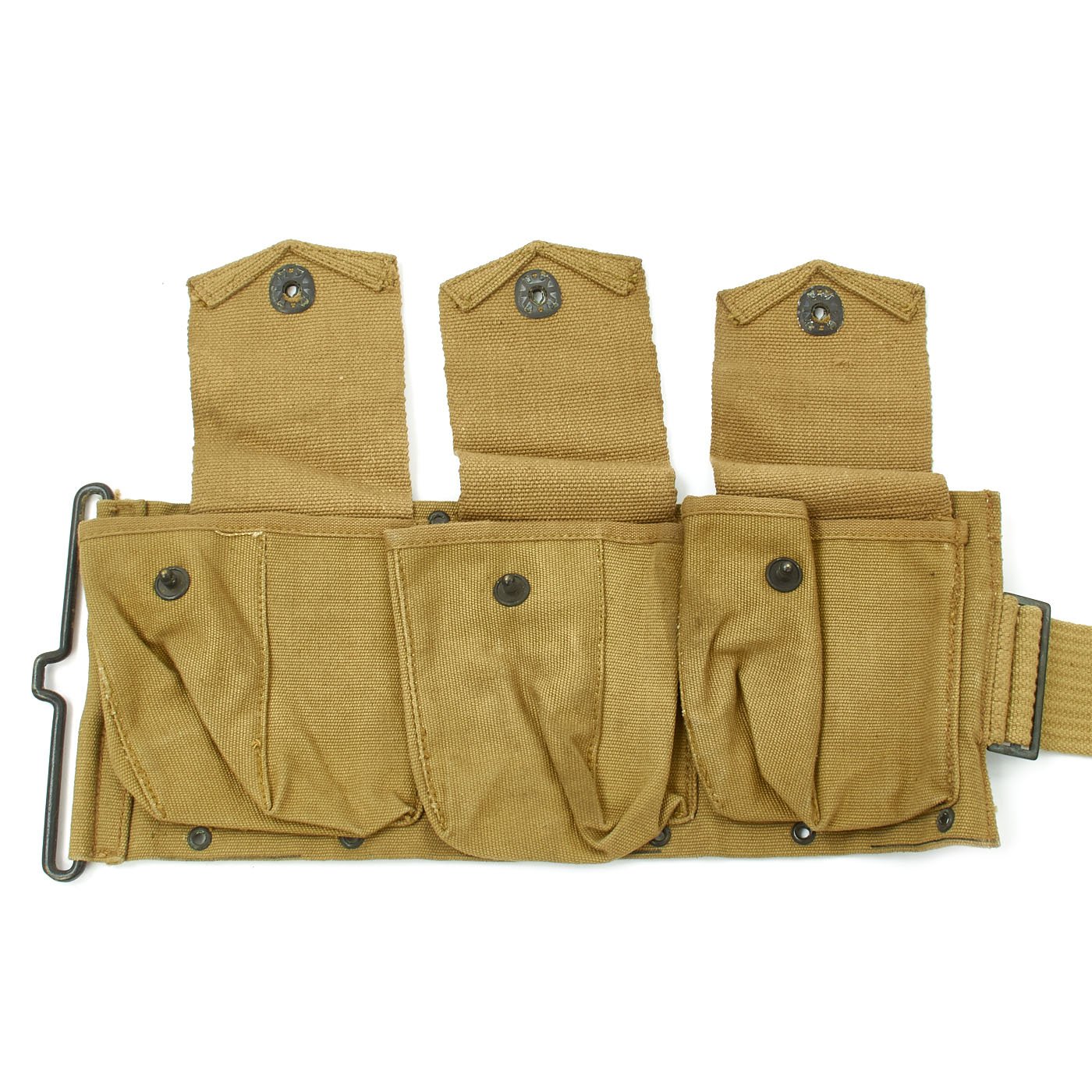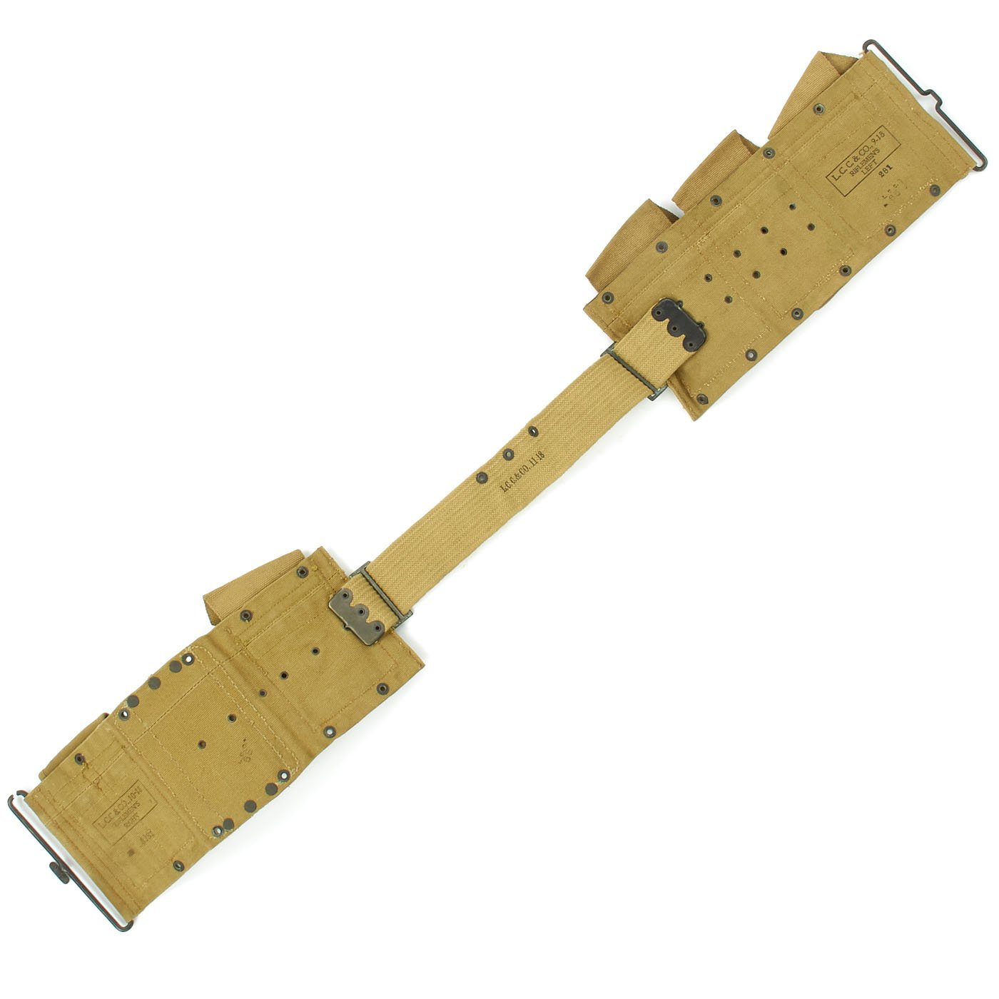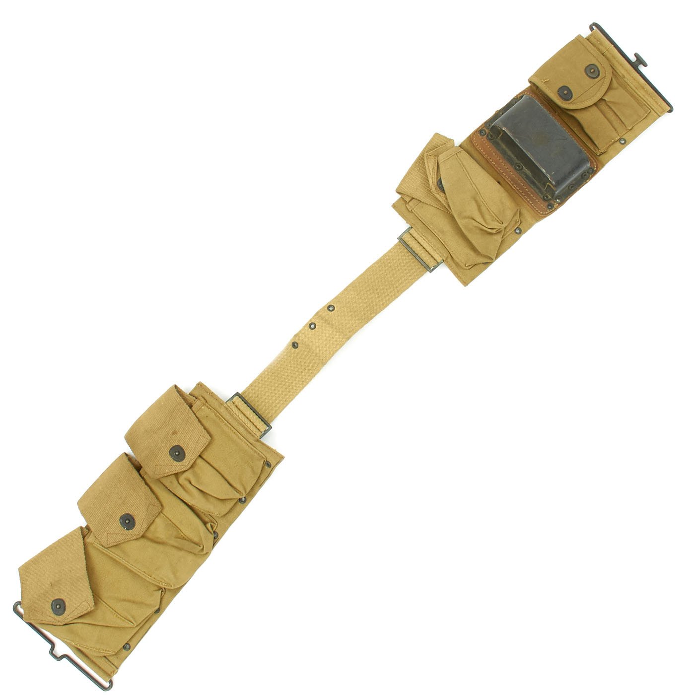 The Light Brownings used 20 round magazines and special accouterments were manufactured to carry the gunner's ammunition. This is the standard belt used by Light Browning gunners, manufactured by the Long Company in May 1918. The metal cup seen between the BAR magazine pocket and the pistol magazine pocket was used to steady the BAR when fired from the hip. The butt stock of the BAR was placed inside the cup when the BAR was fired. The cup was found to be impractical and many belts were modified by removal of the cup.