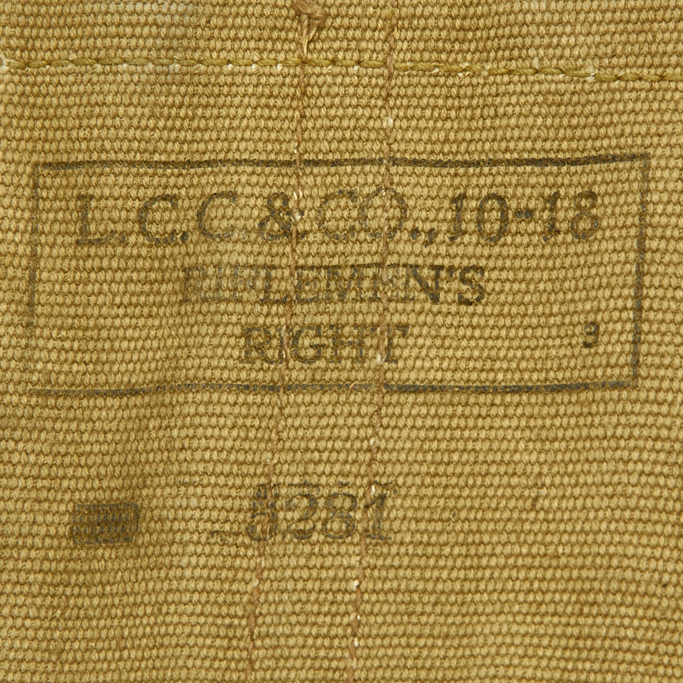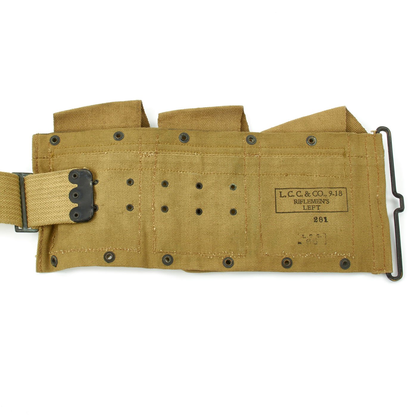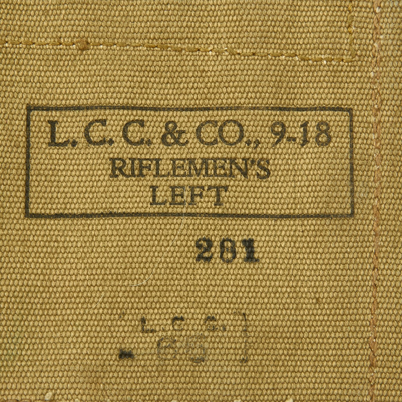 The pouches and belt are all maker marked L.C.C. & CO., for L.C. Chase Co. of Watertown, Massachusetts, and have 1918 dates after this. The two pouches also indicate which is the left pouch, and which is the right. There also looks to be an inspection stamp of L.C.C. / 65 on both pouches.