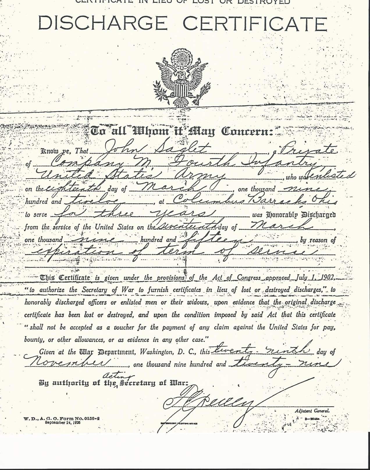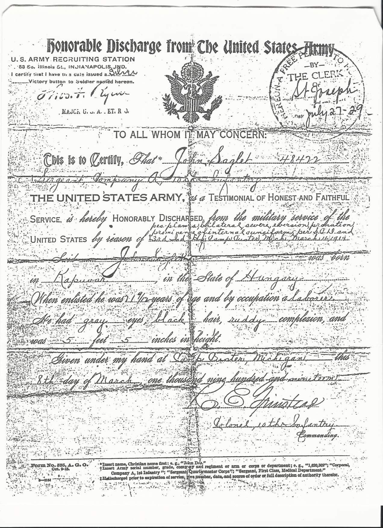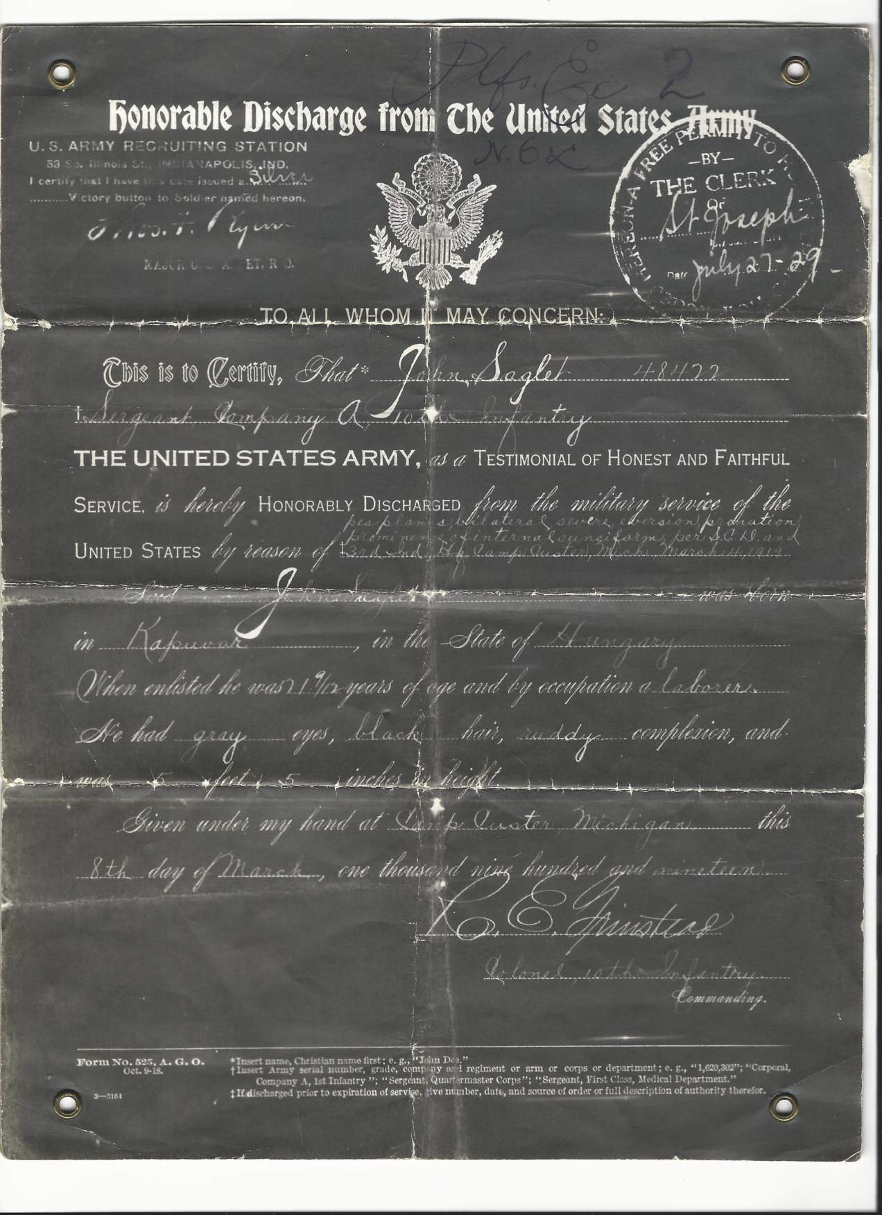 - Original Honorable Discharge dated March 8th, 1919.