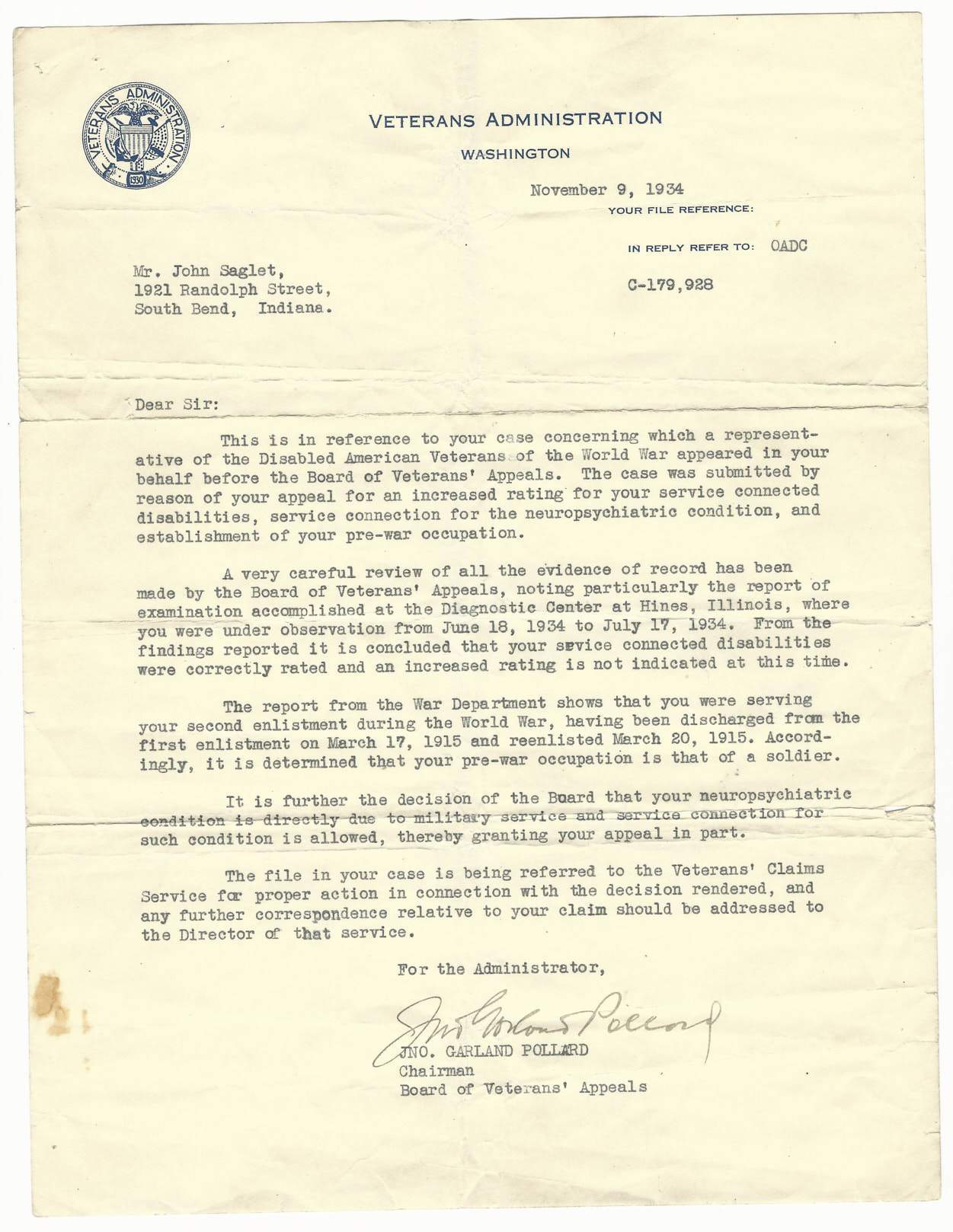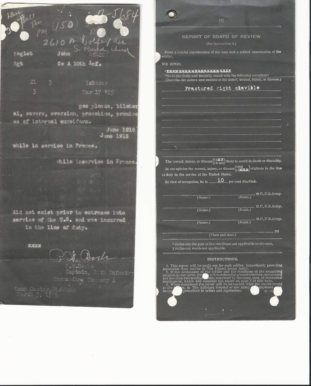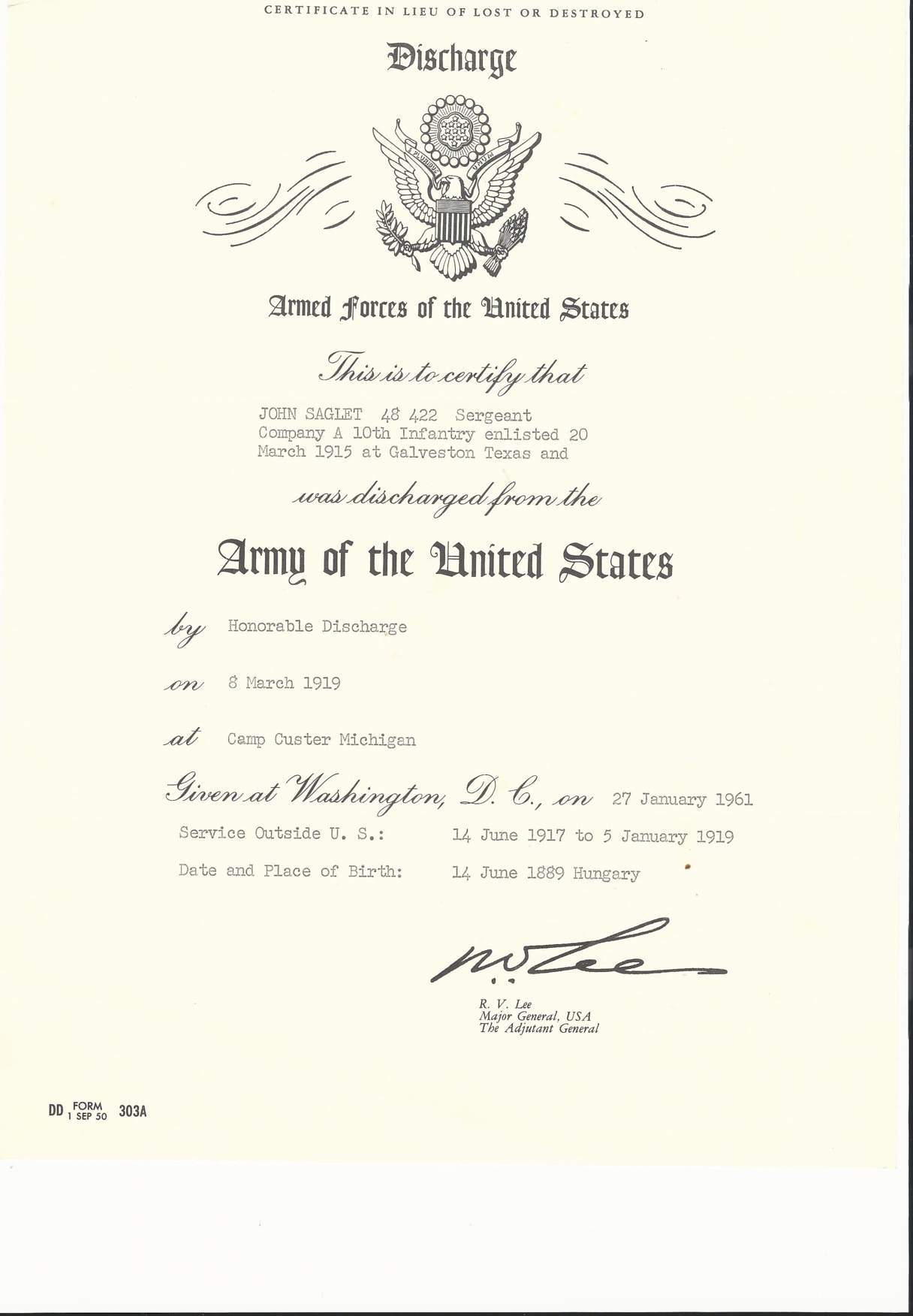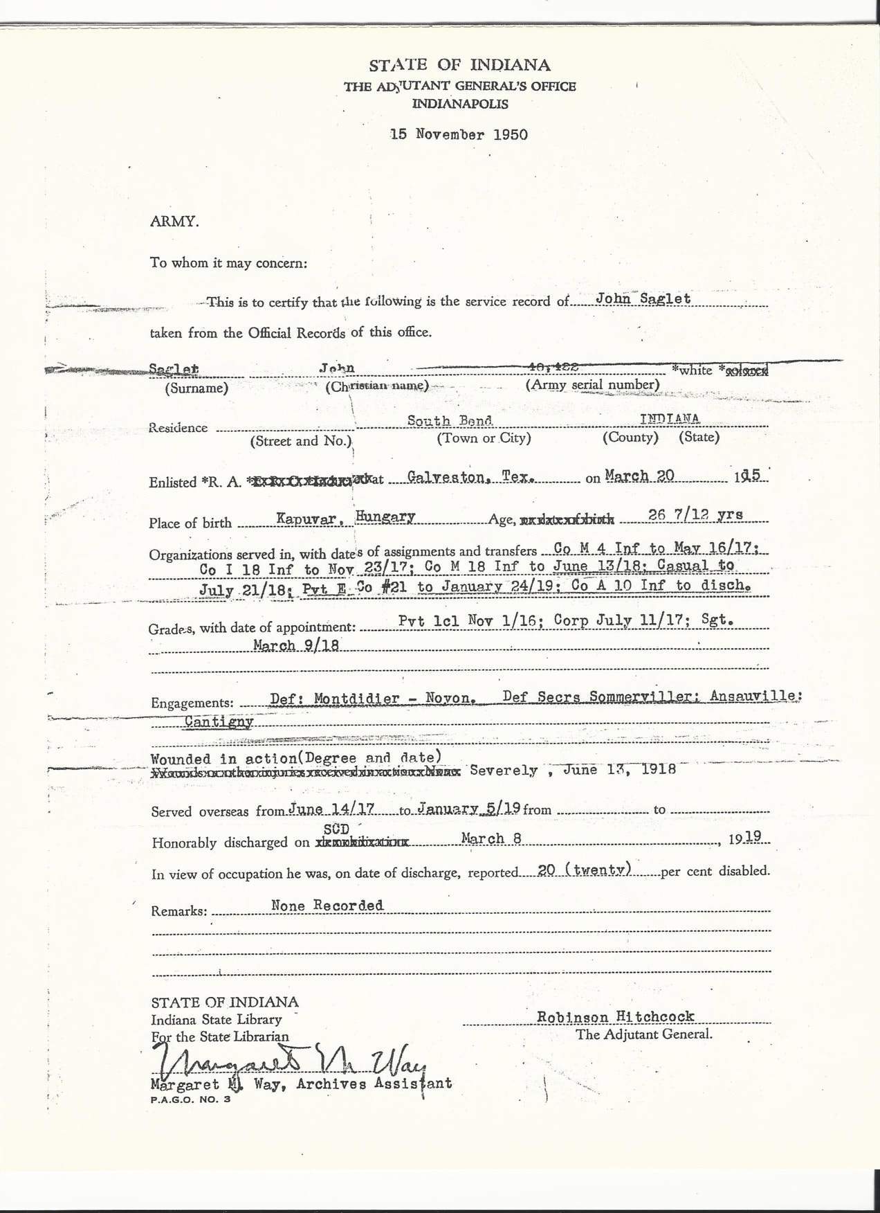 - Original Honorable Discharge dated March 8th, 1919.