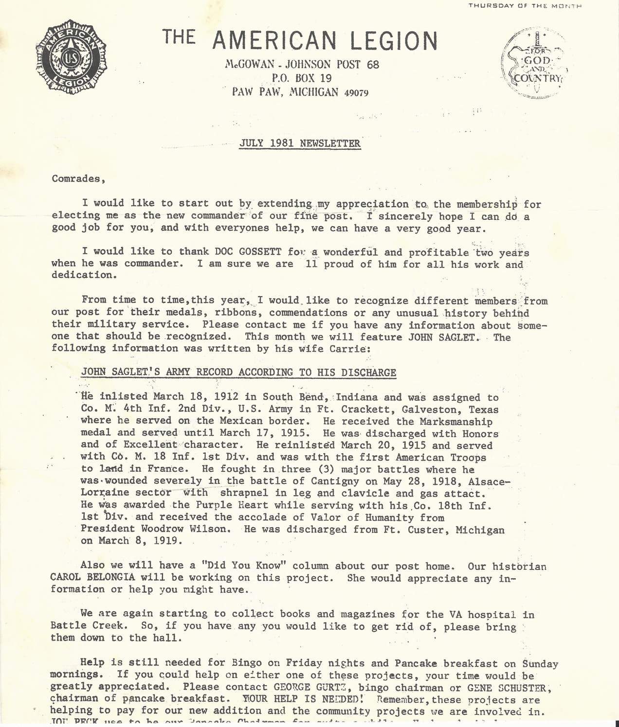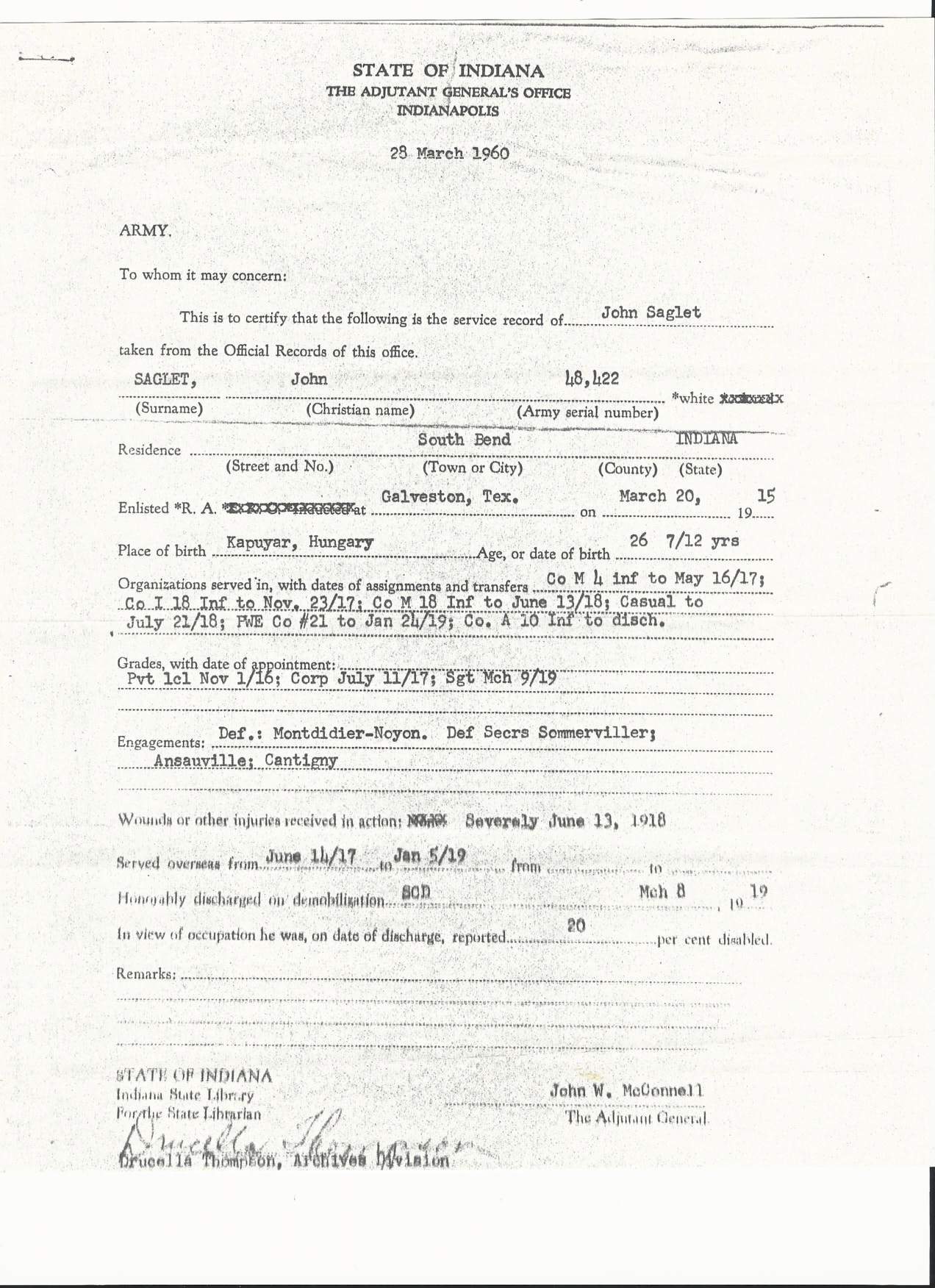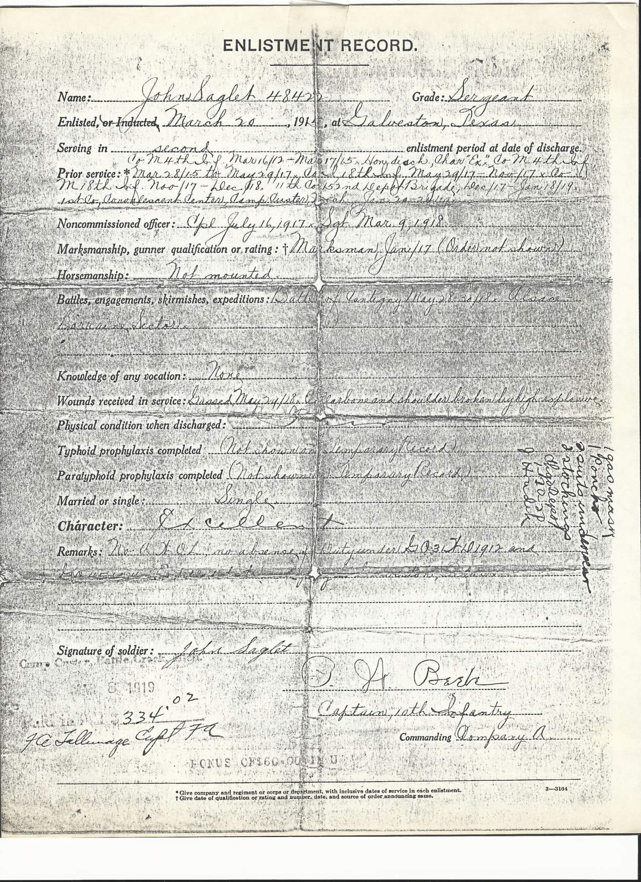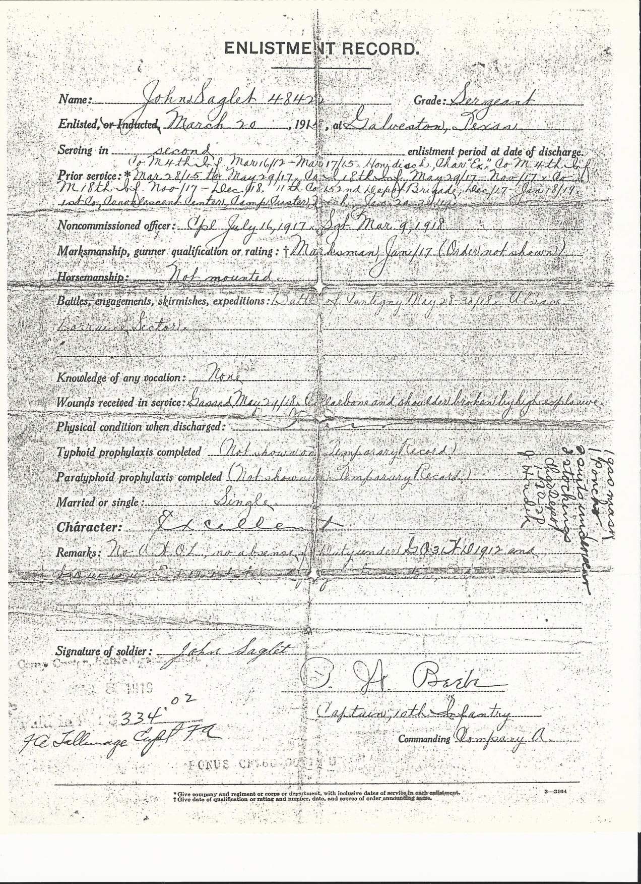He enlisted on March 18, 1912 at Columbus Barracks, Ohio and was discharged on March 17, 1915 at Galveston, Texas. During this period of time he served with Company A of the 10th Infantry Regiment of the 2nd Division in the Mexican Border War. He re-enlisted on the 20th of the same year. He was 26 years old at the time. He served overseas from June 14th, 1917 to January 5. 1919. During this period of time, he was assigned to Company M 18th Infantry Regiment, 1st Infantry Division and fought in the engagements at Montdidier-Noyon; Aisne-Marne; St. Mihiel; Meuse-Argonne; Lorraine 1917; Lorraine 1918; Picardy 1918 . He was severely wounded twice and gassed once. He was discharged at Camp Custer, Michigan on March 8th, 1919.