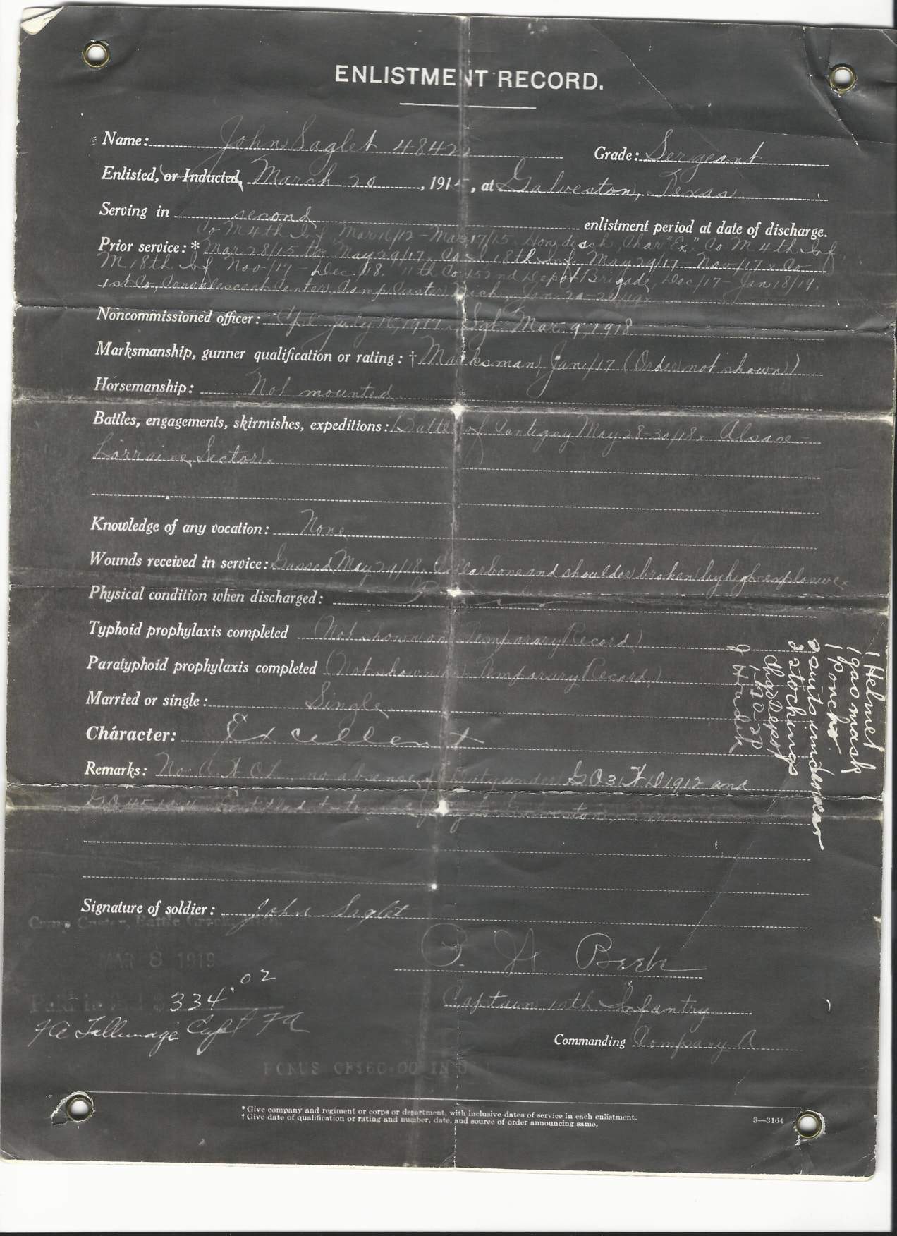 - Original Enlistment Record recorded March 20th, 1919. This document lists all his battles, training, etc. Incredible!
