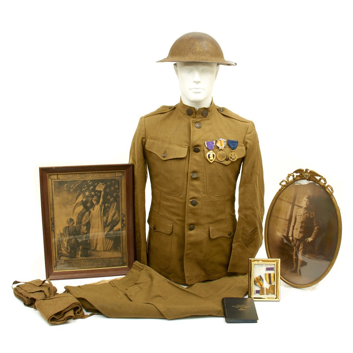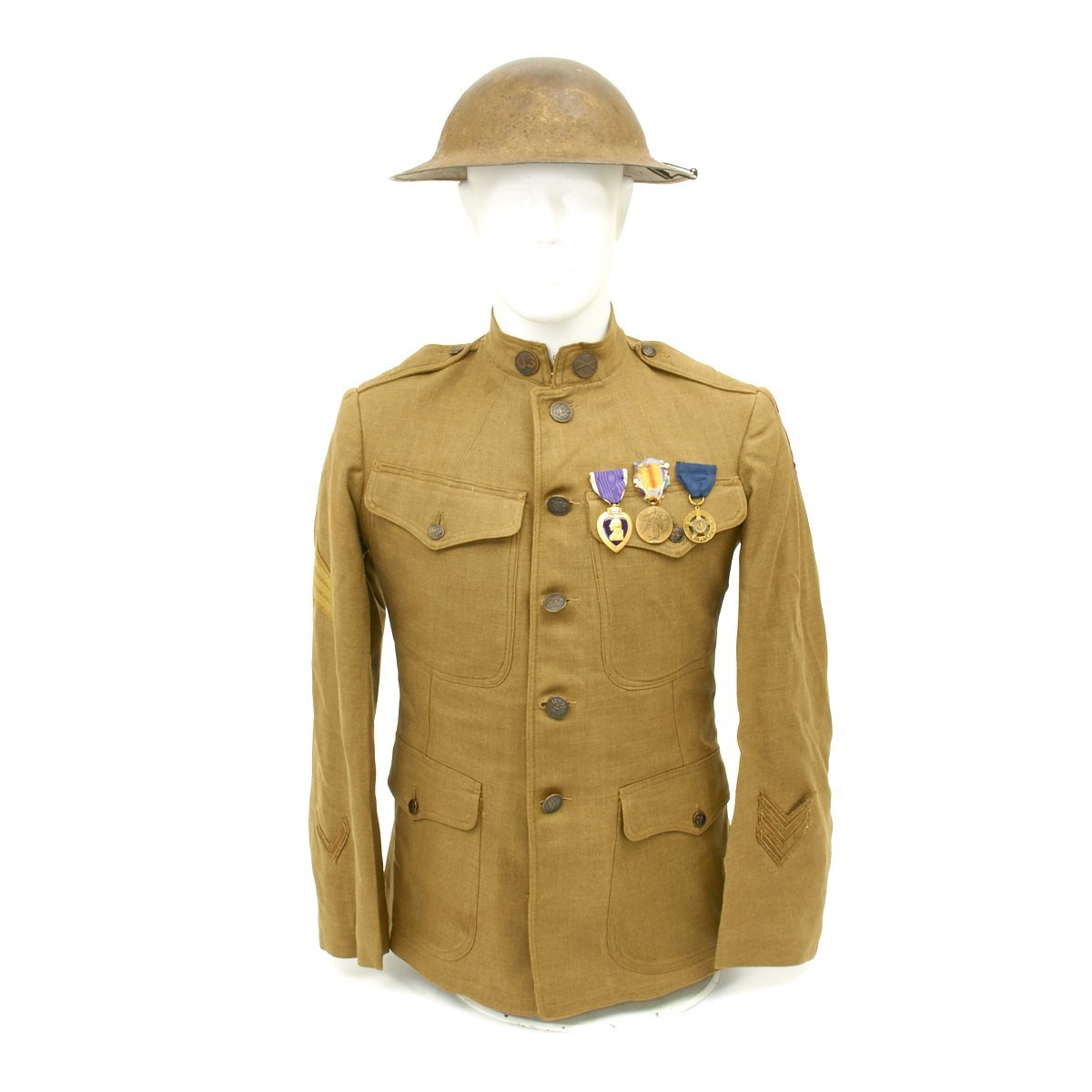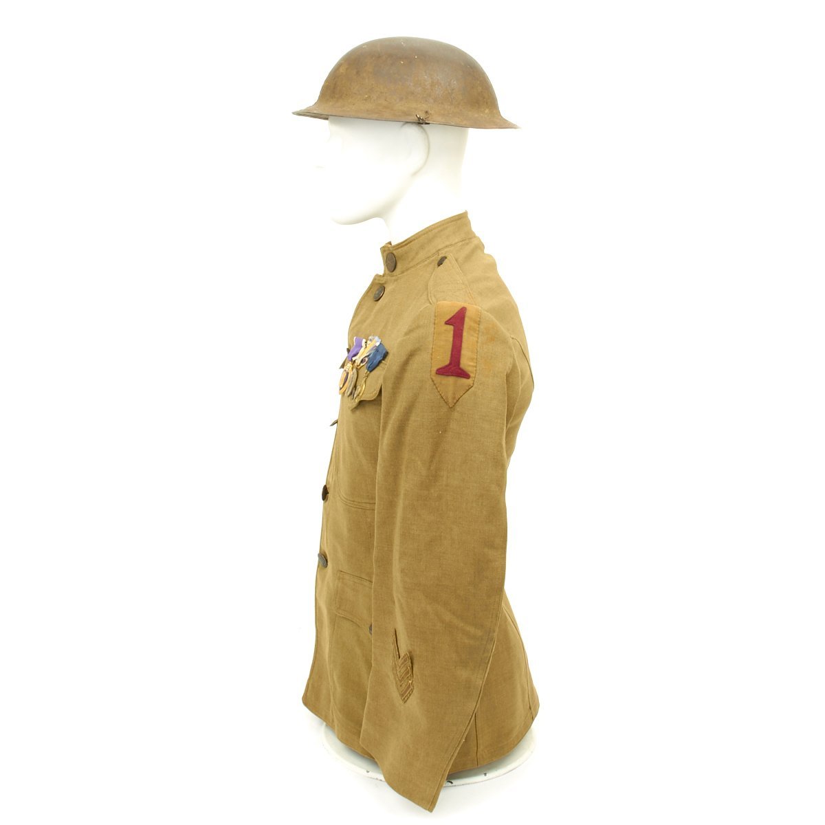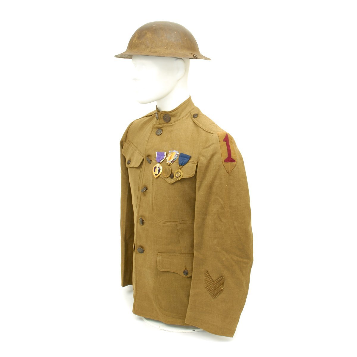 - 1917 Wool uniform tunic with fantastic rare 1st Infantry Division insignia patch to the left shoulder, Infantry collar device, Seargent chevron and overseas service bars. Engraved named Purple Heart medal, WWI Campaign Medal and WWI DAV (Disabled American Veteran) Legion Medal. Offered in very good condition.