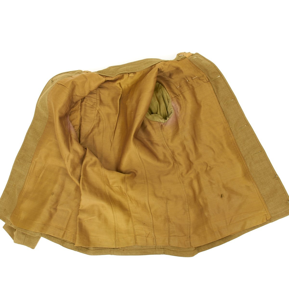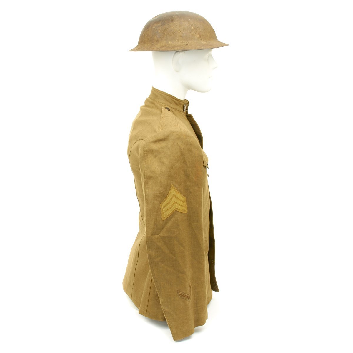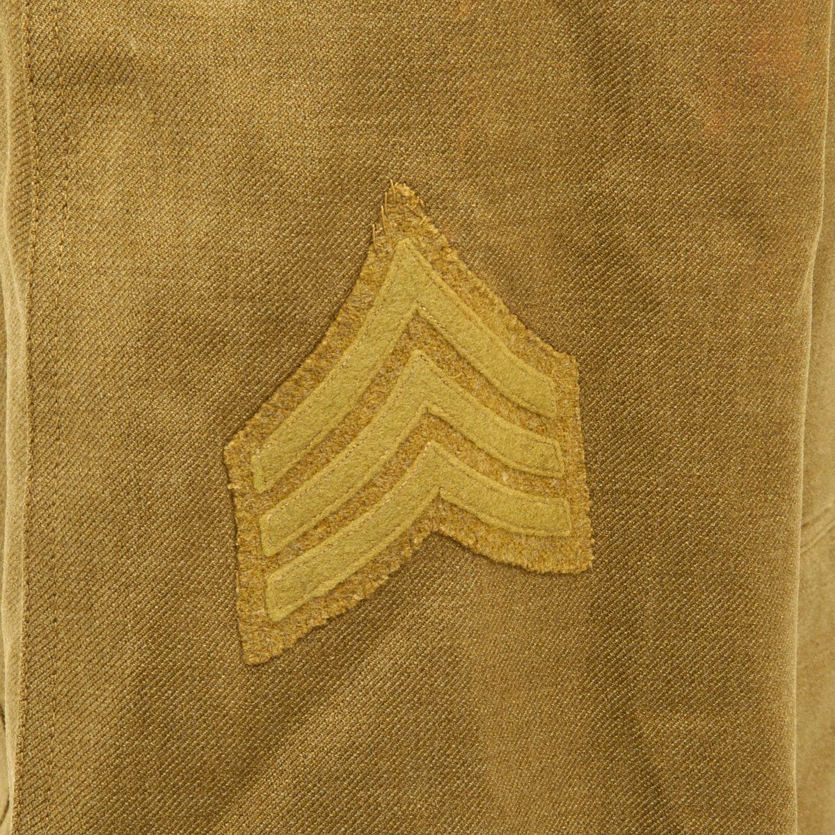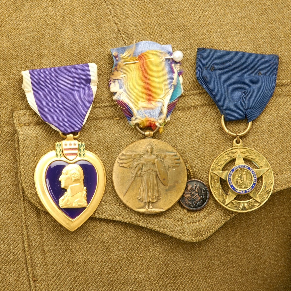 - 1917 Wool uniform tunic with fantastic rare 1st Infantry Division insignia patch to the left shoulder, Infantry collar device, Seargent chevron and overseas service bars. Engraved named Purple Heart medal, WWI Campaign Medal and WWI DAV (Disabled American Veteran) Legion Medal. Offered in very good condition.