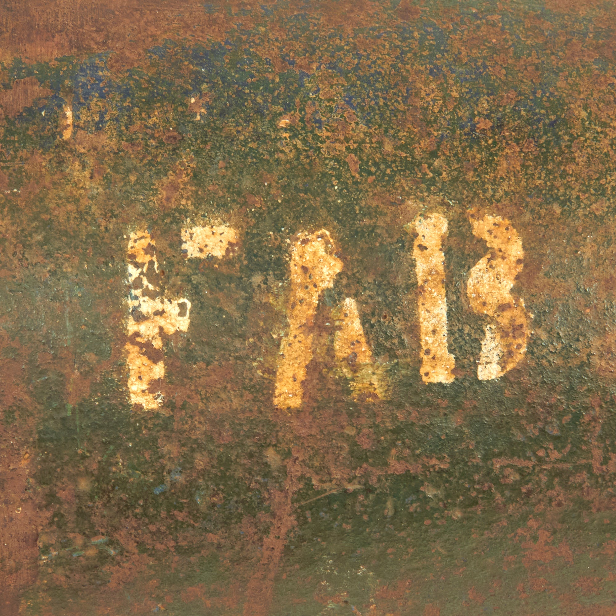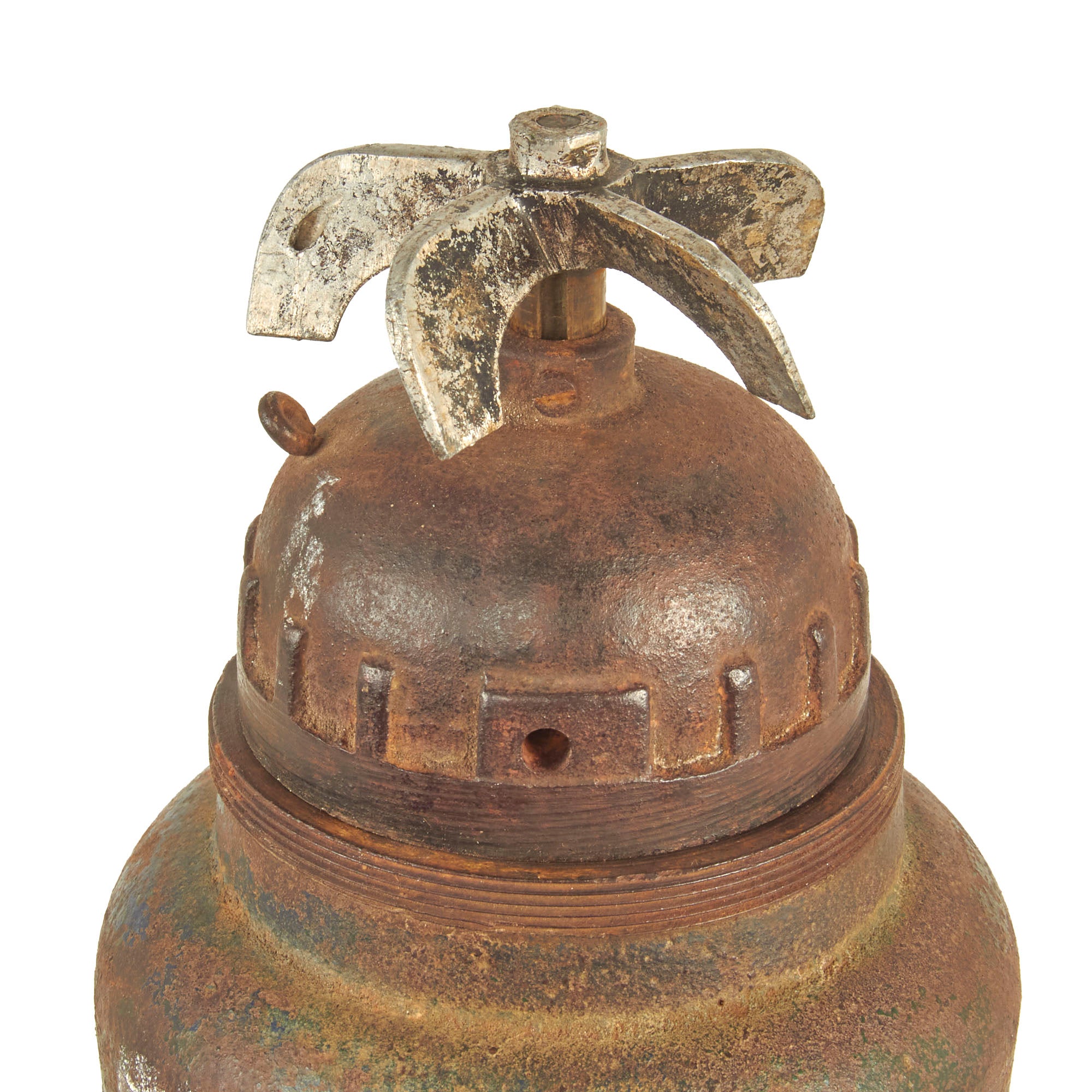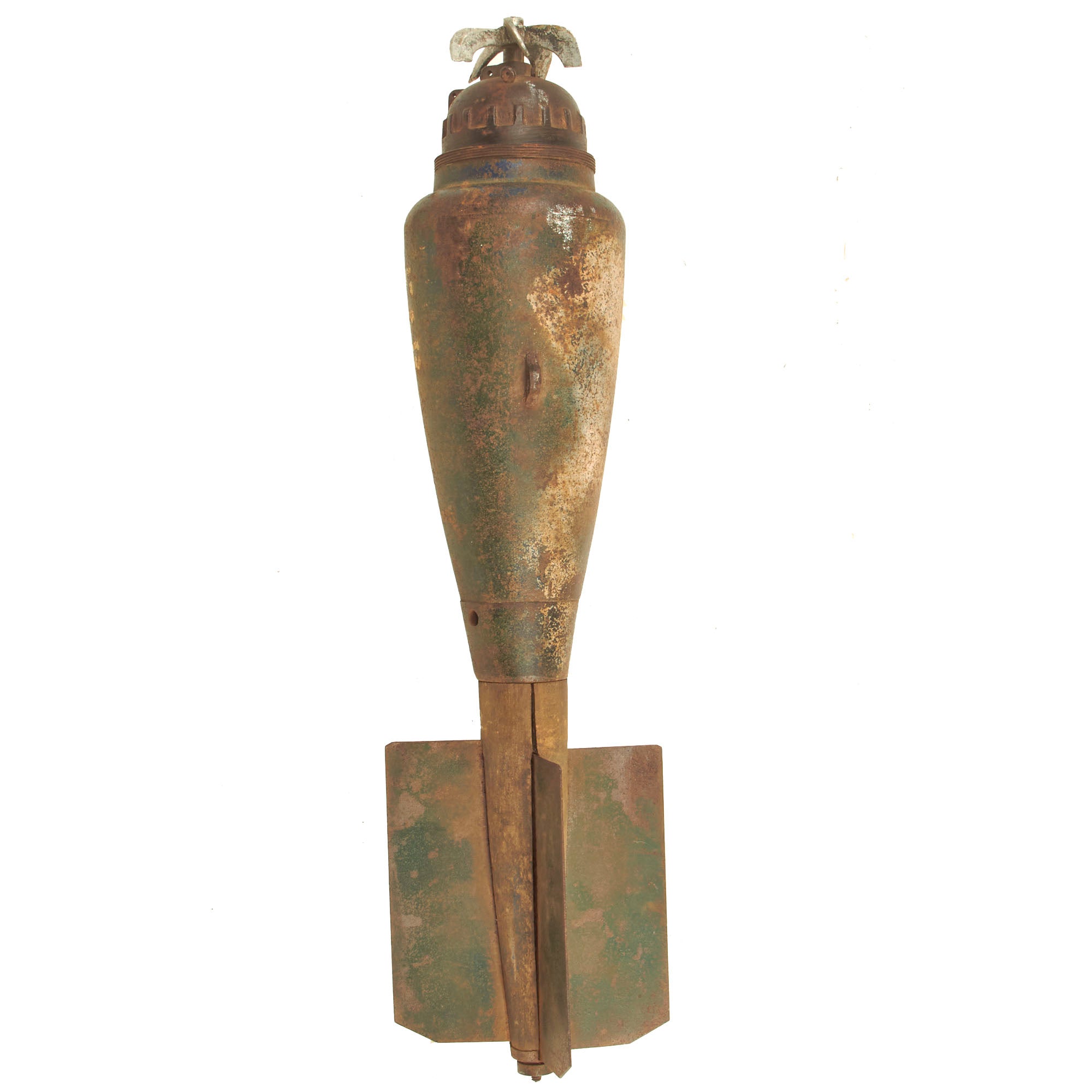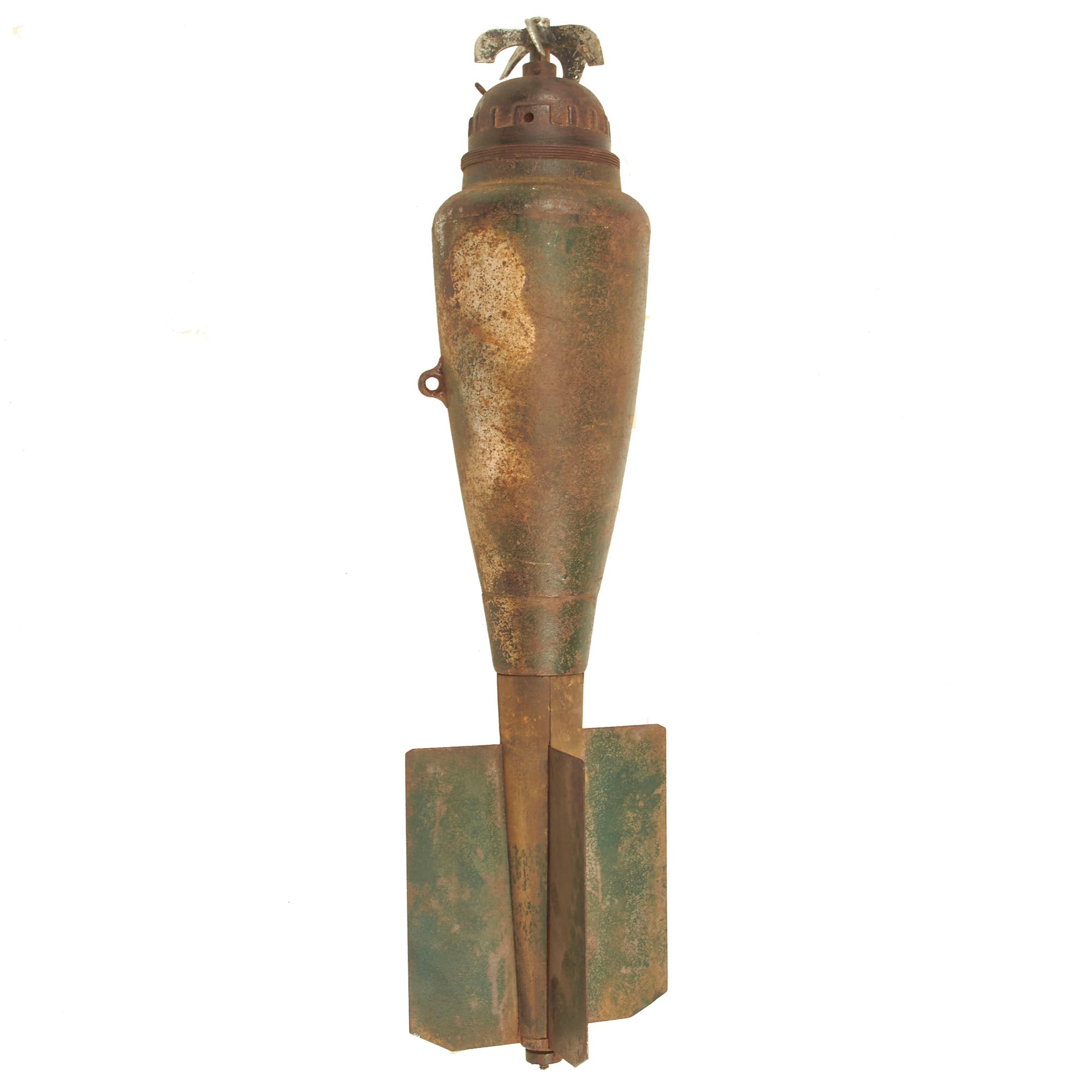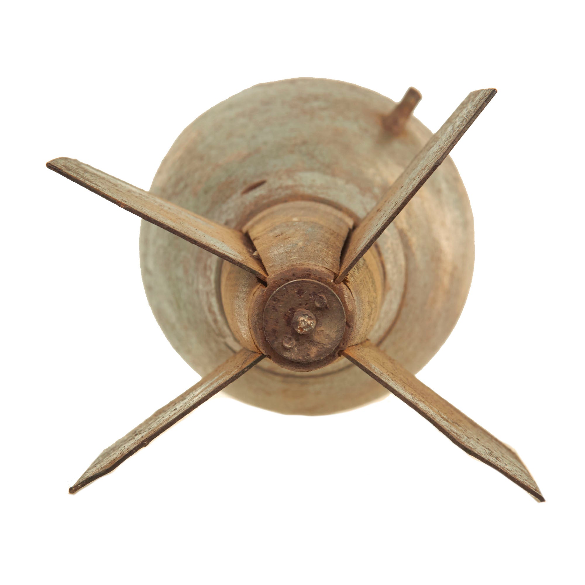 This genuine inert example of the MkII Fragmentation Bomb is offered in very good condition. It still retains the spinner fuse and fins and has been deactivated to BATF specifications. It is marked FAB on the side, which we presume stands for "Fragmentation Aerial Bomb", or something along those lines. The front of the fuse housing can still be removed from the bomb, showing U.S. Ordnance "Crossed Cannon" proofs on both the fuse and the bomb. It still retains the side hanging loop, however the one on the bottom of the bomb has broken off.
