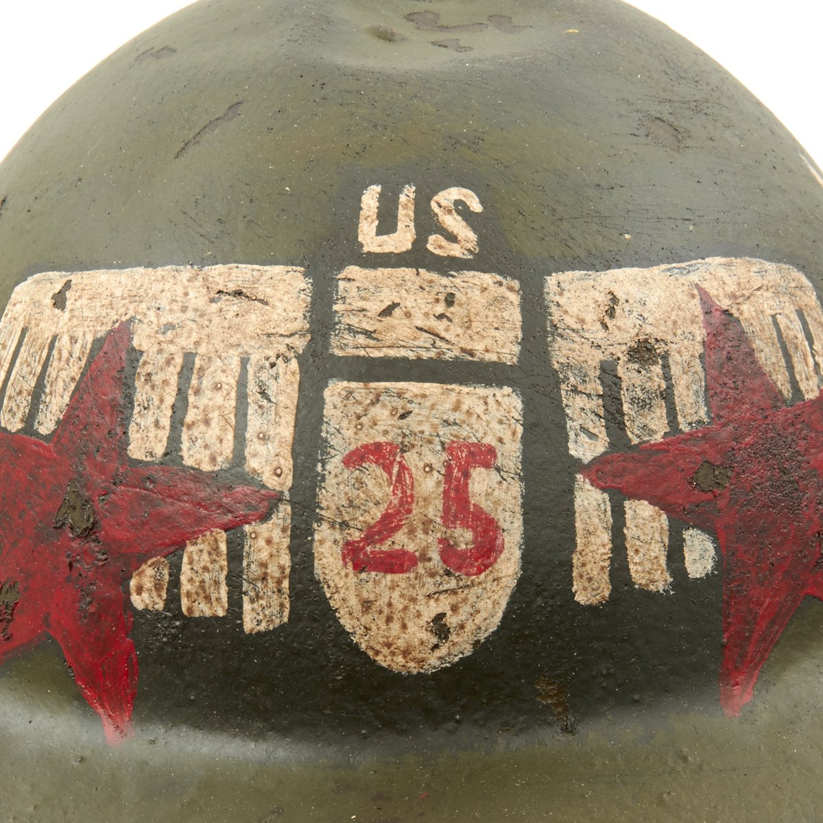 This fine example has been restored with new paint by a master helmet restoration expert. It is a simple camouflage design replicating a documented helmet used by the 25th Aero Squadron during WWI.