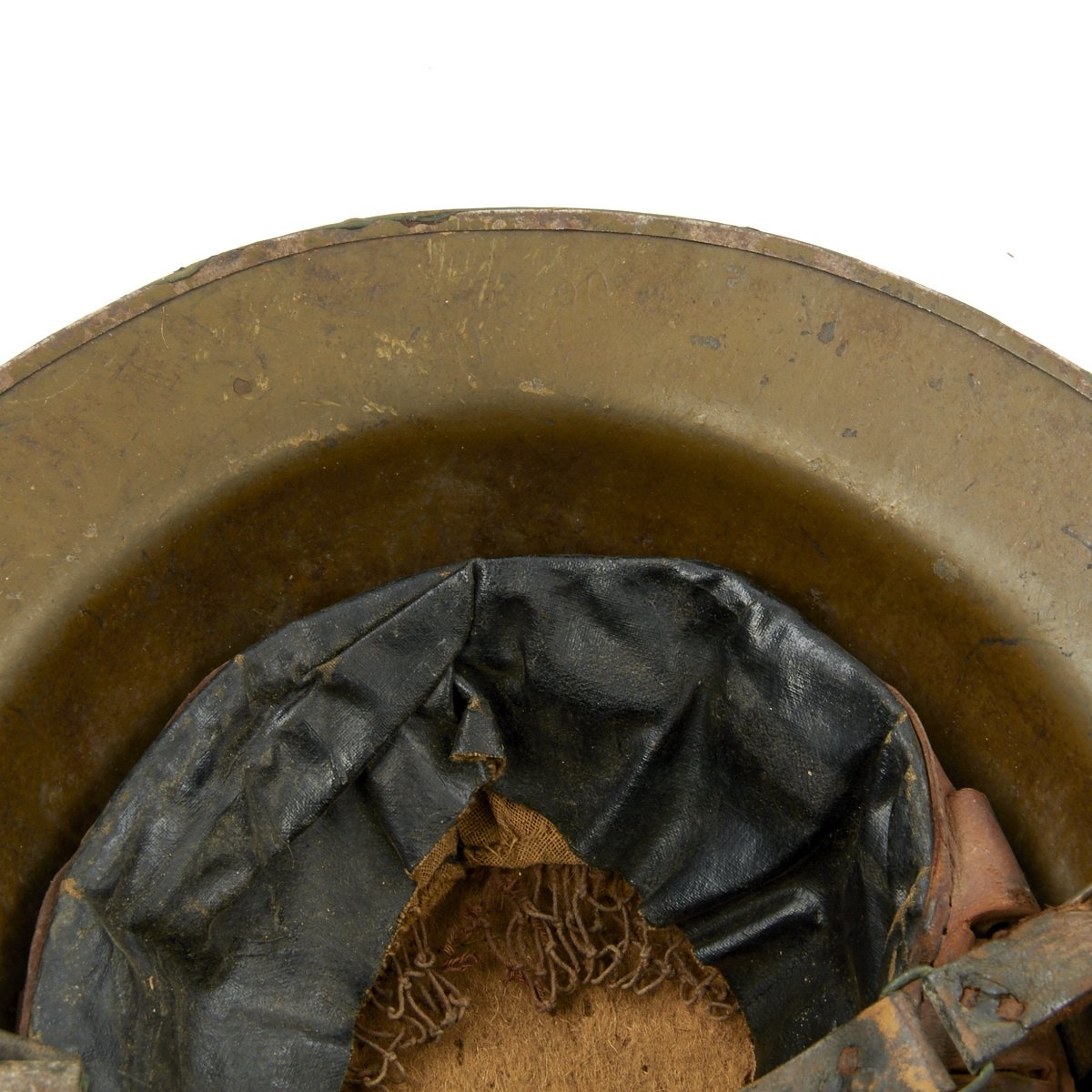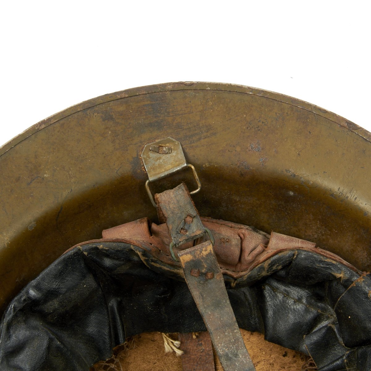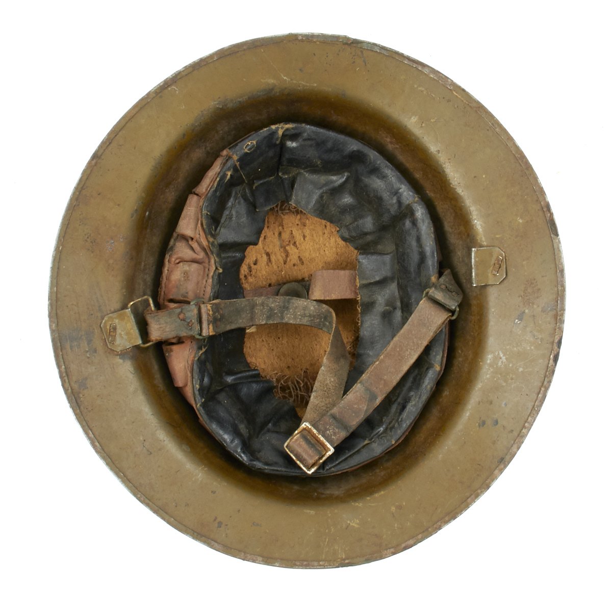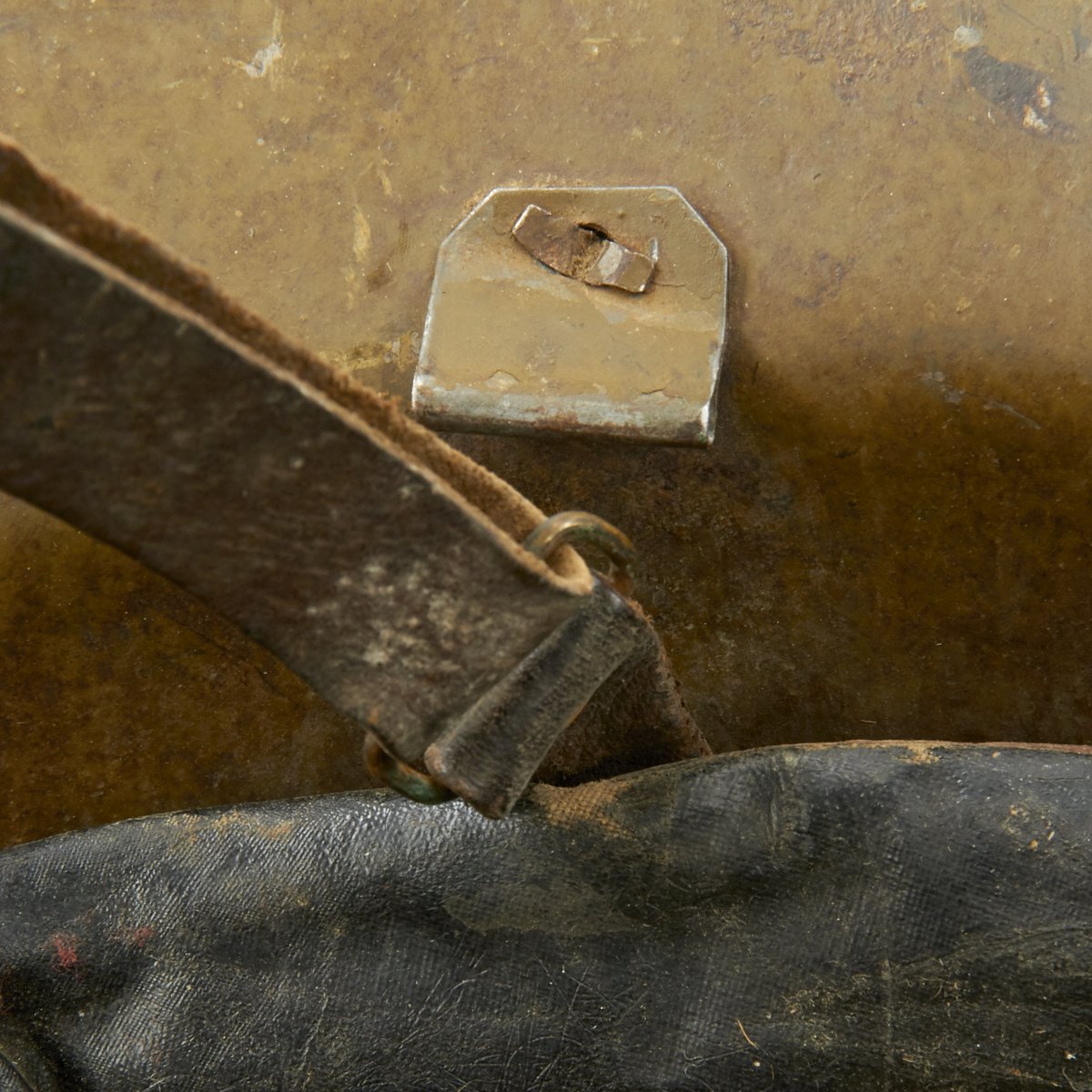 M1917 helmet liners typically show a paper label at the crown and the dome rivet head. The liner is set up as on the British versions, with an oilcloth band and net configuration, attached to a leather strap, riveted to the shell. The chinstrap is leather with steel buckle.