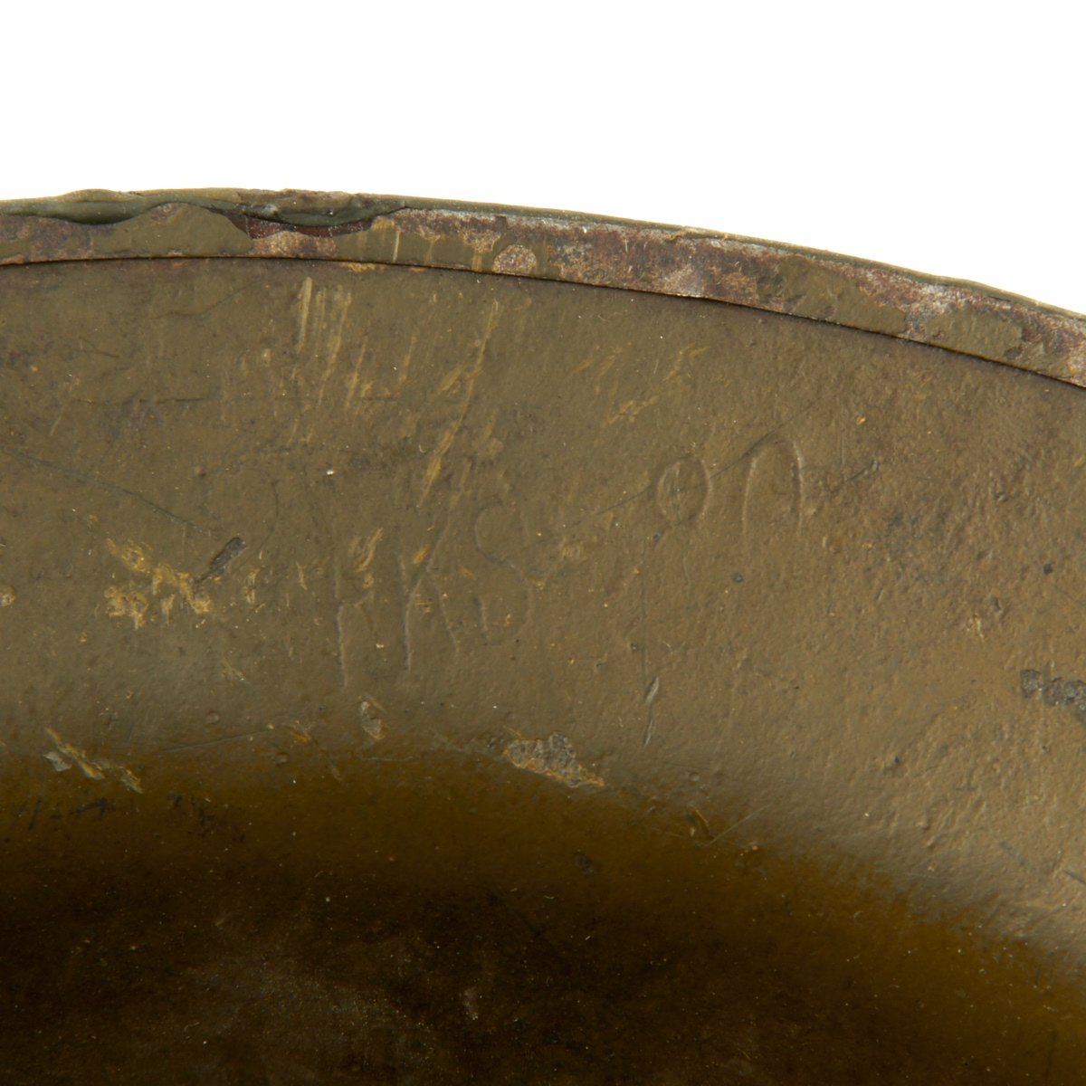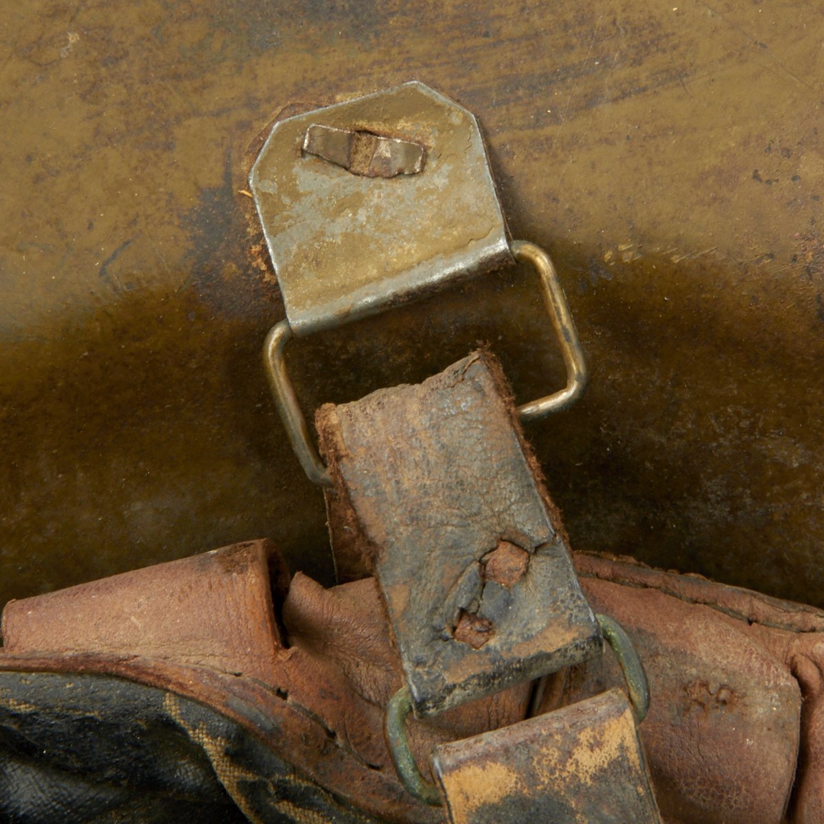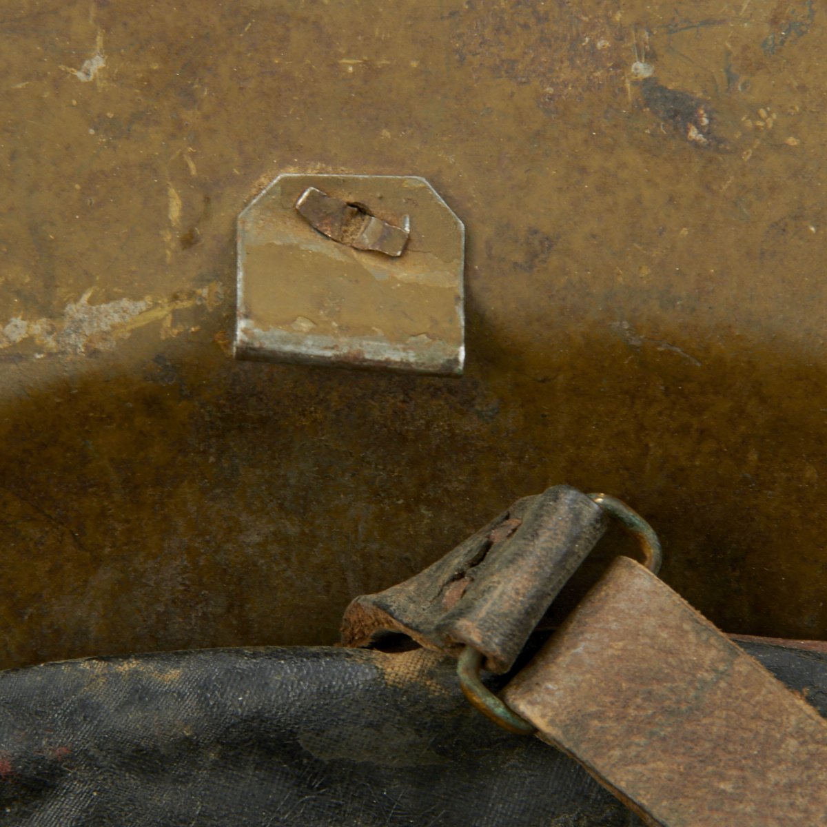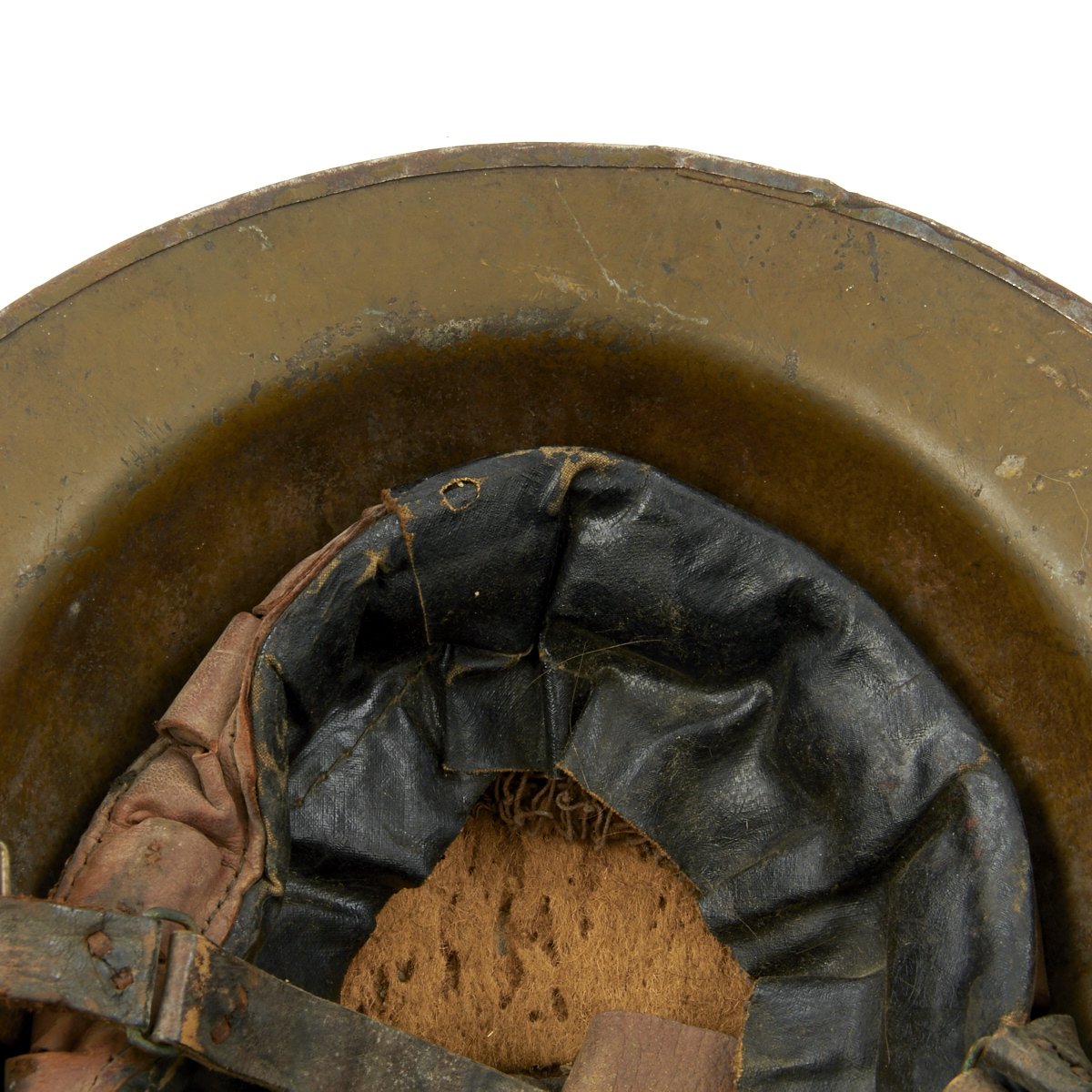 M1917 helmet liners typically show a paper label at the crown and the dome rivet head. The liner is set up as on the British versions, with an oilcloth band and net configuration, attached to a leather strap, riveted to the shell. The chinstrap is leather with steel buckle.