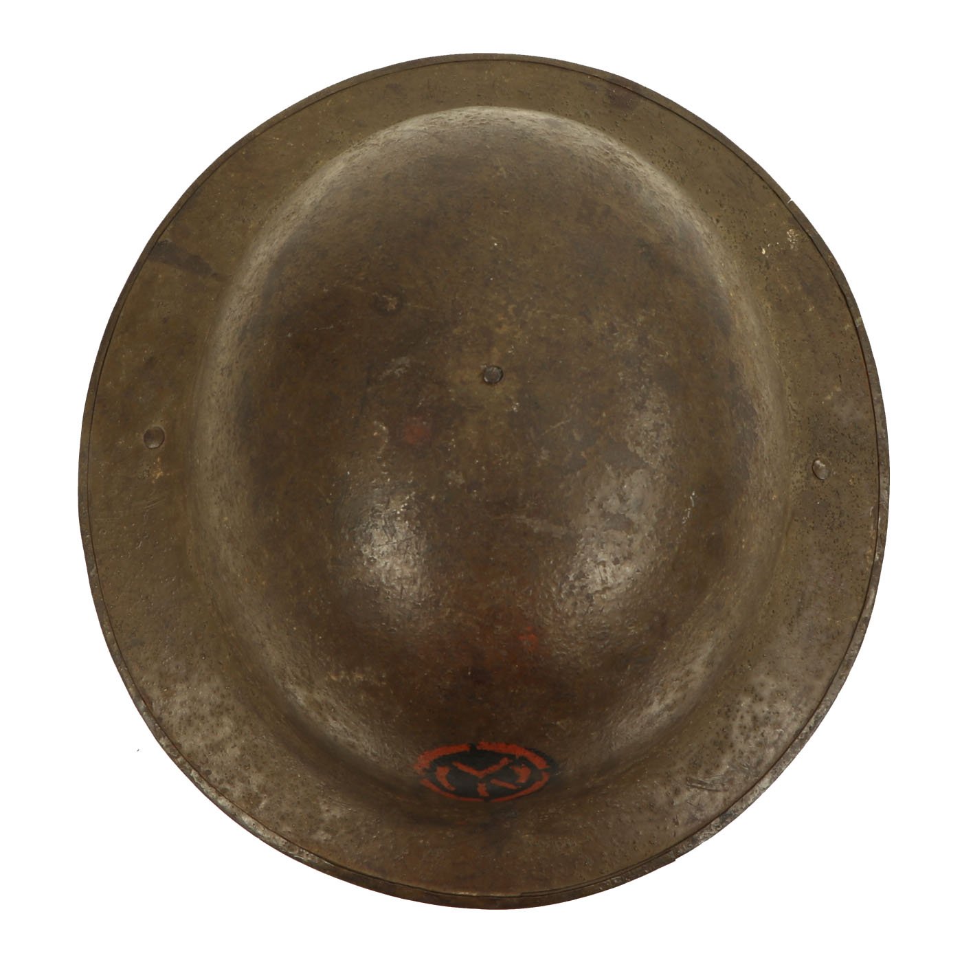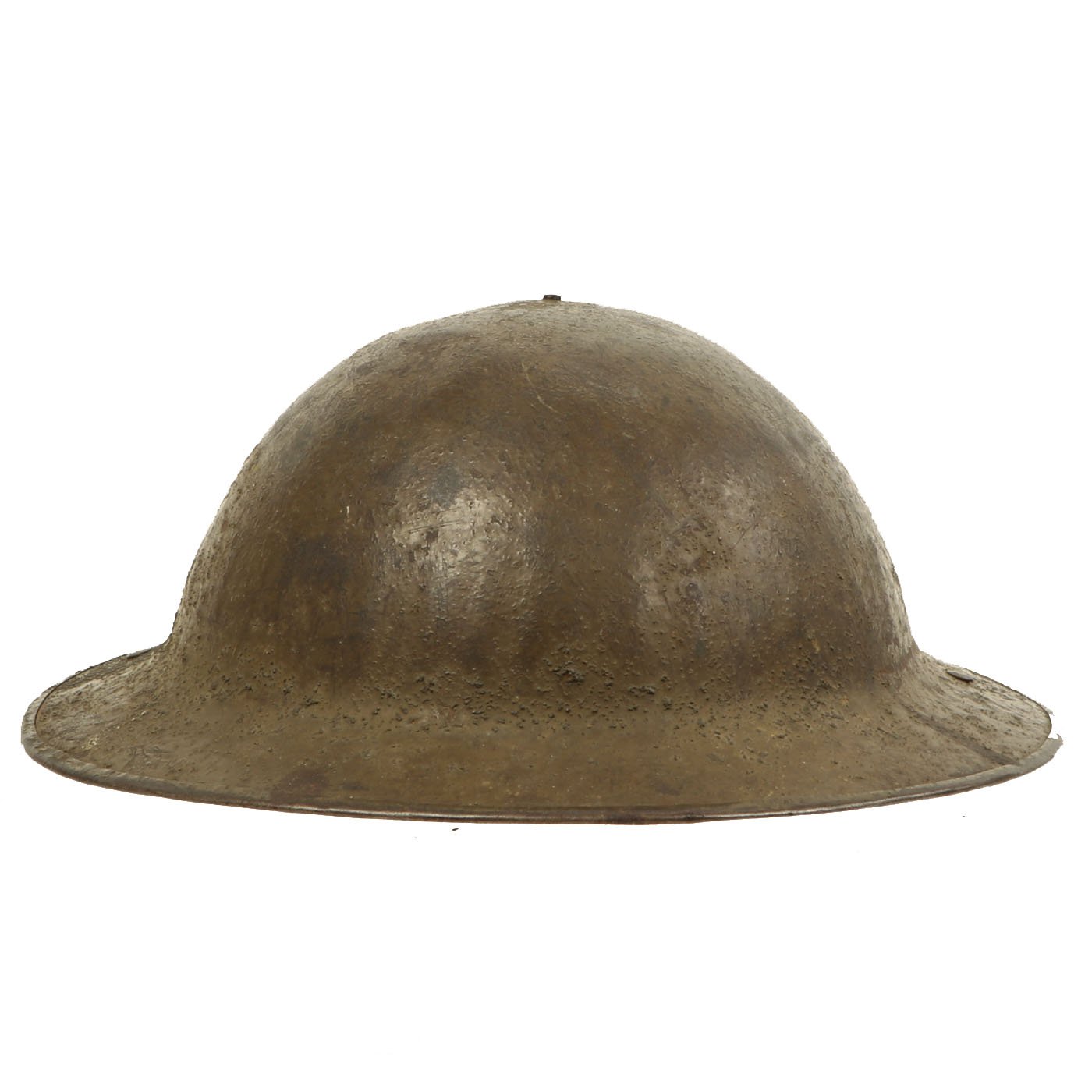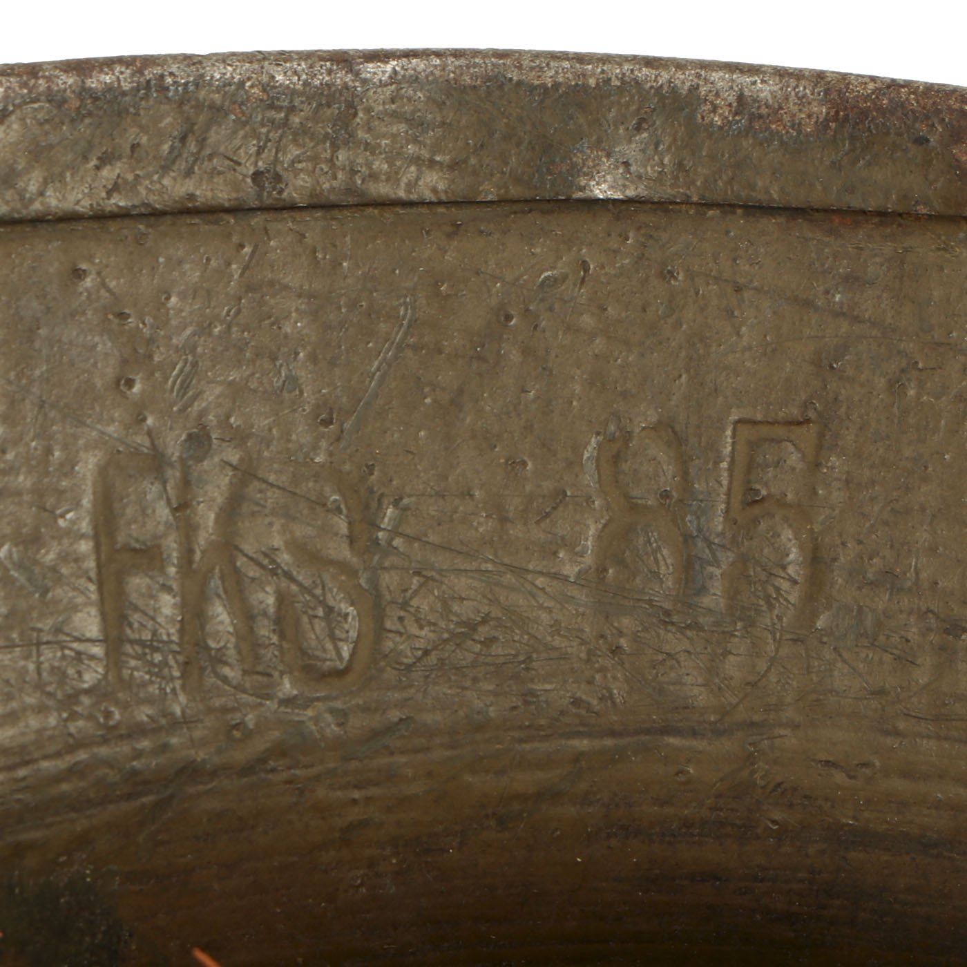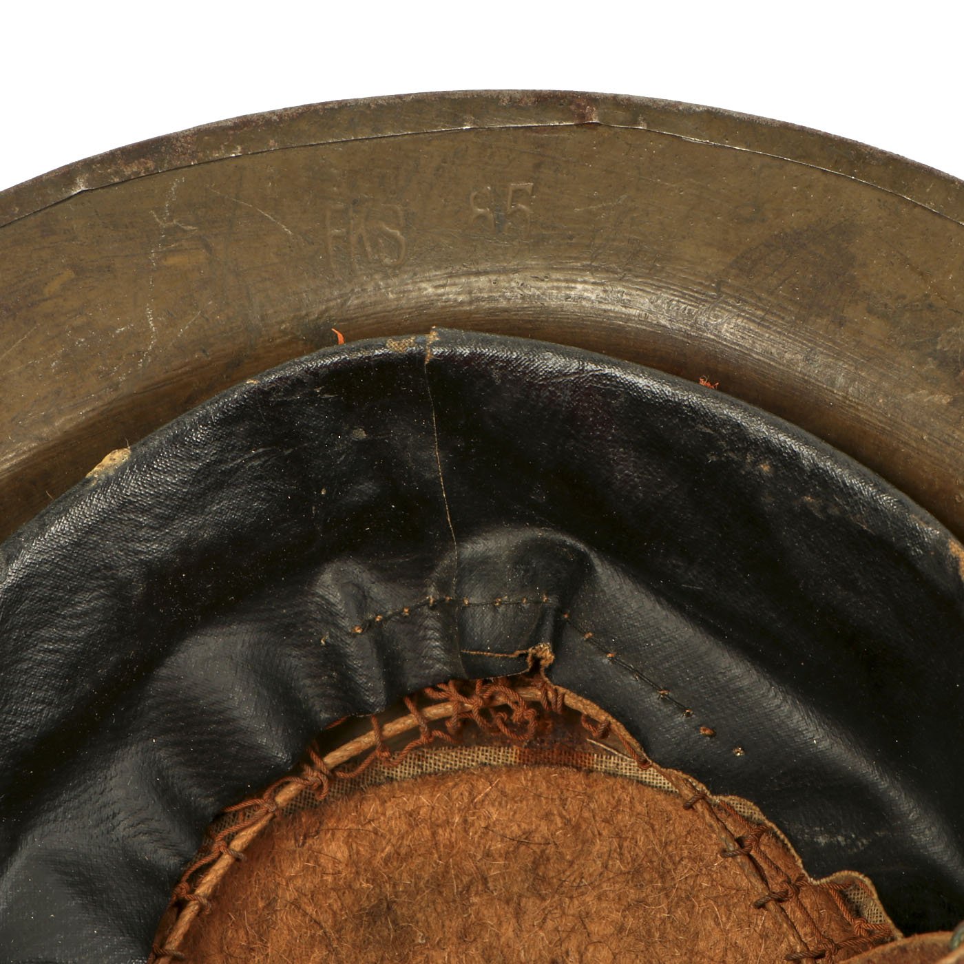 The underside of the rim is stamped FKS 85, indicating that the shell is one of the 400,000 British manufactured helmets supplied to the U.S. at their entrance into the war. The split pin rivets attaching the chin-strap bales further confirm this. "FKS", "F", and "F/S" signify maker Thomas Firth & Sons Ltd of Sheffield, who produced helmet shells and steel from 1916 to 1918. Overall, a very nice example.