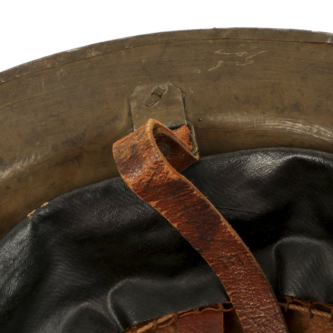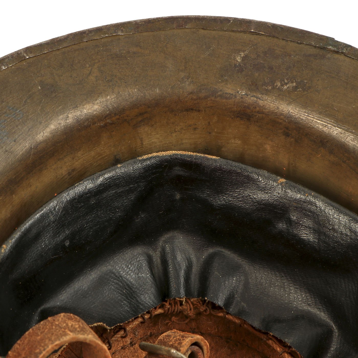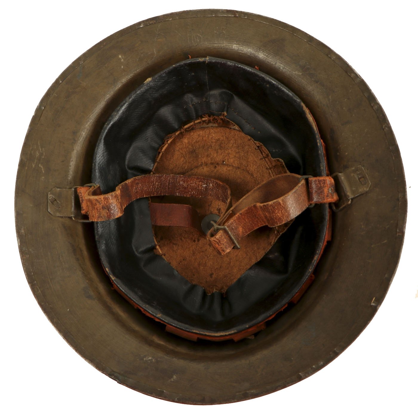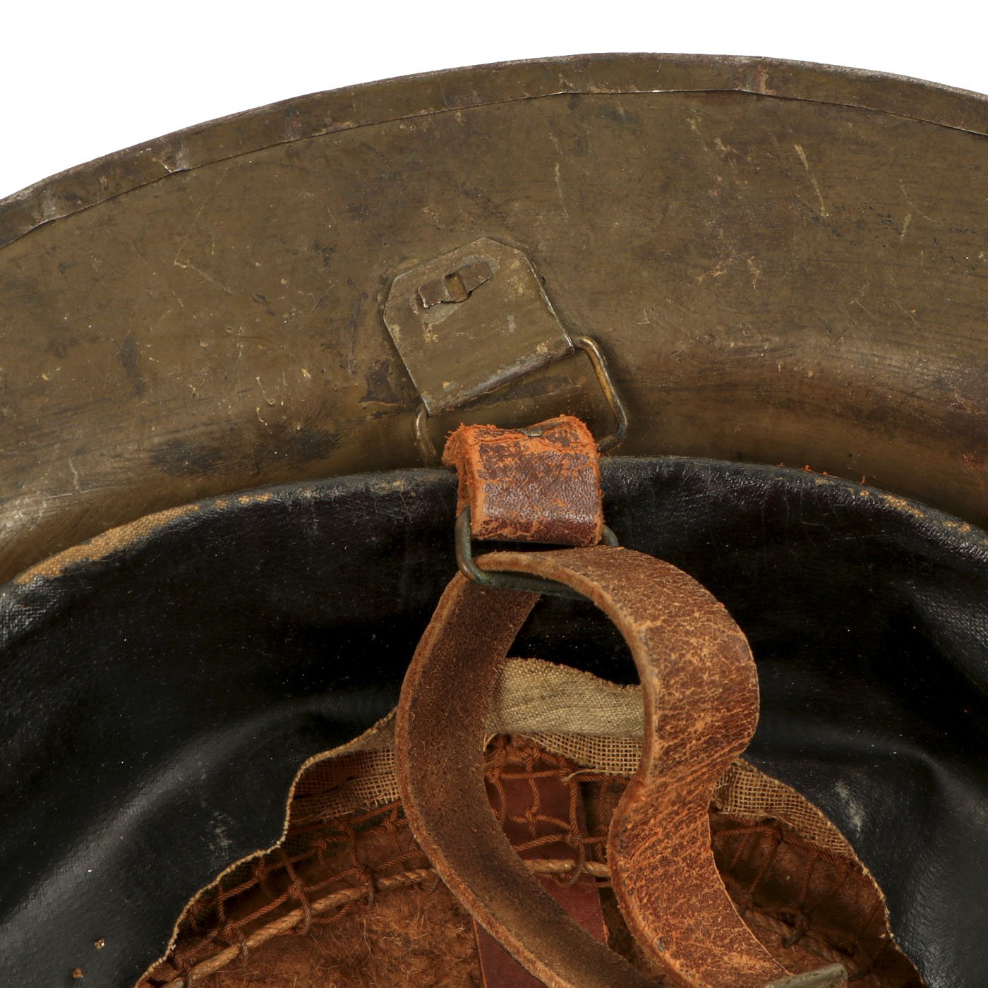 M1917 helmet liners typically show a paper label at the crown and the dome rivet head. The liner is set up as on the British versions, with an oilcloth band and net configuration, attached to a leather strap, riveted to the shell. The chinstrap is leather with steel buckle.