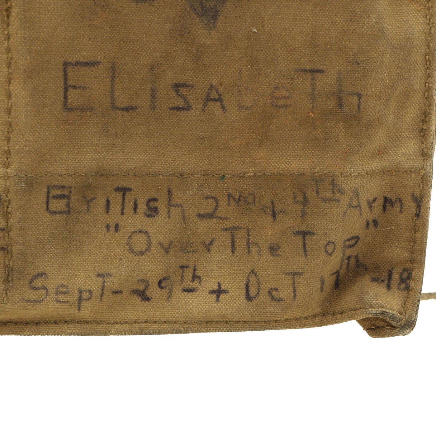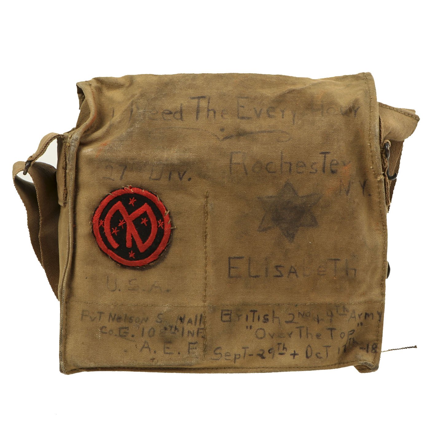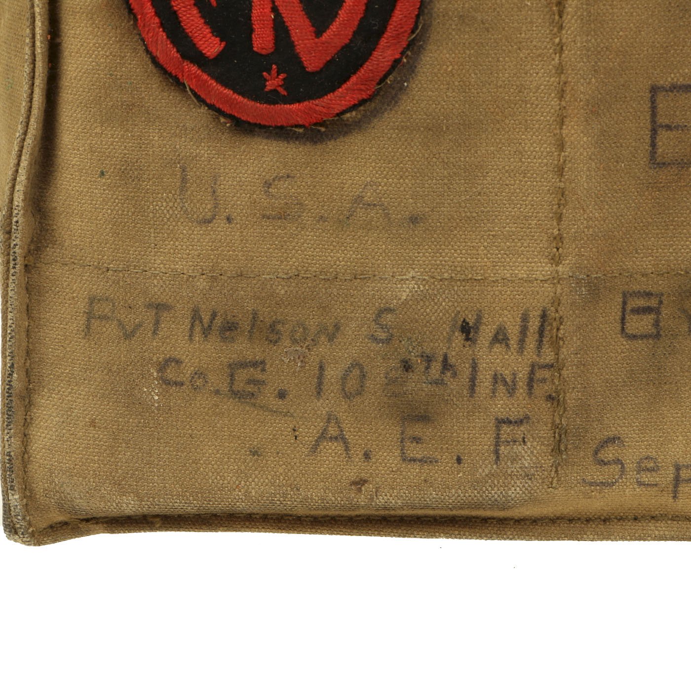 However, the excellent personalization on the satchel more than makes up for the condition of the mask. It is named to PvT. Nelson S. Hall, Co. G 108 INF, A.E.F.. This unit was part of the 54th Infantry brigade, along with the 106th and 107th Regiments. The outside also indicates that they were deployed with the British 2nd & 4th Army "Over The Top" Sept. 29th + Oct 17th - 18. There are additional personalization as shown.