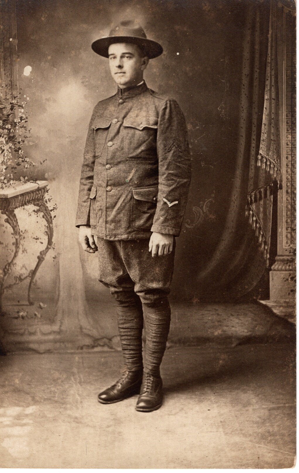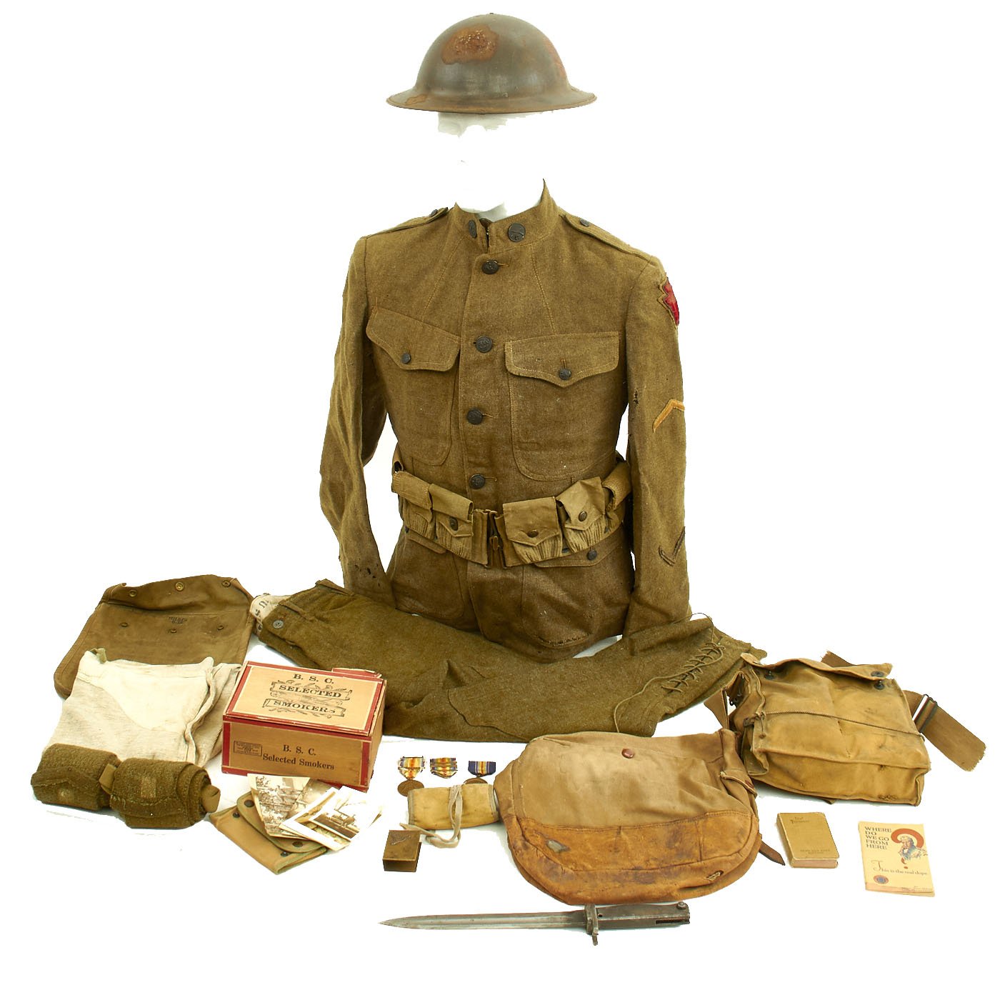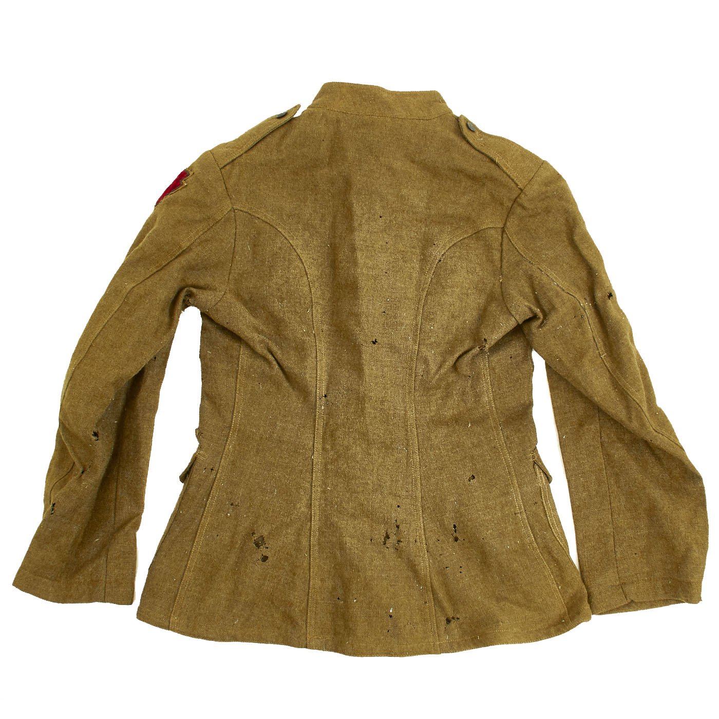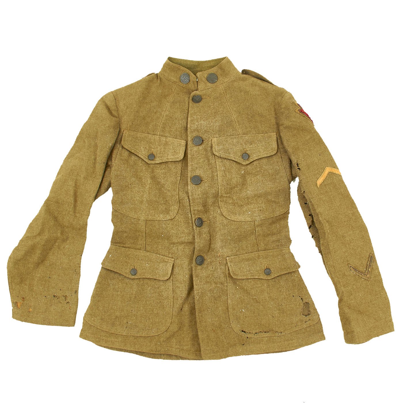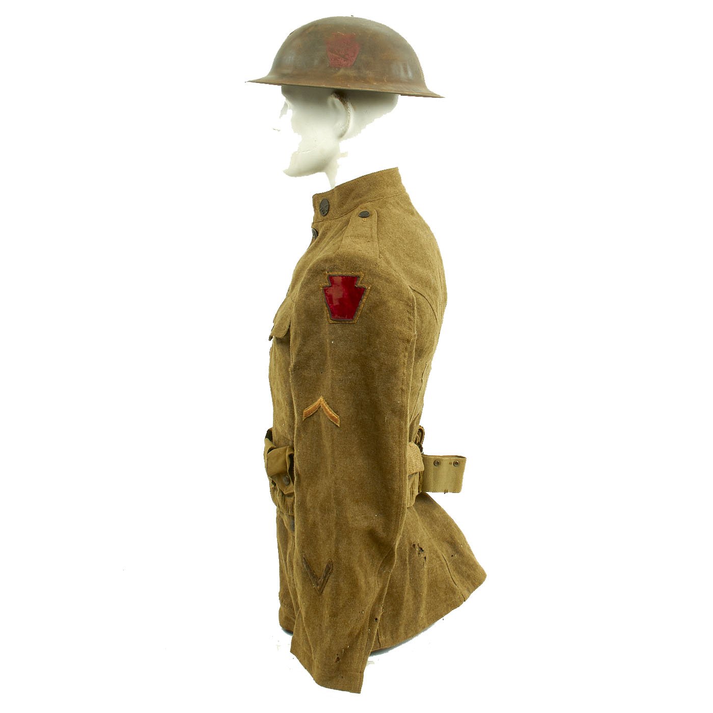 - Original U.S. WWI Wool Army tunic with 28th Infantry Division Ivy insignia on left shoulder, private chevron, overseas chevrons, includes matching Jodphur style trousers. Very good Condition.