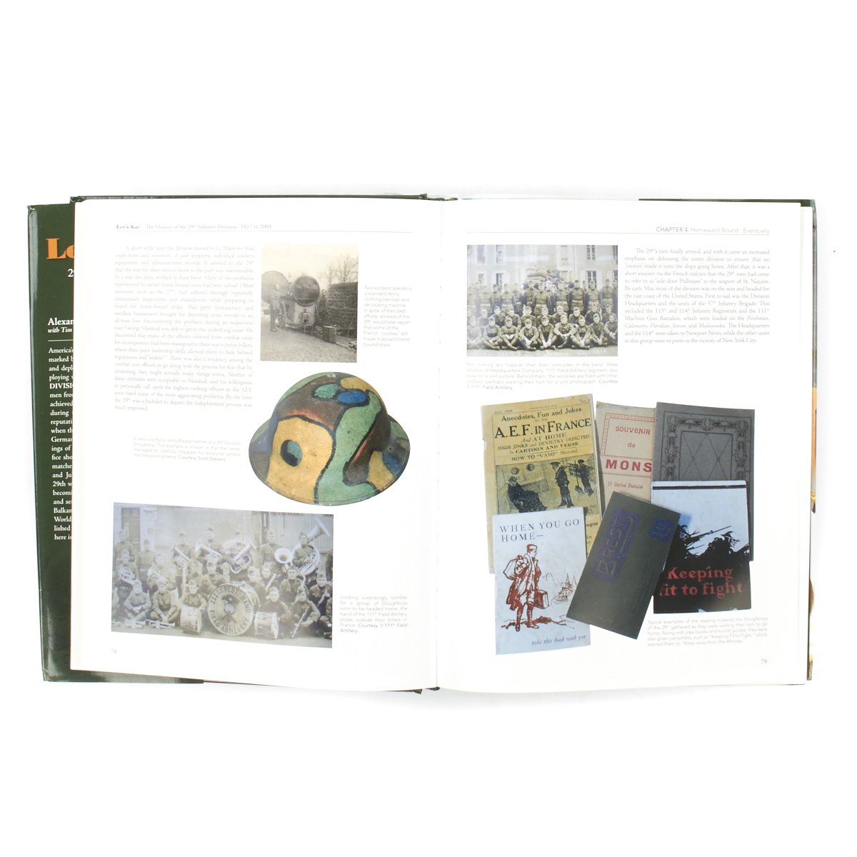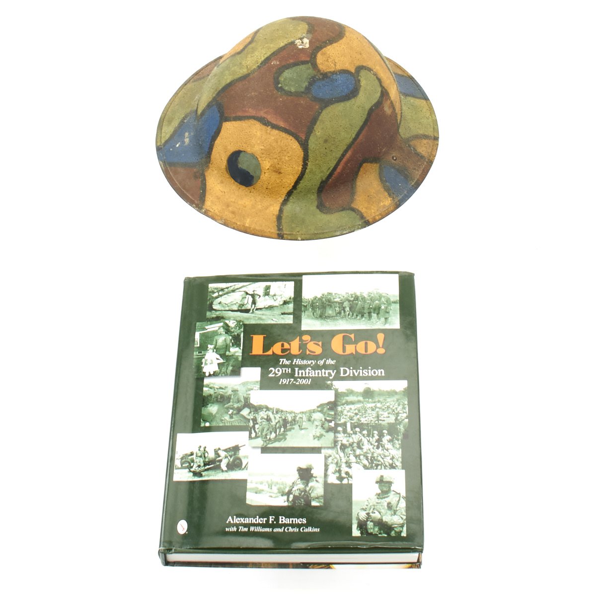Original Item: One-of-a-kind. This stunning helmet which is hand painted in camouflage is unique in that the owner integrated the 29th Infantry Division insignia into the paint scheme. It is so unique that this helmet appears on page 78 of the wonderful hardcover book; Let's Go!: The History of the 29th Infantry Division 1917-2001 by Alexander F. Barnes in Hardcover and published in 2014. A brand new copy of the book is included with the purchase of this helmet ($75 value)