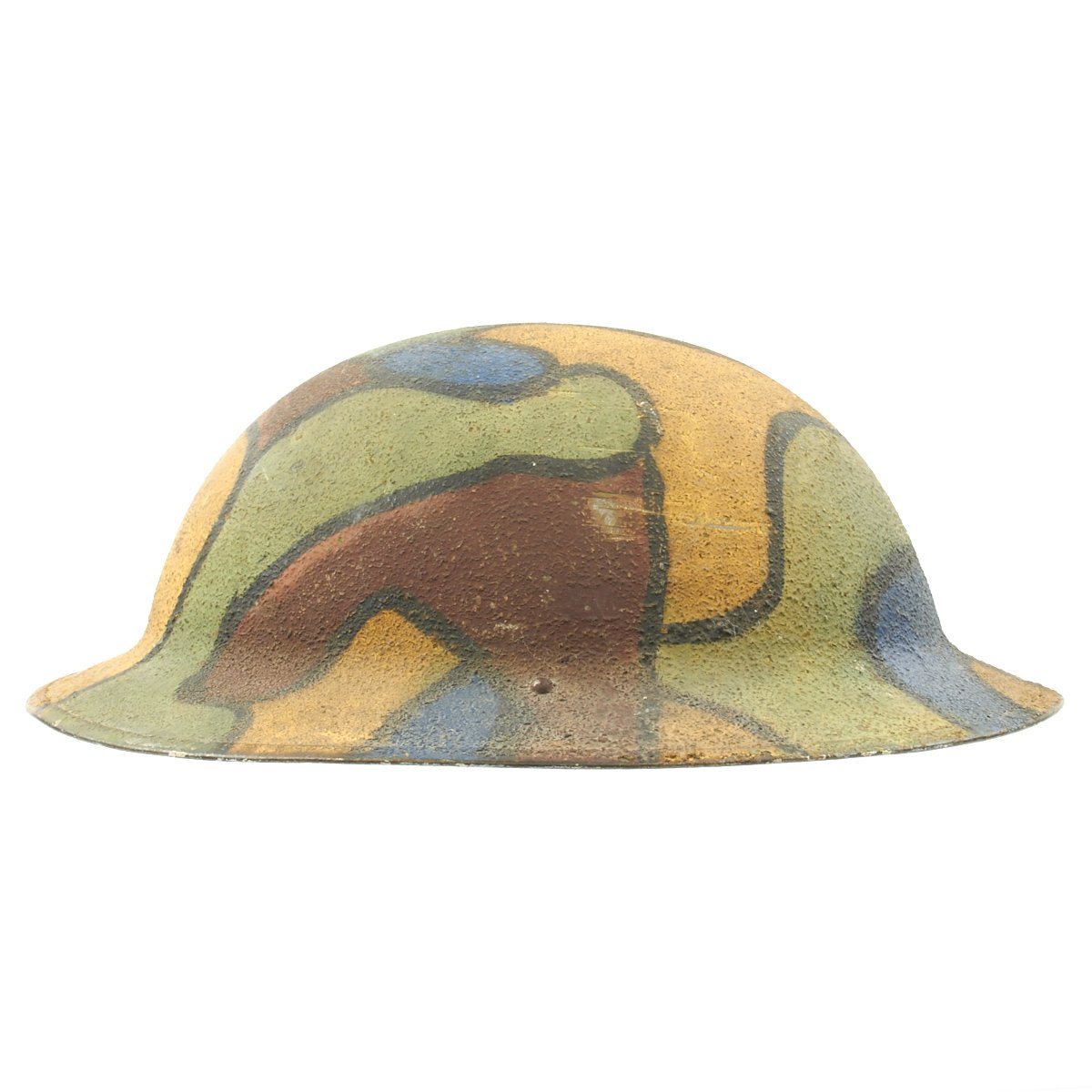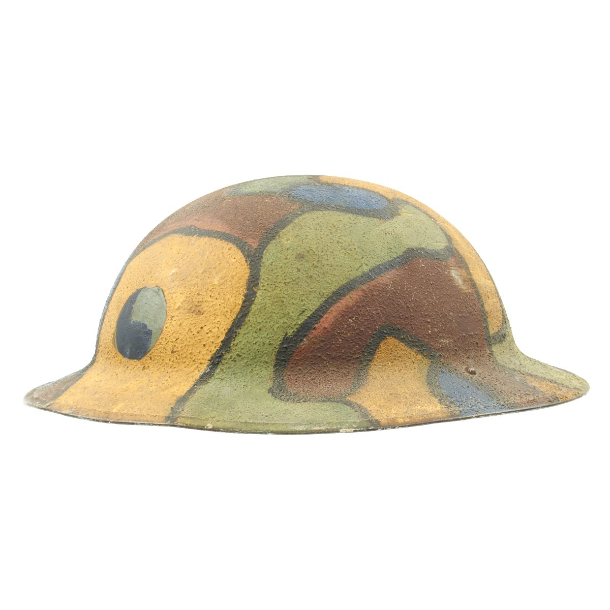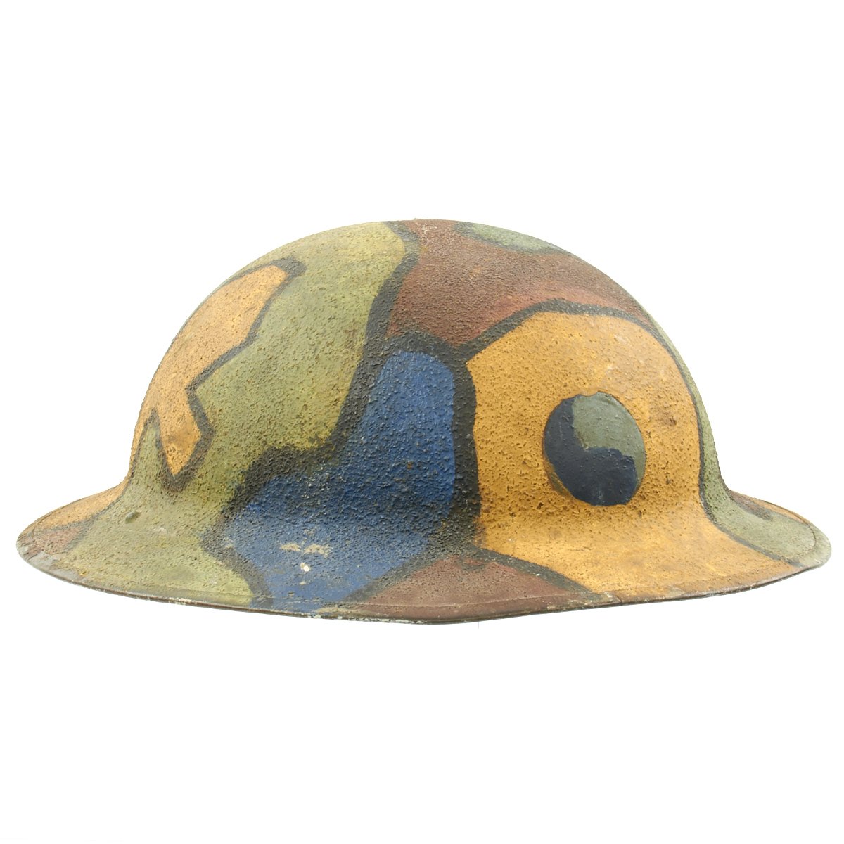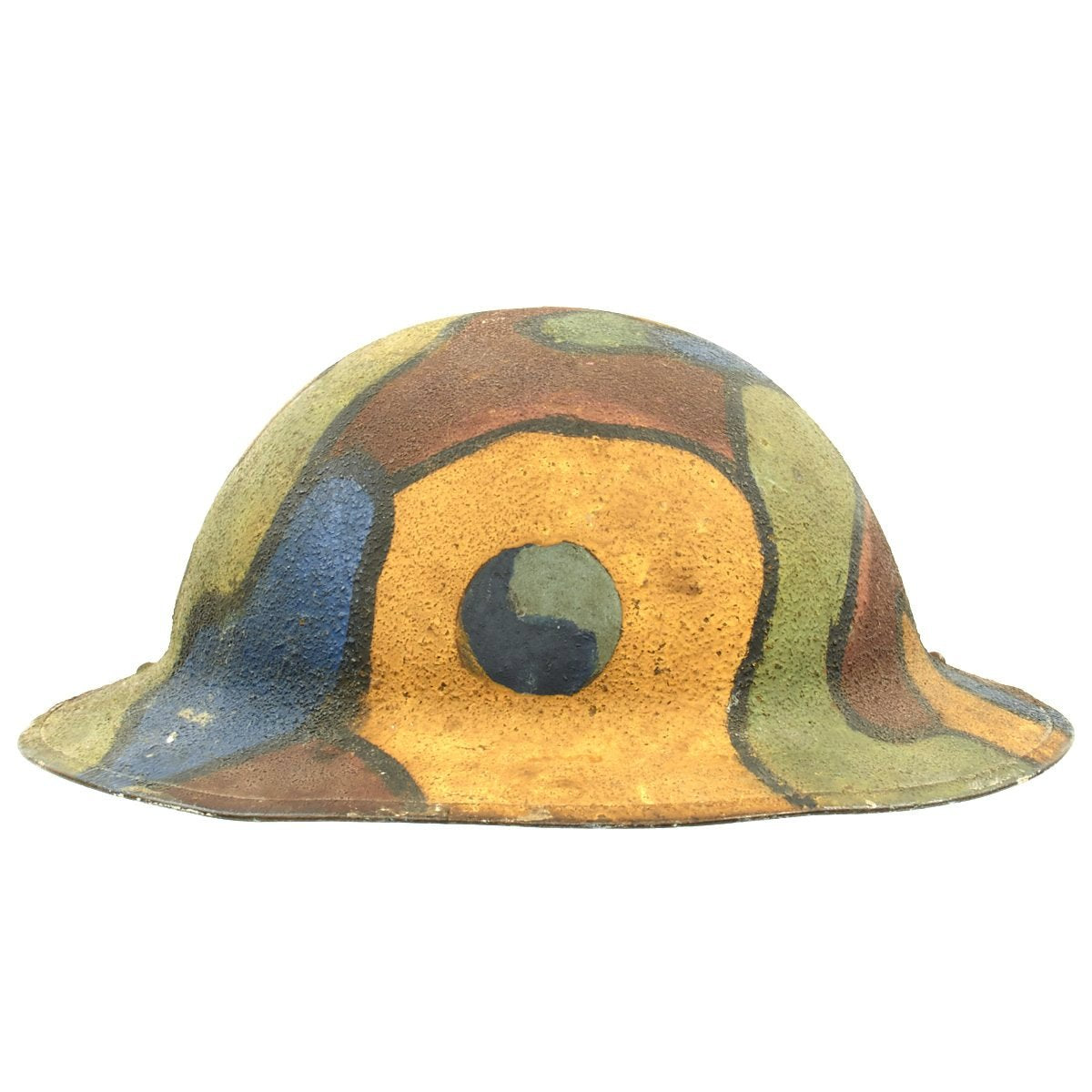 This wonderful example features original period textured camouflage paint. The paint pattern is stunning in its use of colors that include blue, gray, yellow, green, maroon and black. There is no liner or chinstrap, but regardless, this is one of the most memorable M1917 World War One helmets we've ever seen.