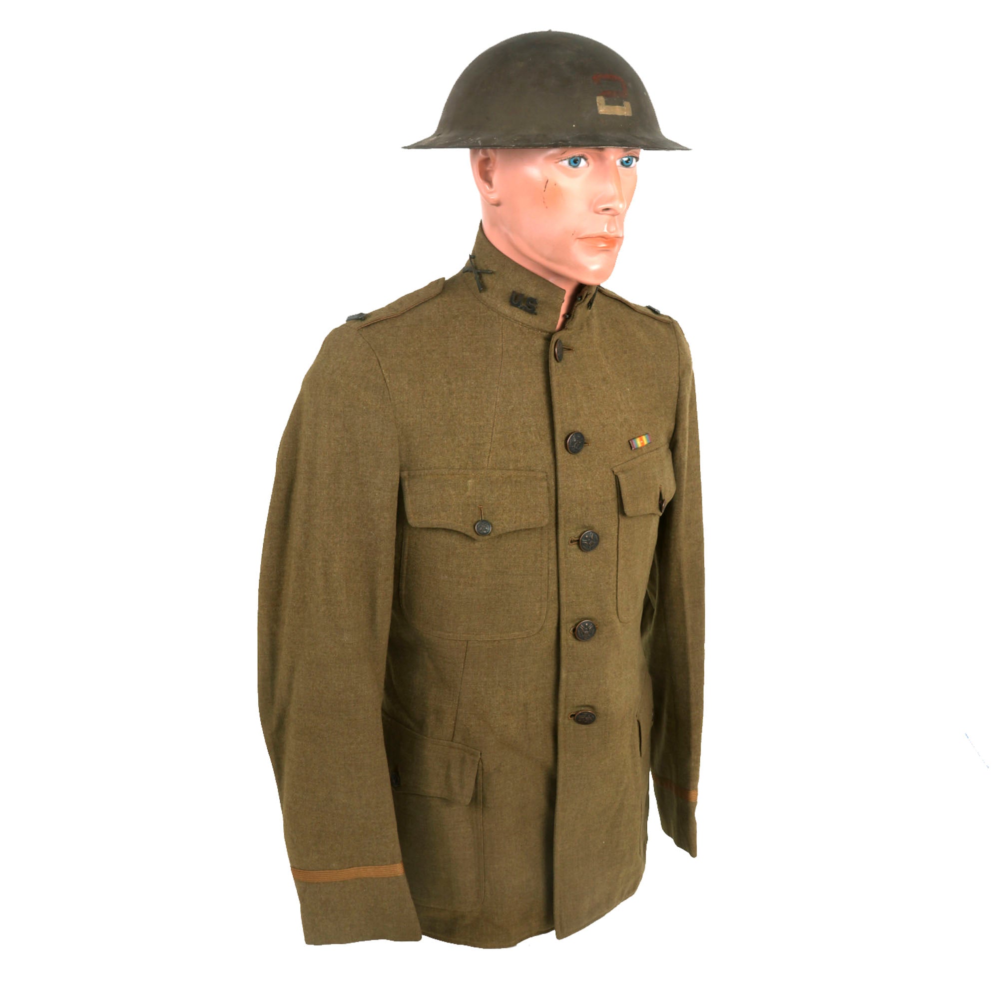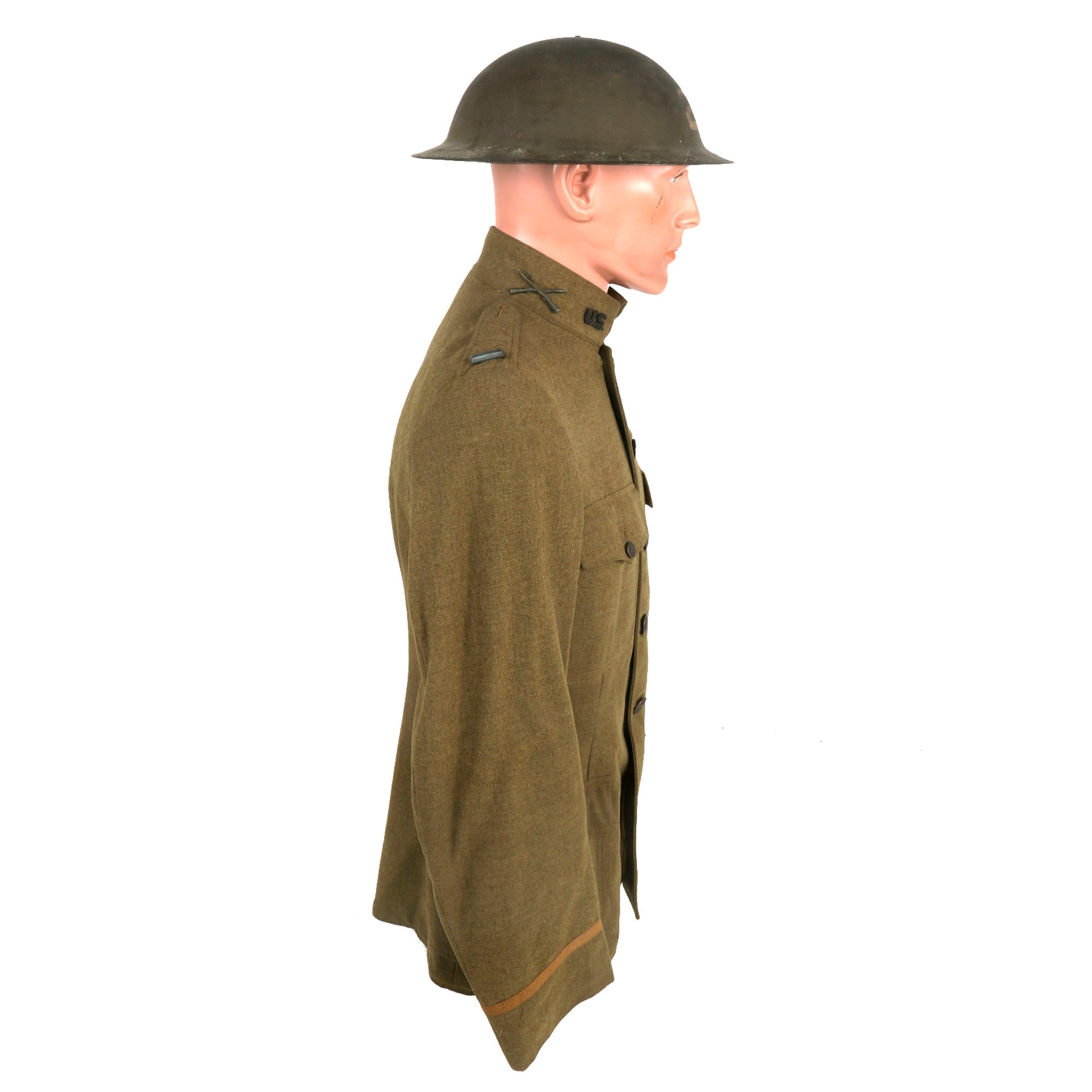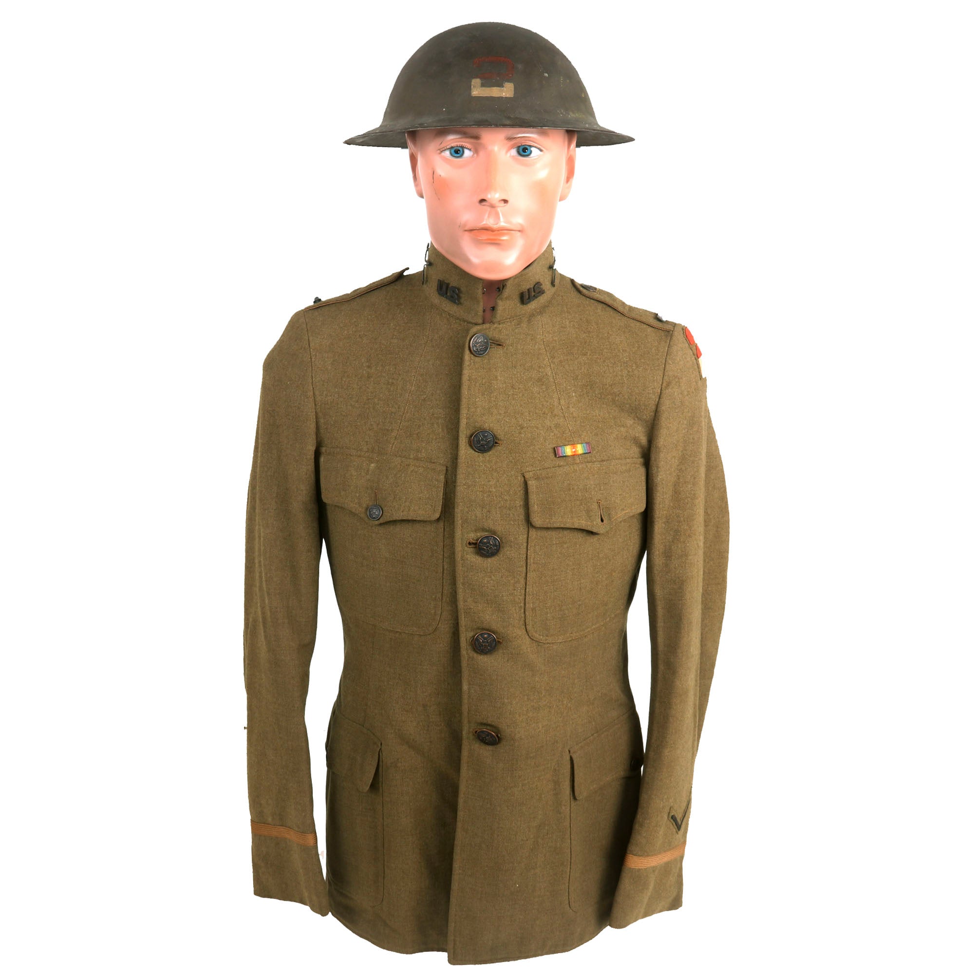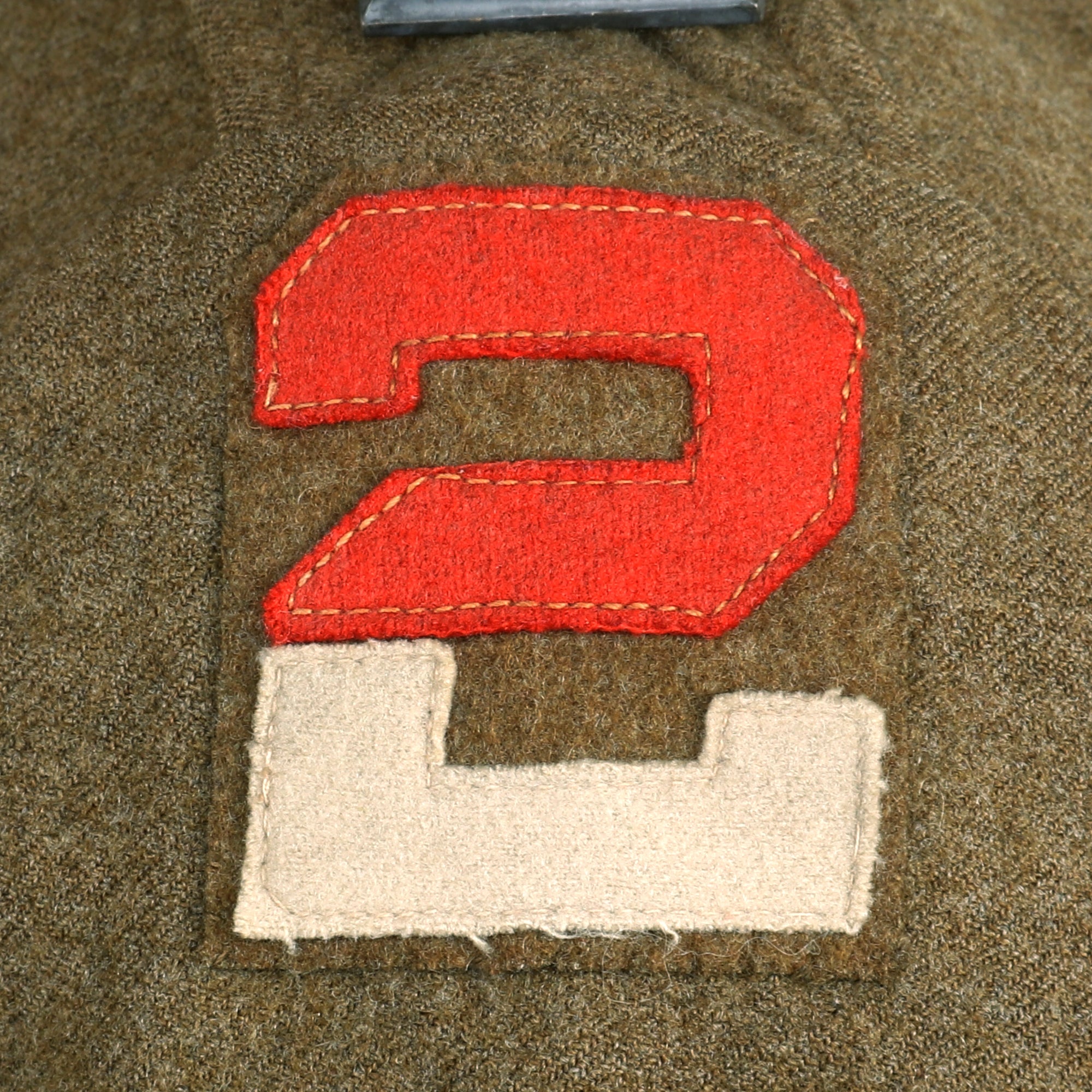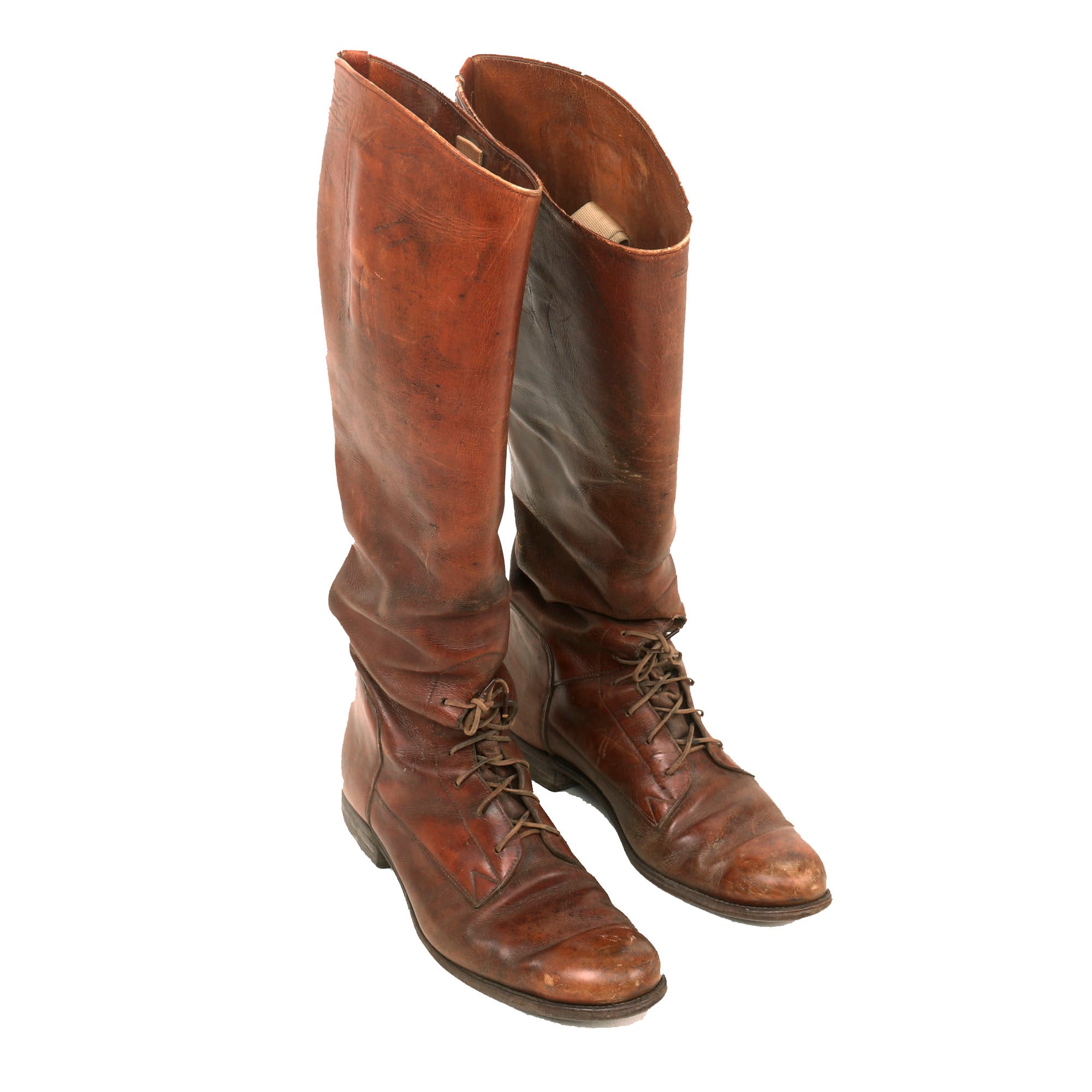 This is a great uniform grouping to a 1st Lieutenant of Infantry in the 2nd Army, American Expeditionary Forces, who served for 6-11 months overseas. The uniform has a great 2nd Army patch and one overseas chevron denoting 6-11 months overseas on the left sleeve, with US & Infantry officer’s collar insignia on both sides. There is a victory ribbon that appears to have had a star originally that is now absent. The helmet is a U.S. made M1917, with no liner or chinstrap, and a great 2nd Army insignia painted on the front. The officer’s boots are a great private purchase set from Dehner’s in Omaha, Nebraska in fantastic condition, both retaining their original shoelaces. There is no name on the uniform that we can find.