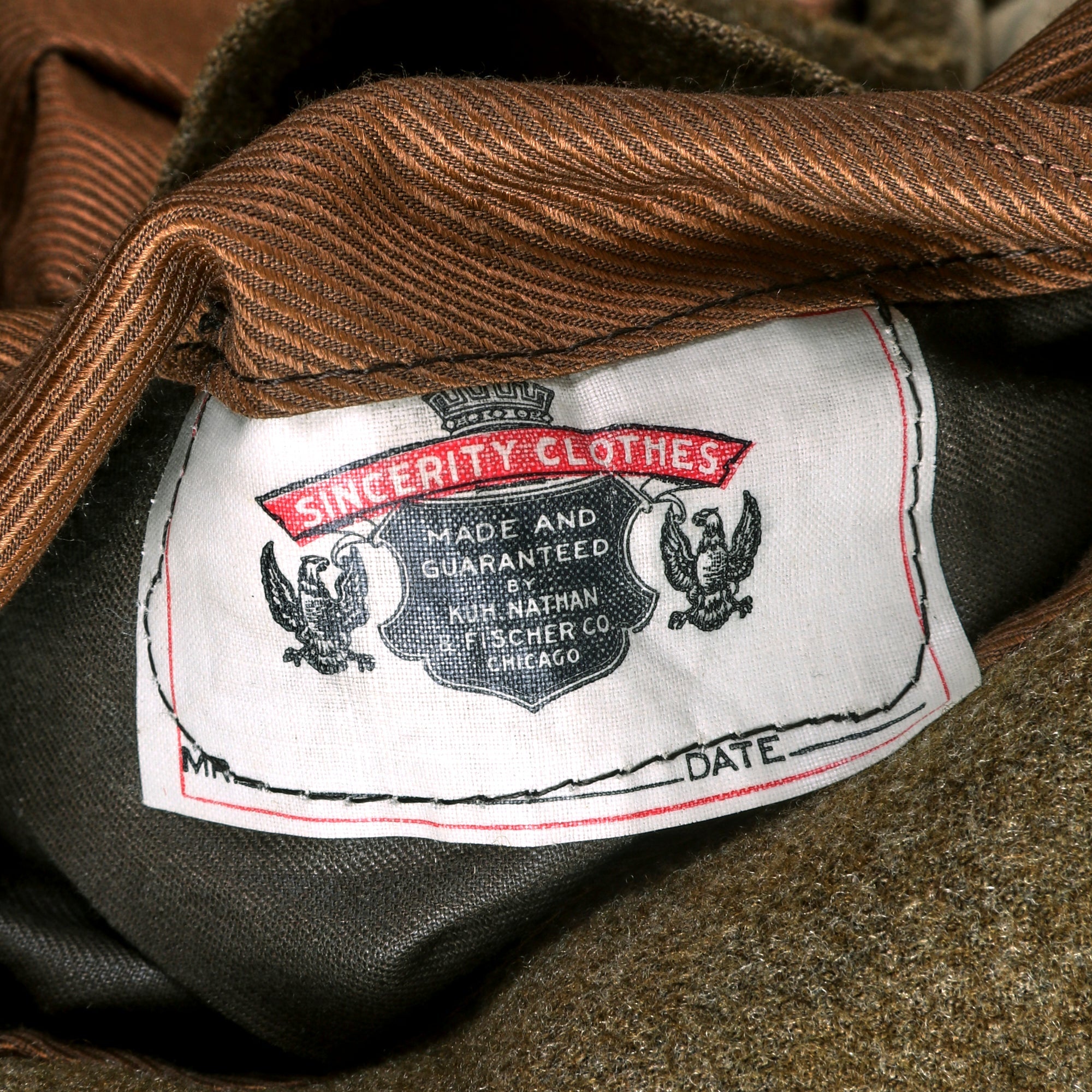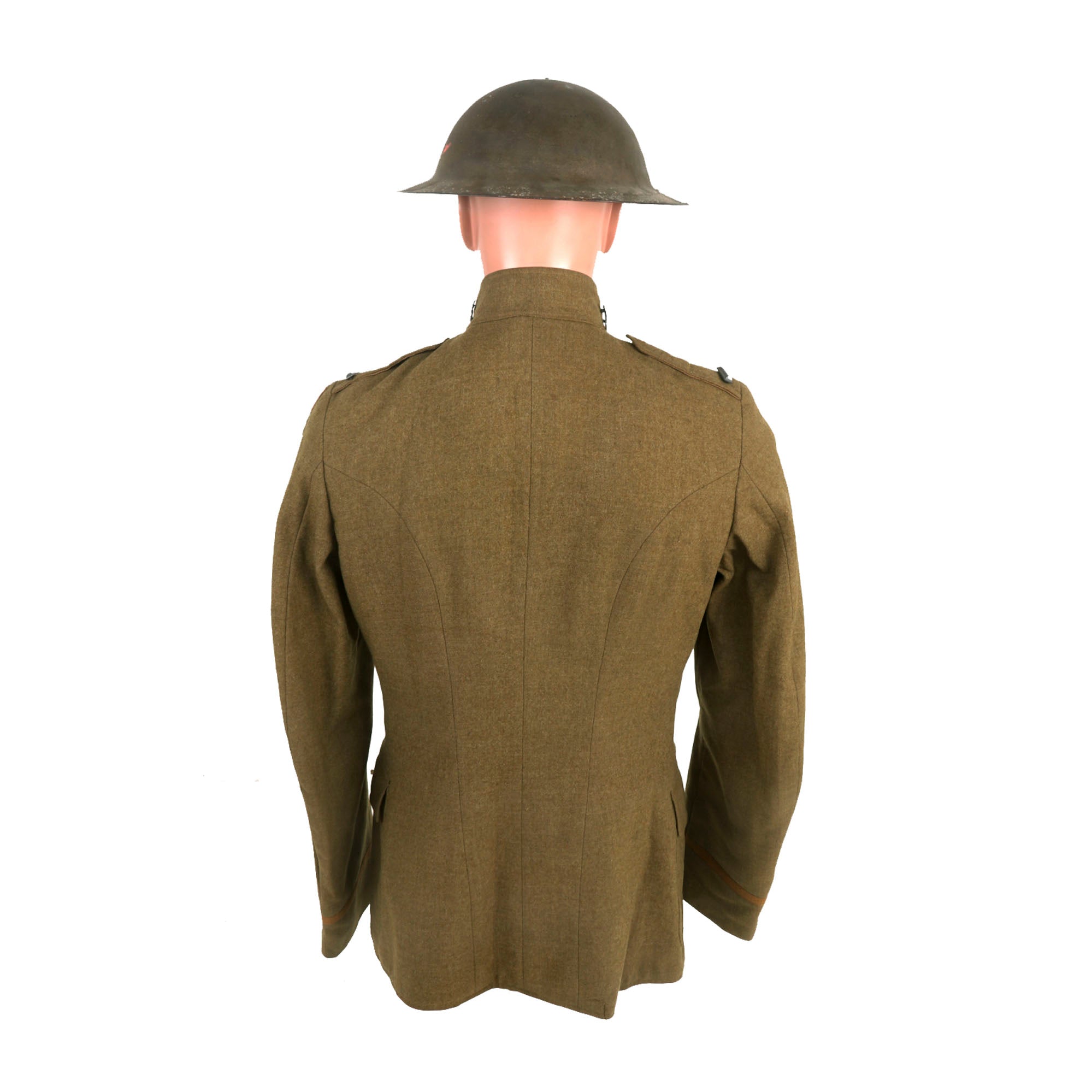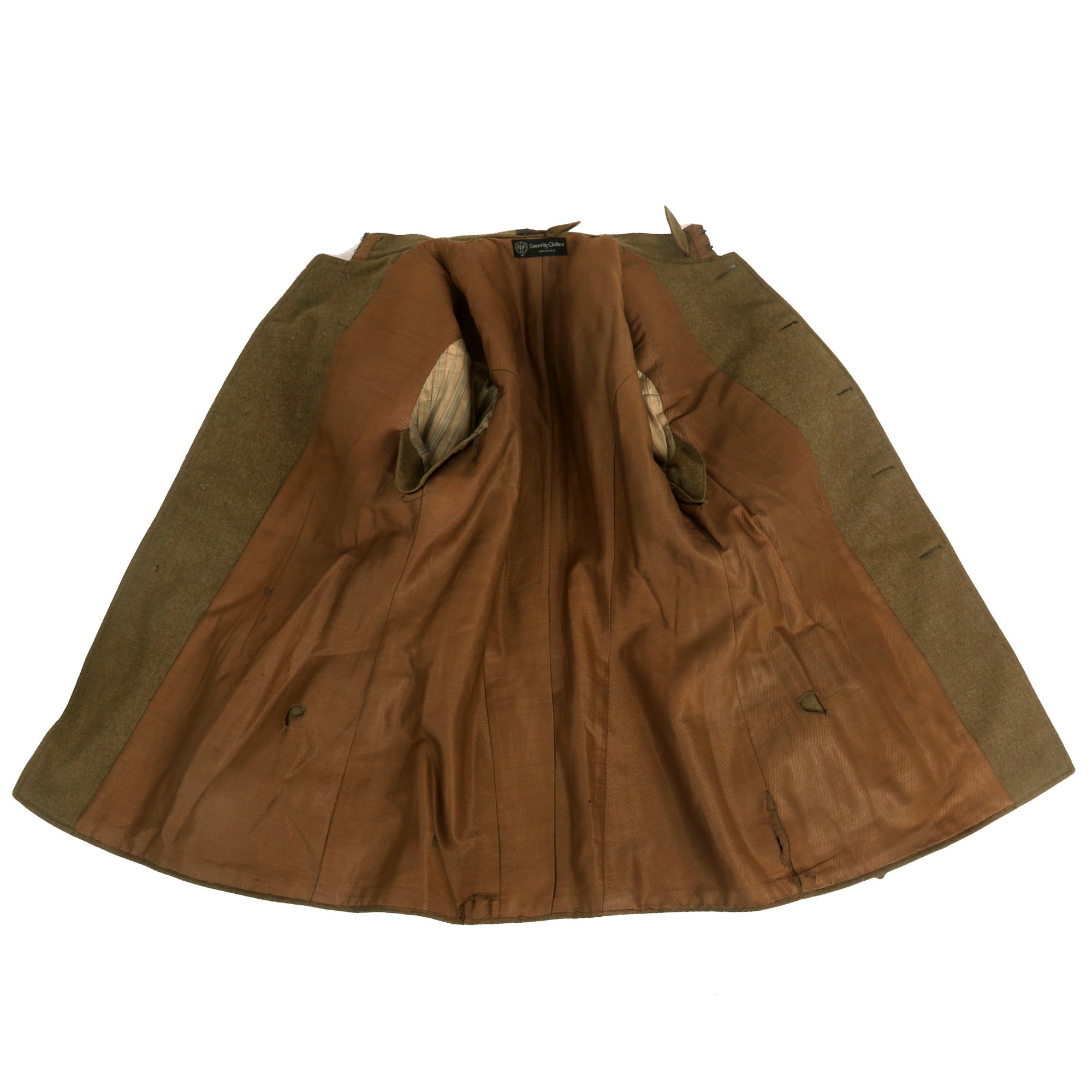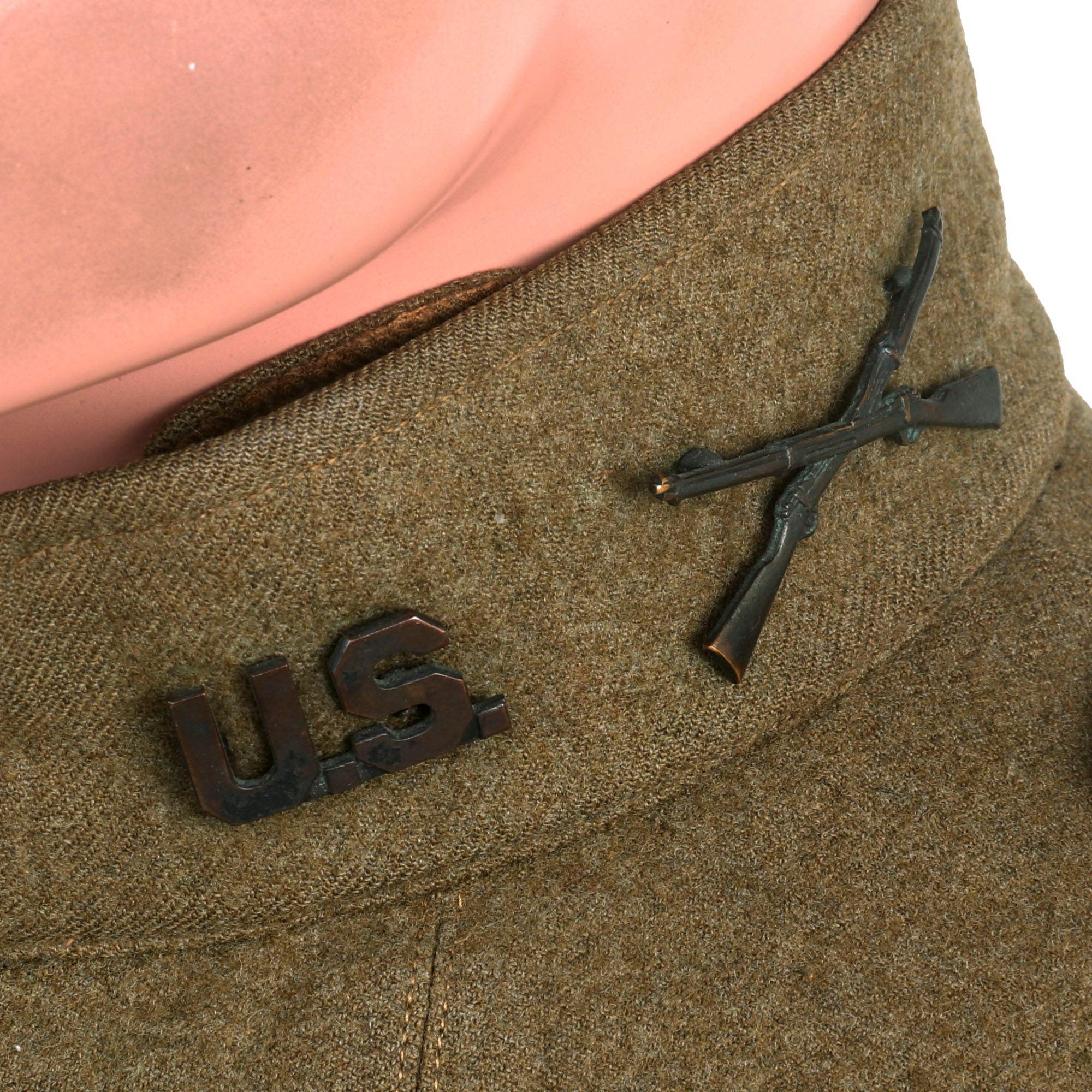 This is a great uniform grouping to a 1st Lieutenant of Infantry in the 2nd Army, American Expeditionary Forces, who served for 6-11 months overseas. The uniform has a great 2nd Army patch and one overseas chevron denoting 6-11 months overseas on the left sleeve, with US & Infantry officer’s collar insignia on both sides. There is a victory ribbon that appears to have had a star originally that is now absent. The helmet is a U.S. made M1917, with no liner or chinstrap, and a great 2nd Army insignia painted on the front. The officer’s boots are a great private purchase set from Dehner’s in Omaha, Nebraska in fantastic condition, both retaining their original shoelaces. There is no name on the uniform that we can find.