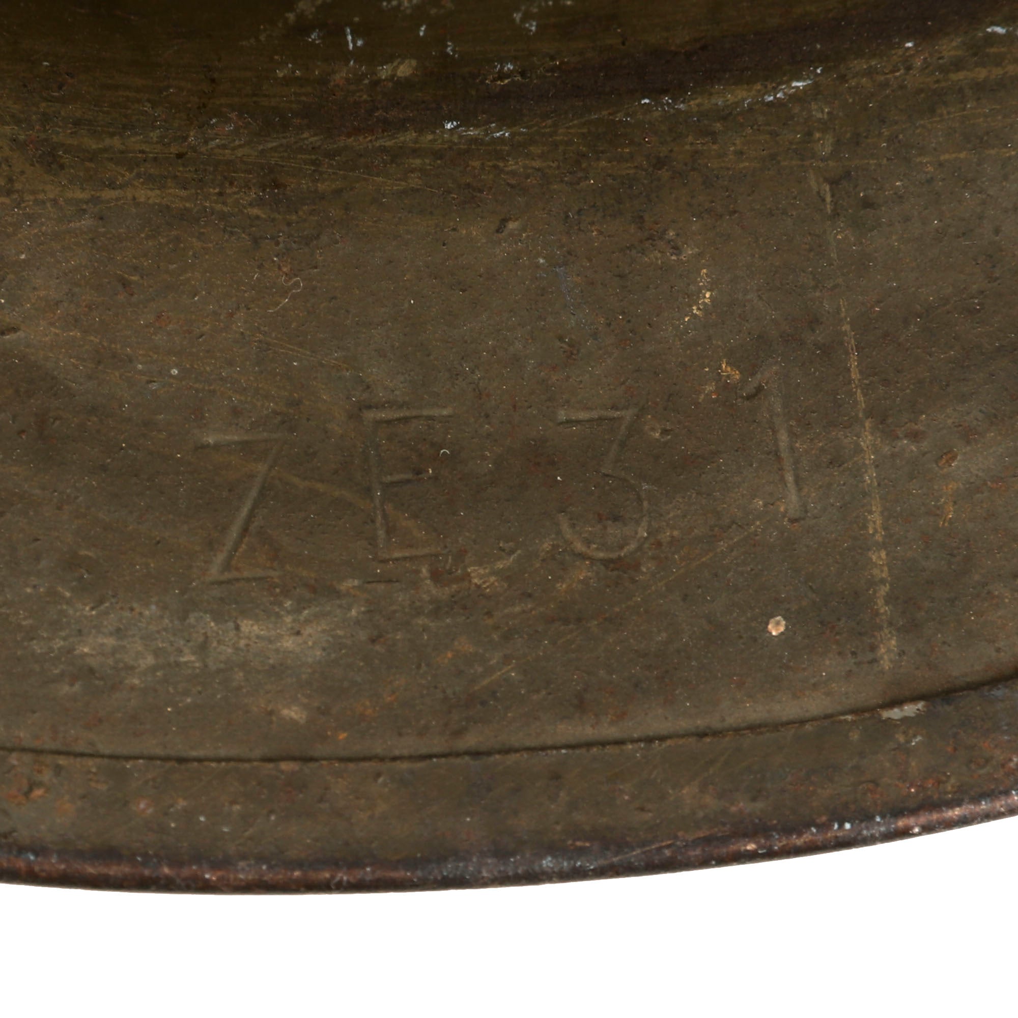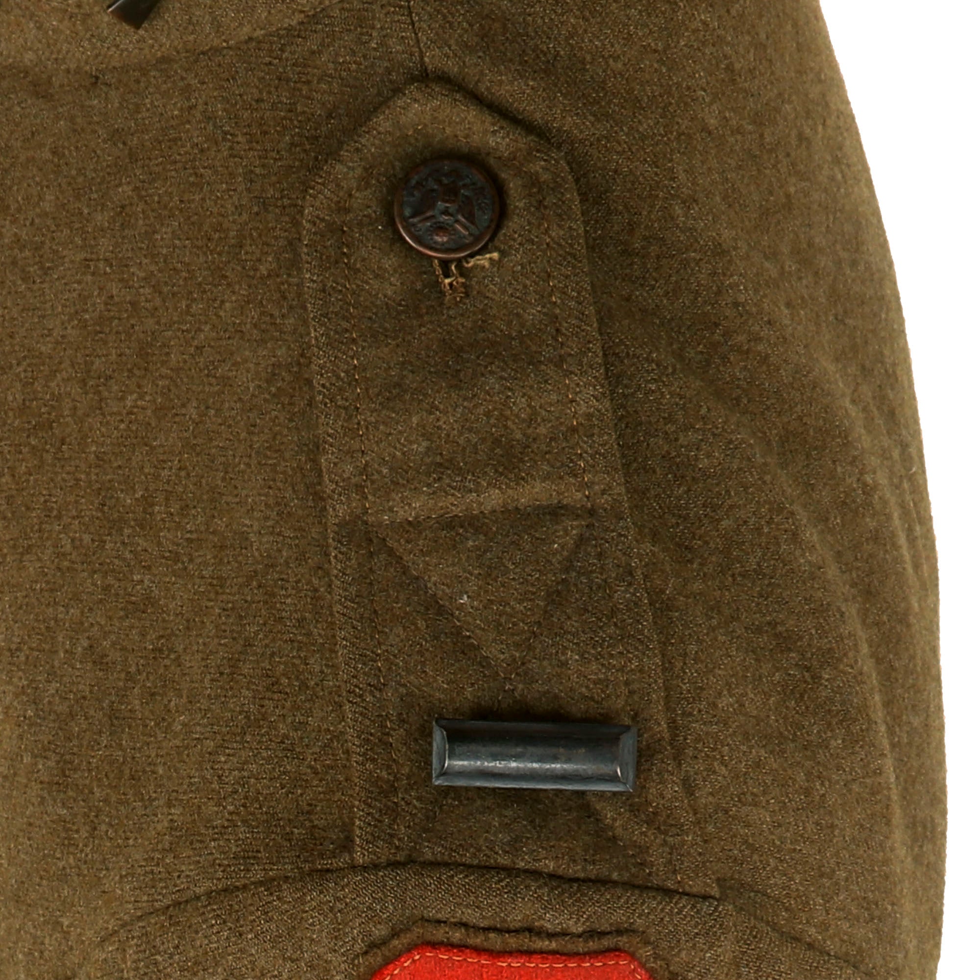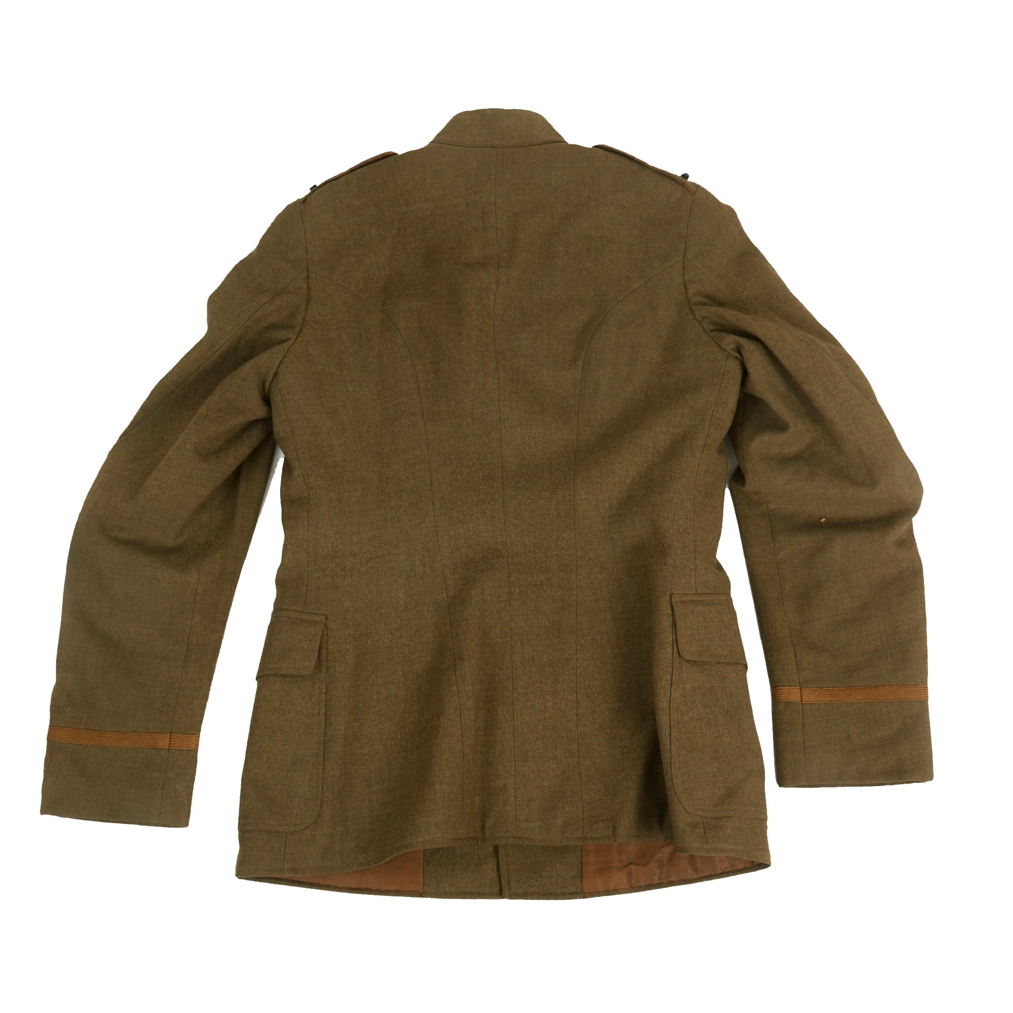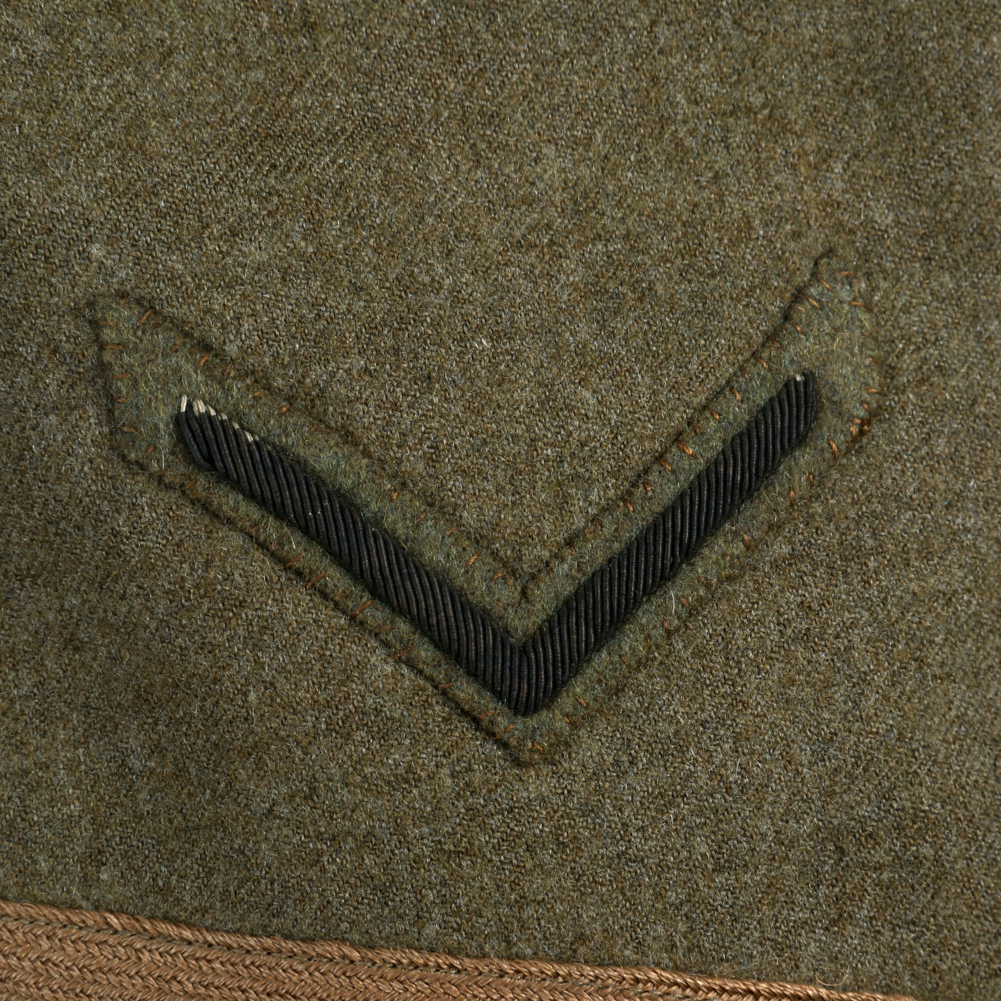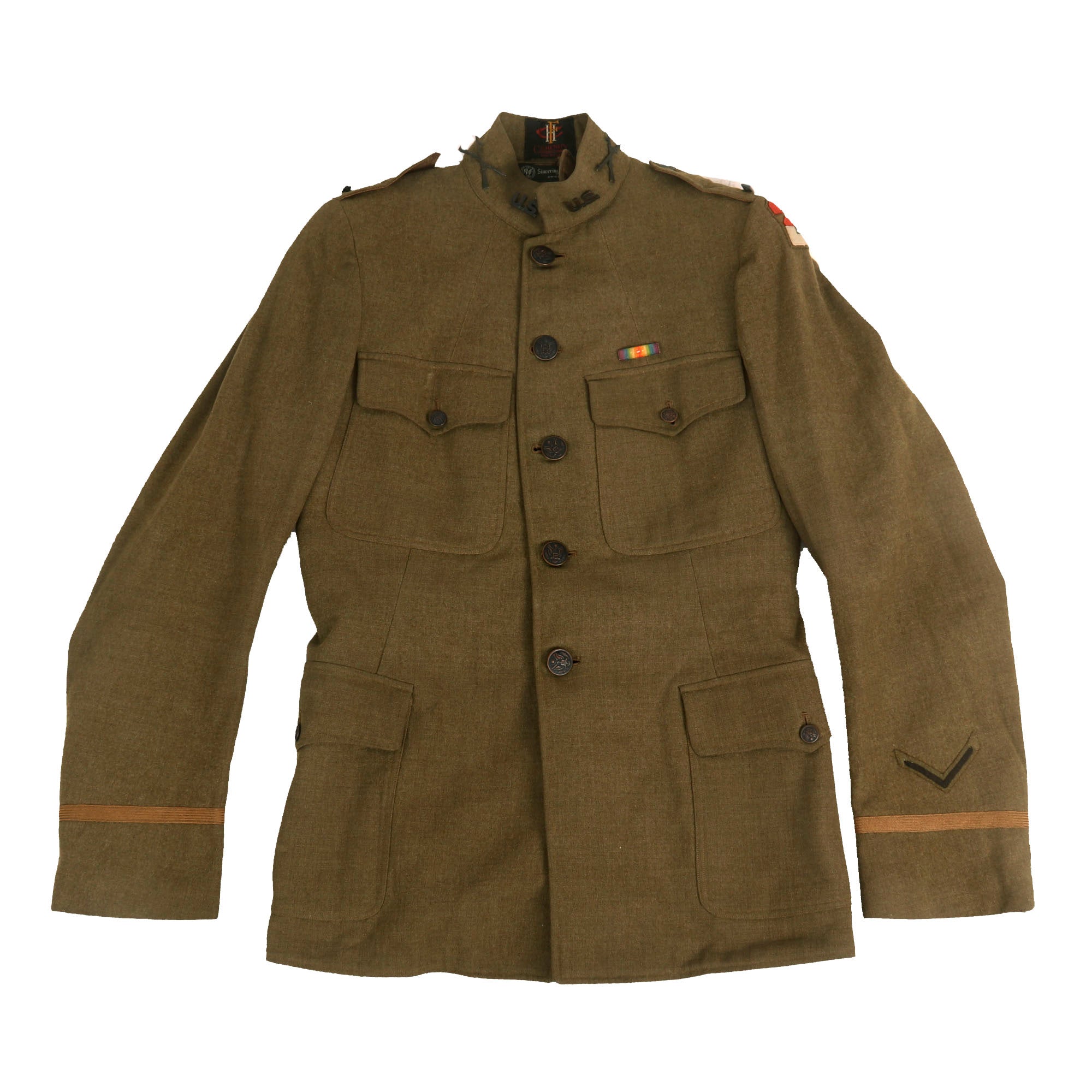 This is a great uniform grouping to a 1st Lieutenant of Infantry in the 2nd Army, American Expeditionary Forces, who served for 6-11 months overseas. The uniform has a great 2nd Army patch and one overseas chevron denoting 6-11 months overseas on the left sleeve, with US & Infantry officer’s collar insignia on both sides. There is a victory ribbon that appears to have had a star originally that is now absent. The helmet is a U.S. made M1917, with no liner or chinstrap, and a great 2nd Army insignia painted on the front. The officer’s boots are a great private purchase set from Dehner’s in Omaha, Nebraska in fantastic condition, both retaining their original shoelaces. There is no name on the uniform that we can find.