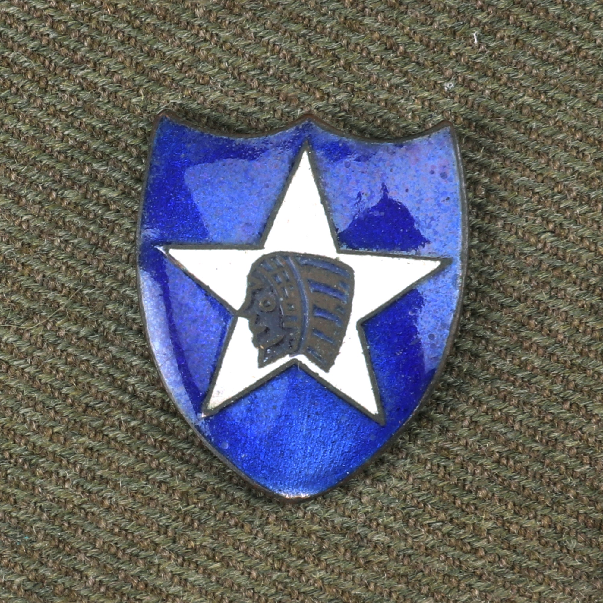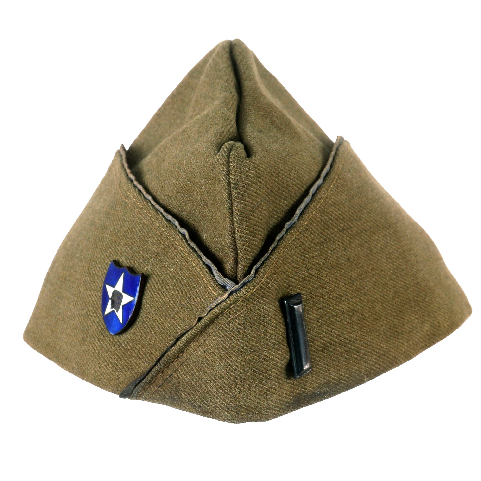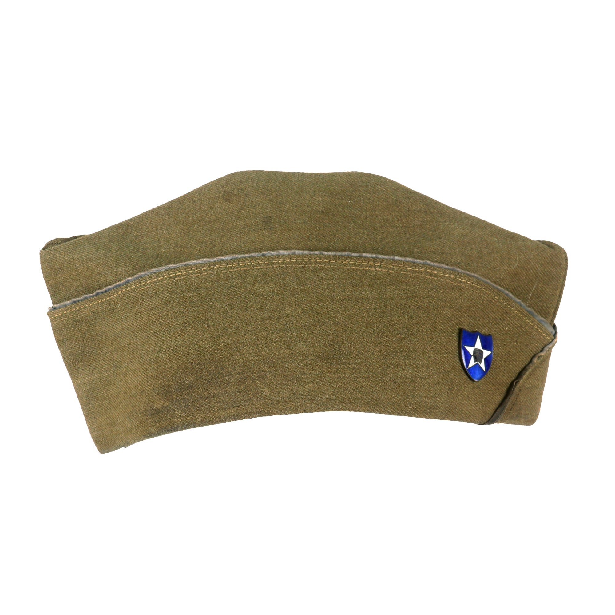 Original Item. Only One Available. This is a gorgeous French-made overseas cap for a 1st Lieutenant of Infantry in the 2nd Division, American Expeditionary Forces. The cap bears an extremely scarce French-made enamel 2nd Division pin. This pin depicts the Indian Head in a white star on a blue shield background. This would traditionally indicate use by the 2nd Military Police & HQ Train, but these blue enamel pins were used by men of all units of the 2nd Division. The cap has faded blue piping indicating infantry, so this lieutenant was either of the 9th Infantry Regiment or the 23rd Infantry Regiment.