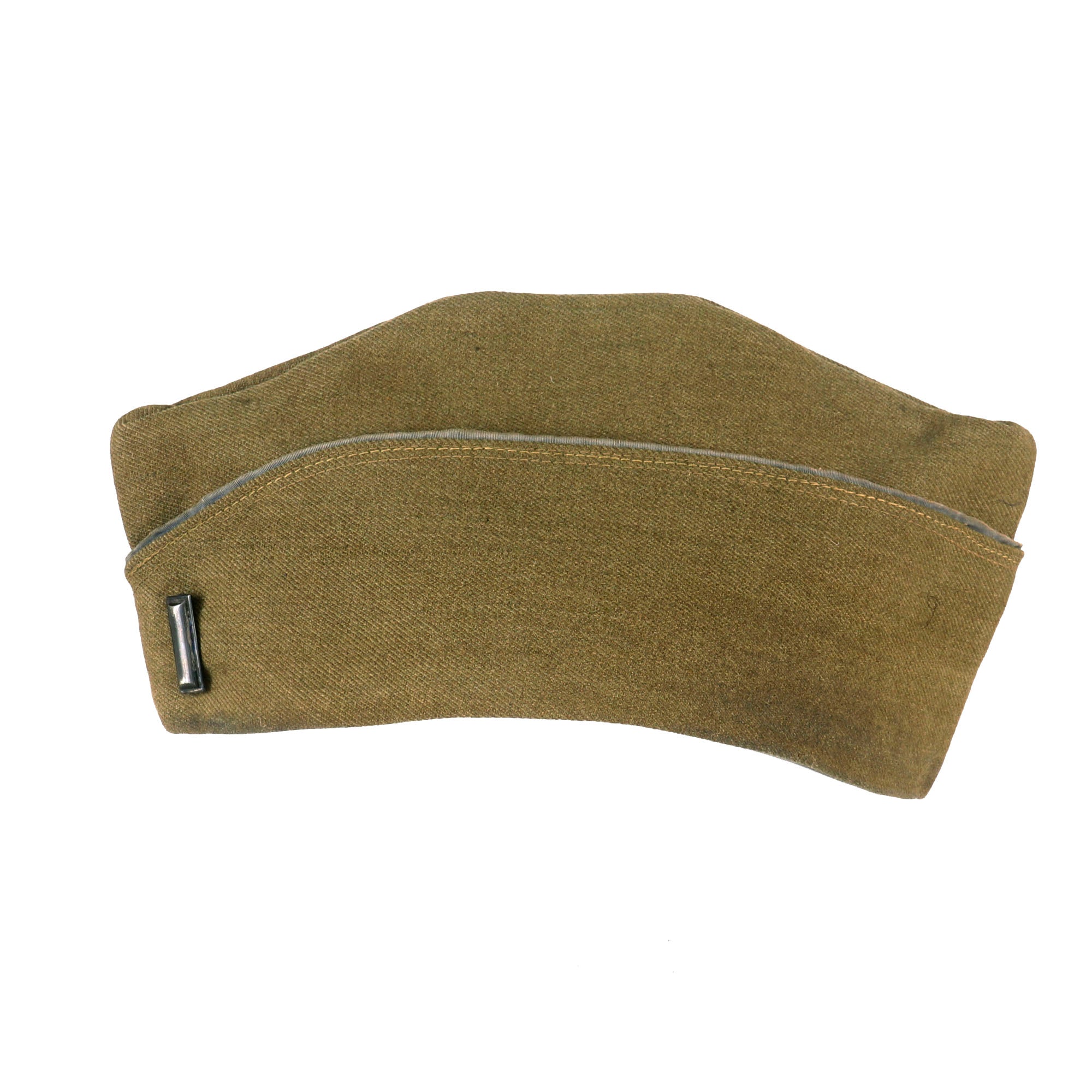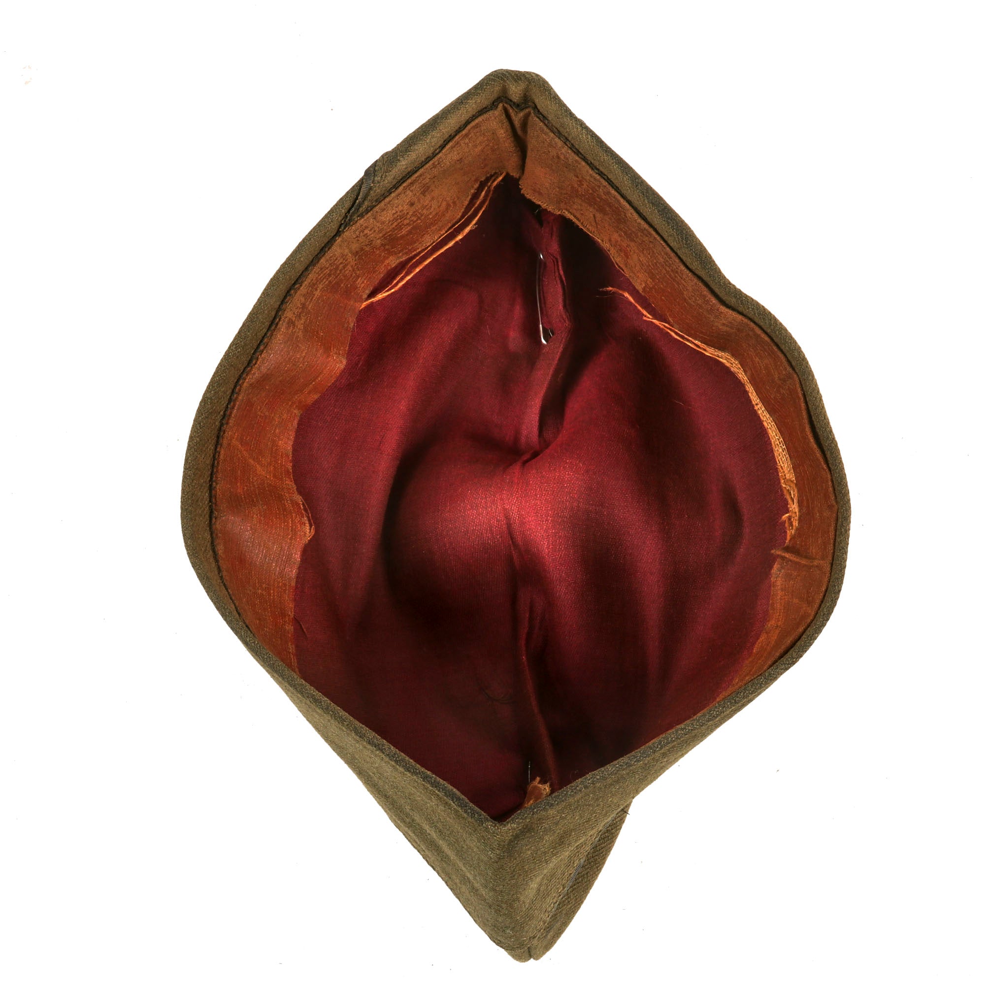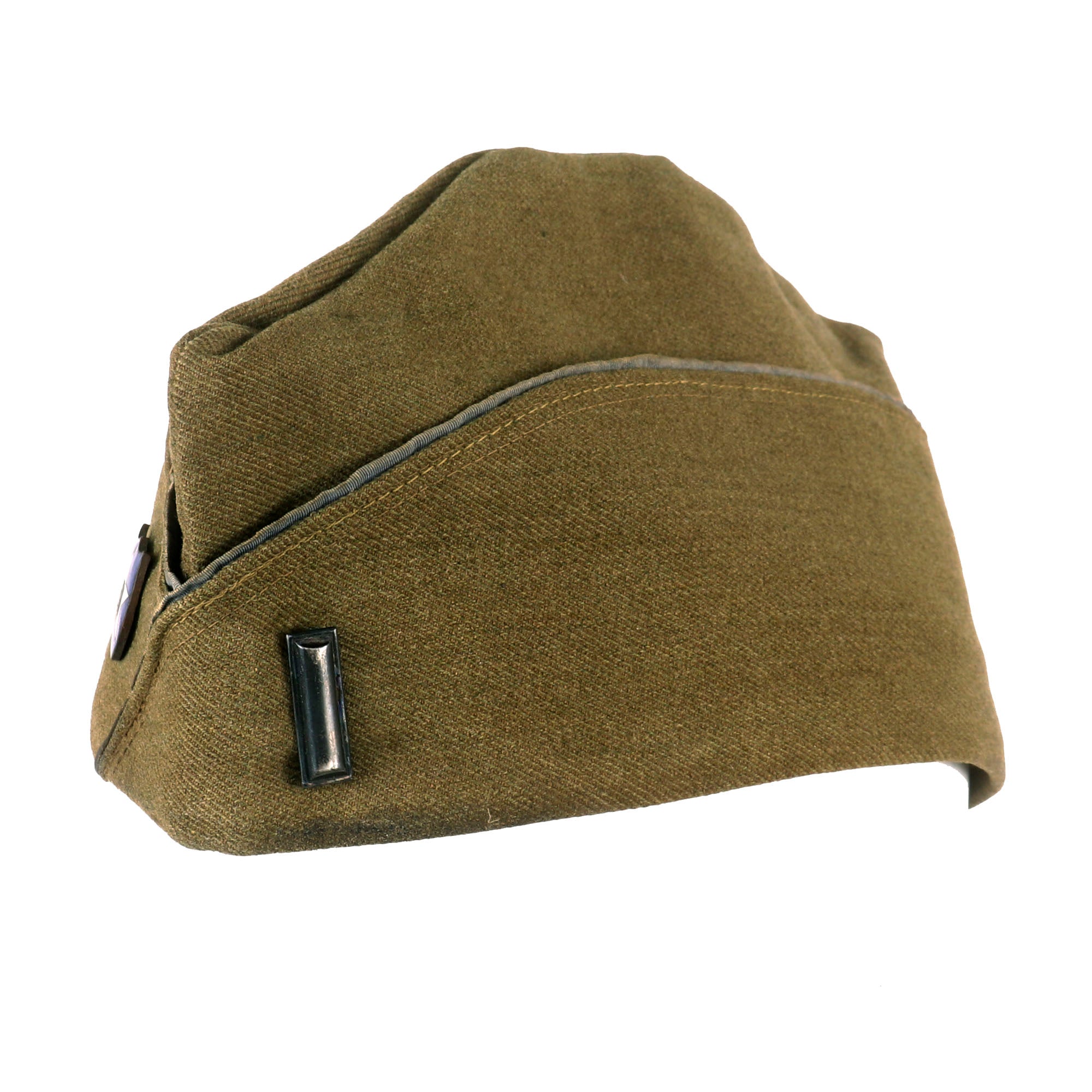 Original Item. Only One Available. This is a gorgeous French-made overseas cap for a 1st Lieutenant of Infantry in the 2nd Division, American Expeditionary Forces. The cap bears an extremely scarce French-made enamel 2nd Division pin. This pin depicts the Indian Head in a white star on a blue shield background. This would traditionally indicate use by the 2nd Military Police & HQ Train, but these blue enamel pins were used by men of all units of the 2nd Division. The cap has faded blue piping indicating infantry, so this lieutenant was either of the 9th Infantry Regiment or the 23rd Infantry Regiment.