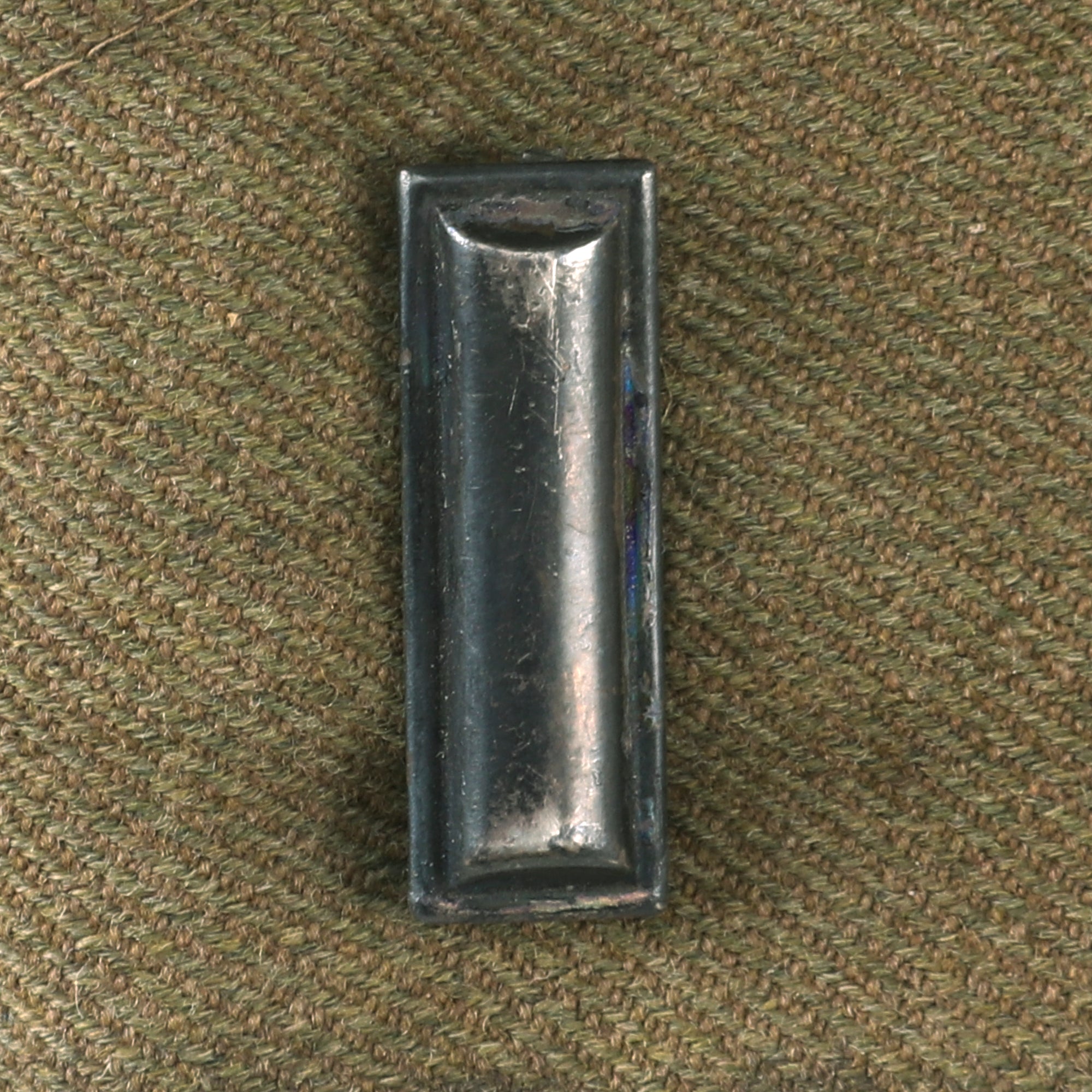 The cap is in great shape with the enamel pin on the right side and 1st Lieutenant bar on the left. The interior is lined with a dark red fabric with a burlap & leather sweatband that is still well-retained with service wear. This cap was certainly worn for a long period in France & Germany. The enamel pin is a screw back. There are two bobby pins in the hat to keep the middle part together, which was very often done by officers overseas. It appears the part has also been sewn shut which was another tactic to keep it closed.