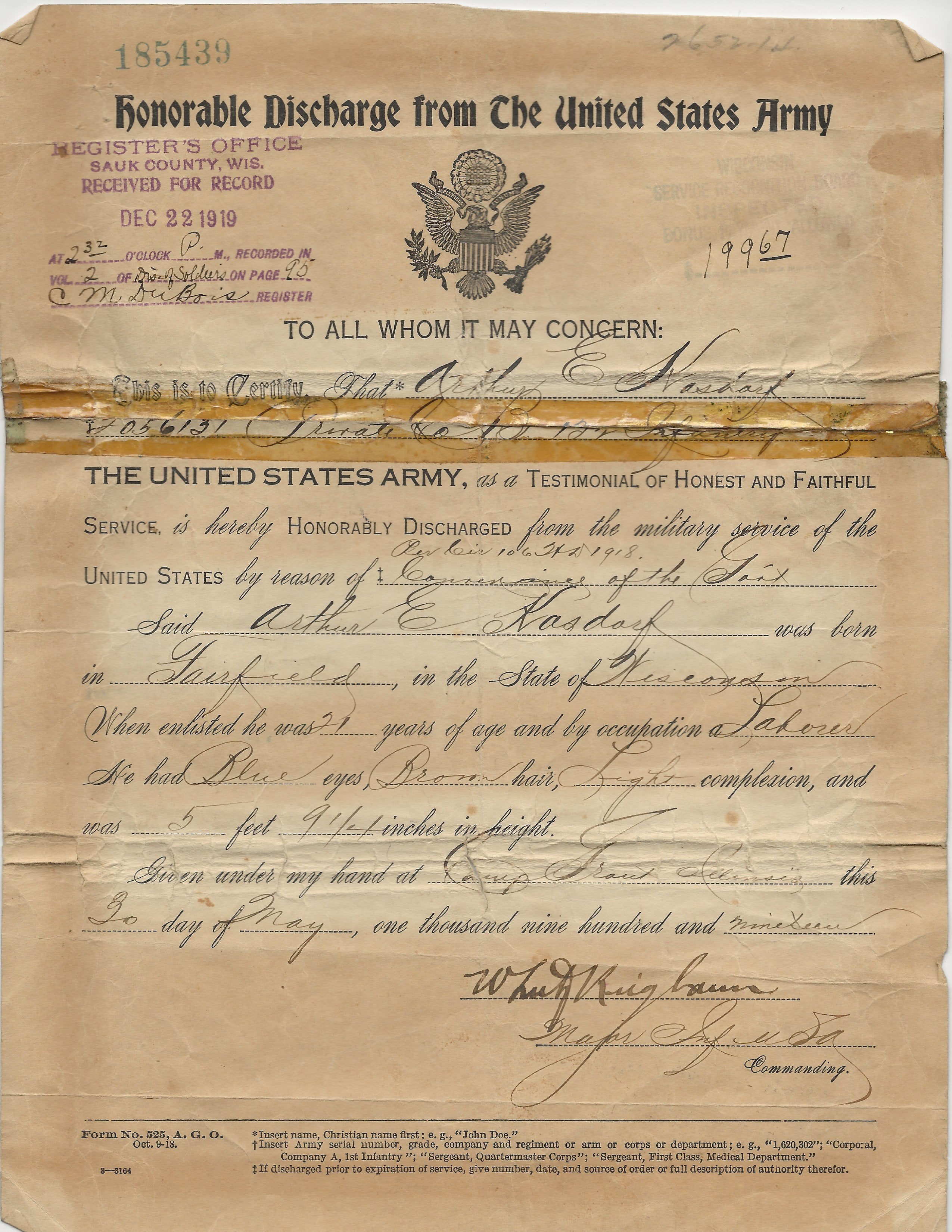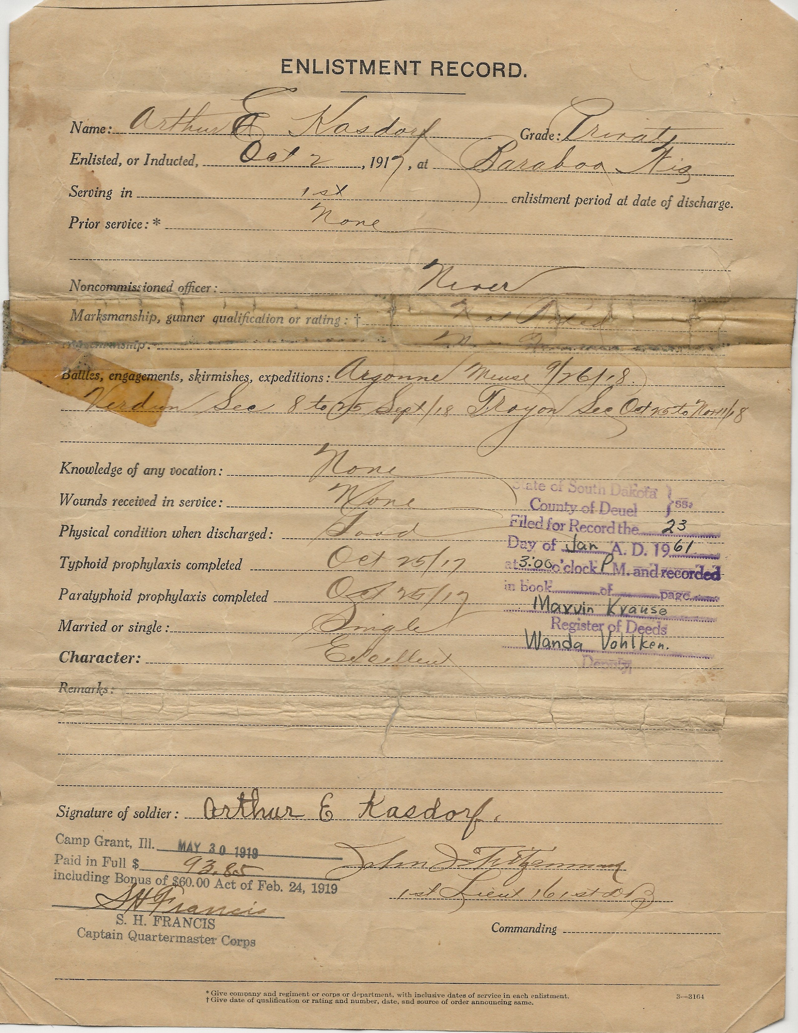 - Original Roll of Honor naming Kasdorf and his fellow soldiers and dated 1917.