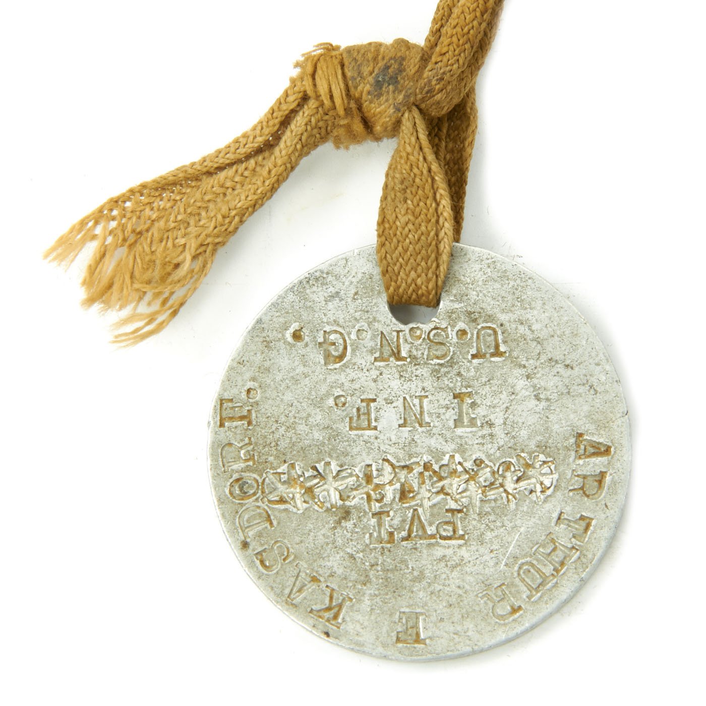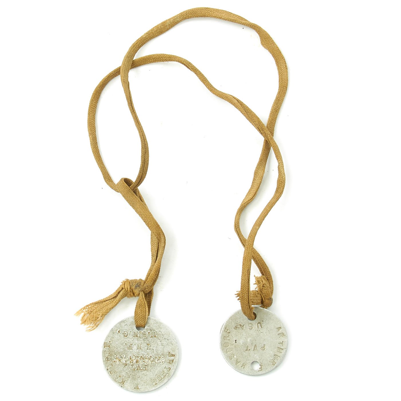 - Original dog tags (2) which read PVT Arthur E. Kasdorf 2056131 USA.