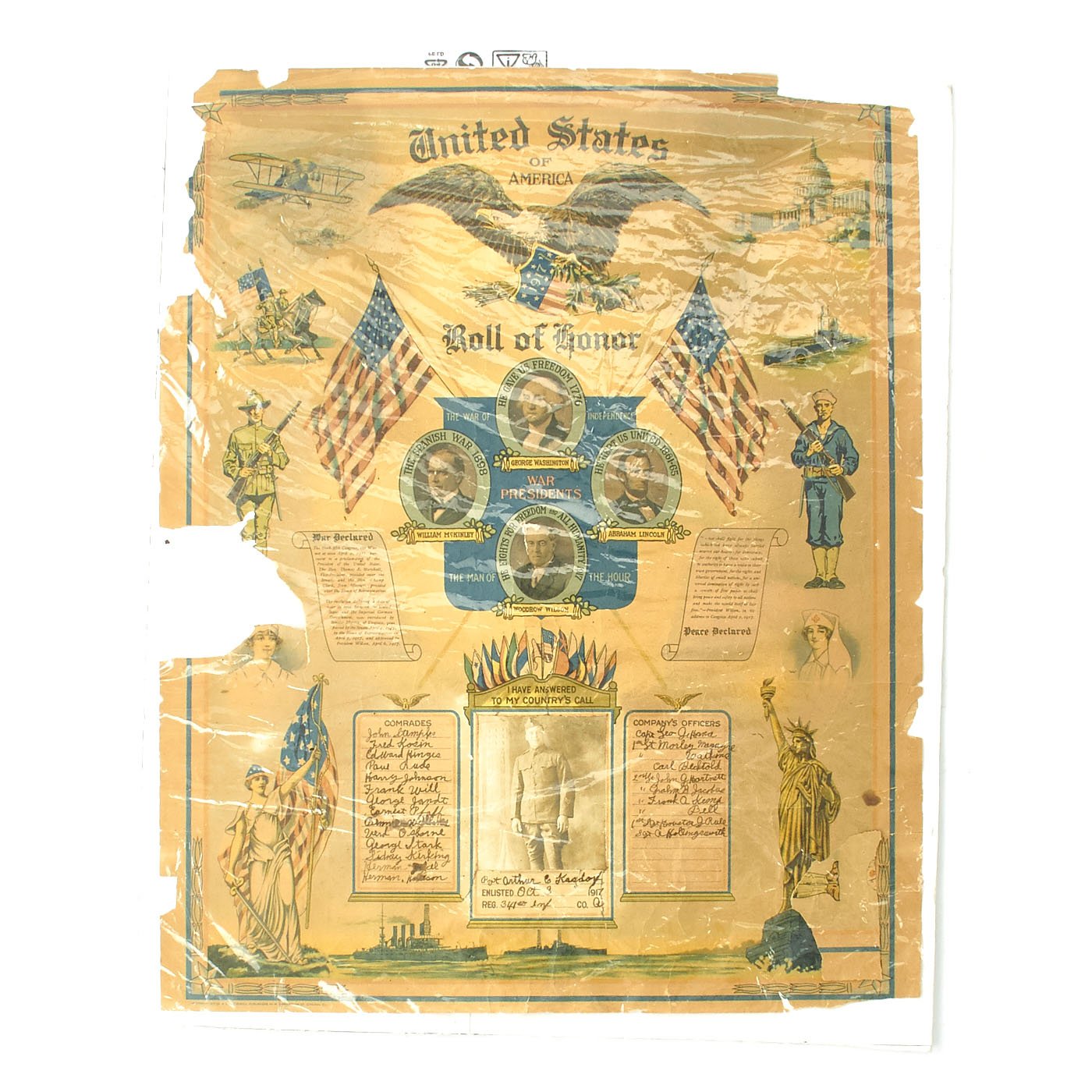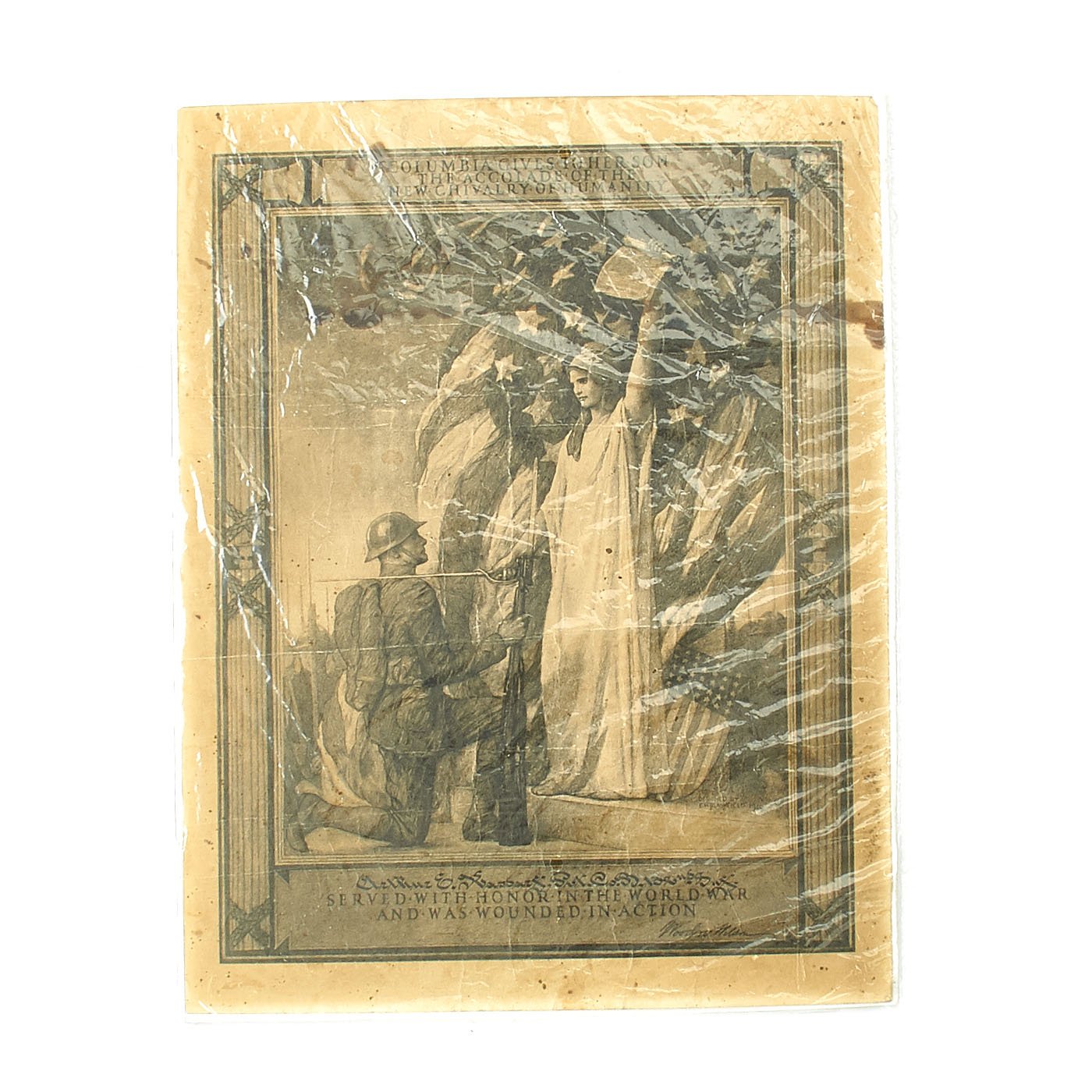 - Original framed World War I print entitled “Columbia Gives to her Son the Accolade of the New Chivalry of Humanity." Named to Arthur E. Kasdorf. Designed by E.H. Blashfield in 1919 andsigned by President Woodrow Wilson, these were given to soldiers who were wounded in action during World War I. At the bottom is the soldier’s name in calligraphy.