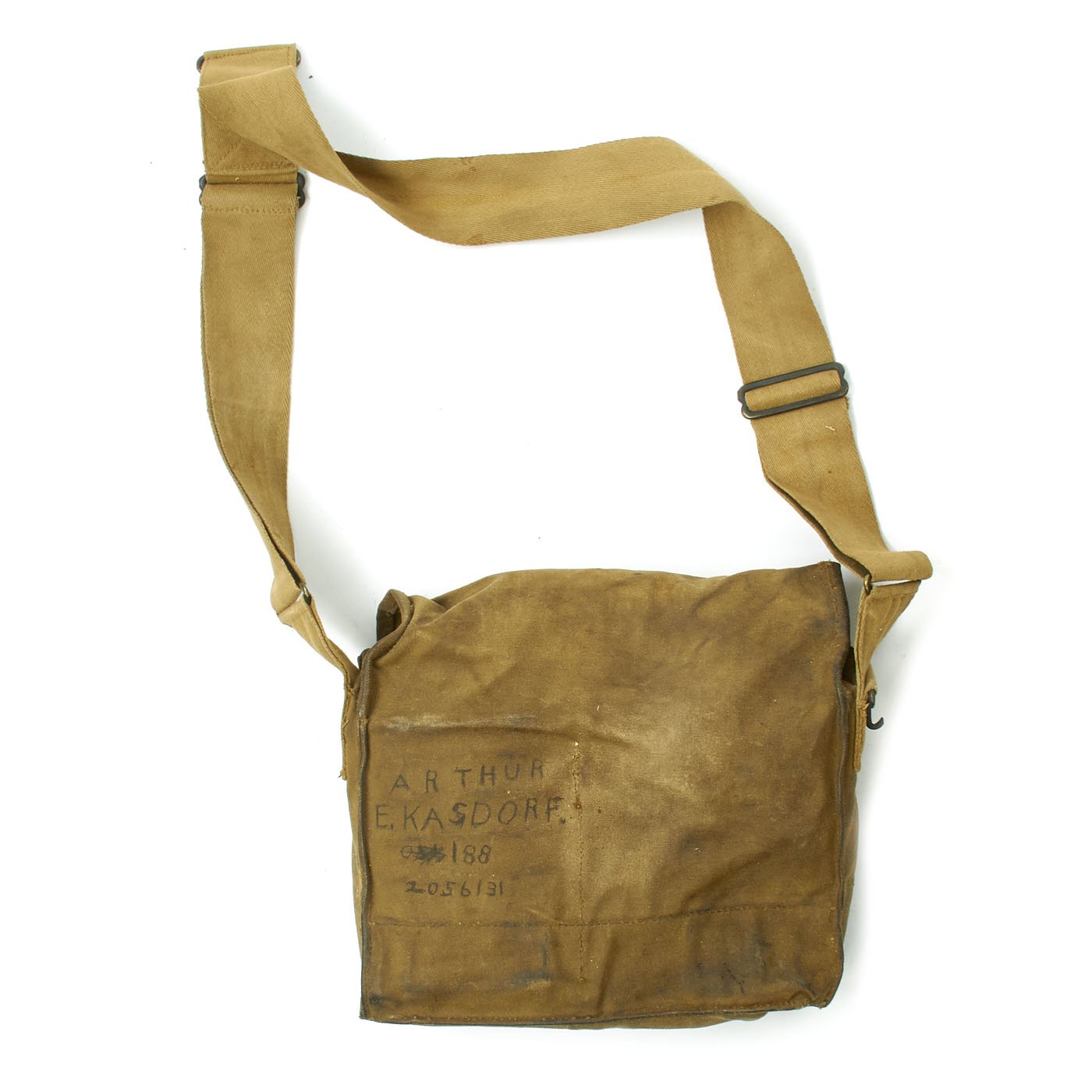 - Gas mask in bag named to Arthur E. Kasdorf 2056131.