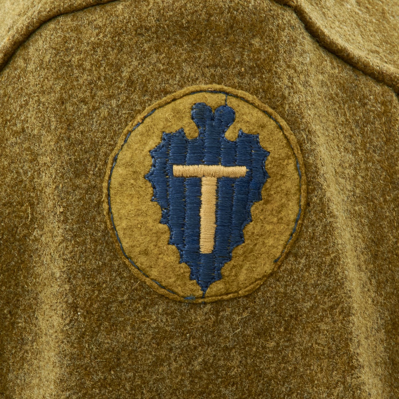 - Army tunic with 36th Infantry Division Arrowhead insignia on left shoulder, private chevron, overseas chevrons, 141st Infantry Collar disc and Machine Gunner Collar disc also includes matching Jodphur style trouser with belt and his ASN written in the waistband (1489163).