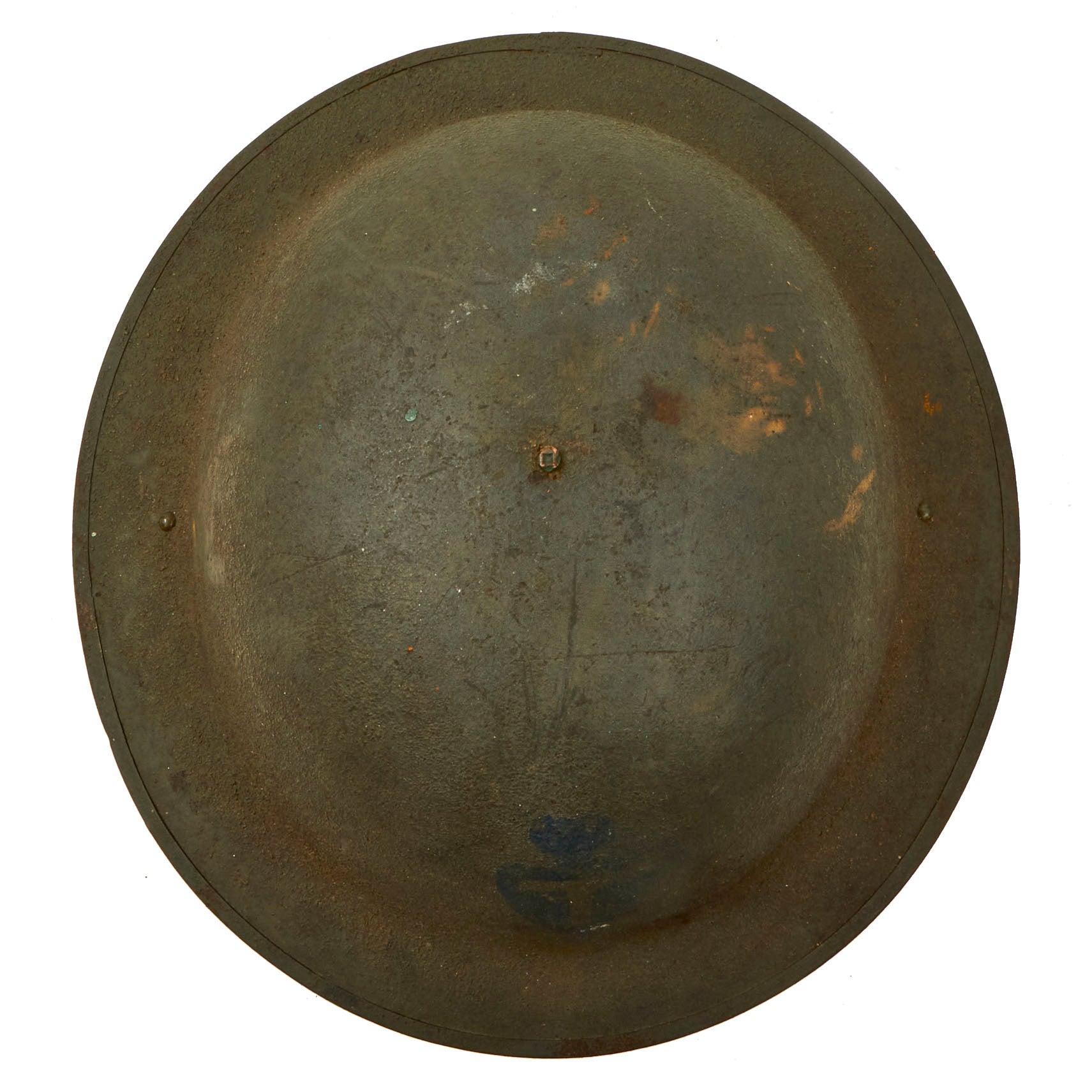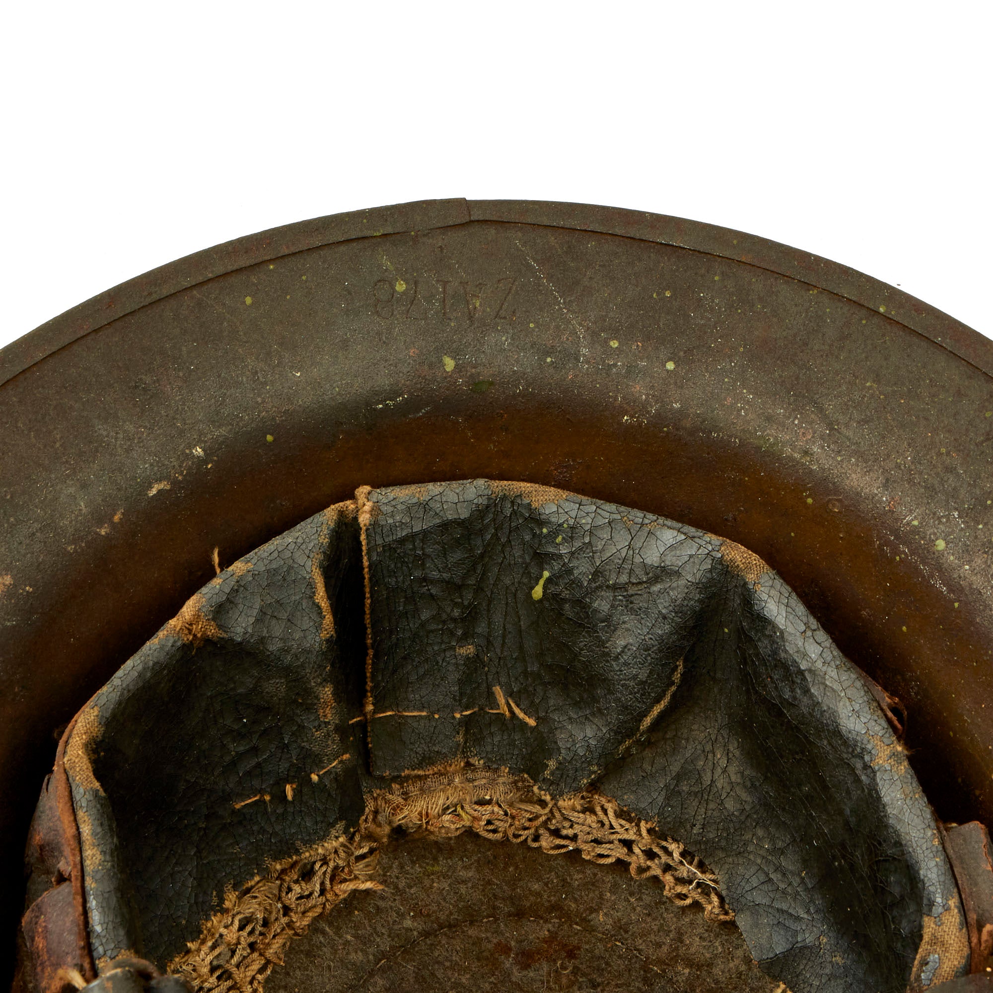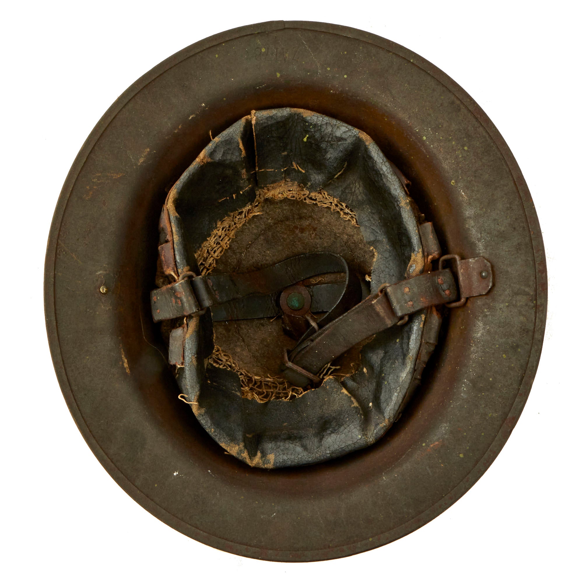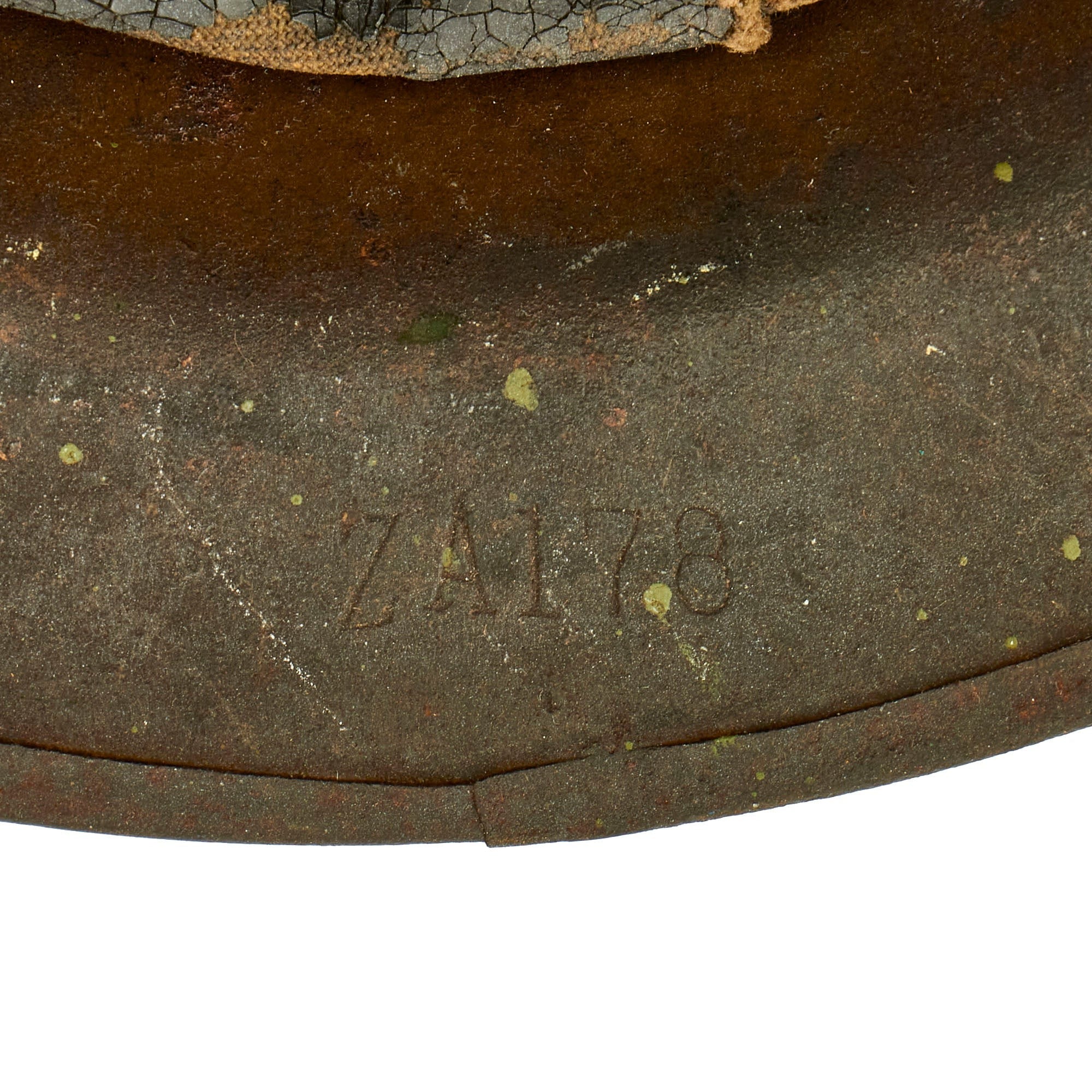 The underside of the rim is stamped ZA 178 indicating it was produced in the United States, and can be seen on the underside of the skirt towards the front. The solid rivets on the chin strap bales is another method of identifying the helmet as being American made. The liner and chinstrap is present and in worn condition with wear present and a detached chinstrap bale. The liner still retains the original top felt pad as well as remnants of the paper label.