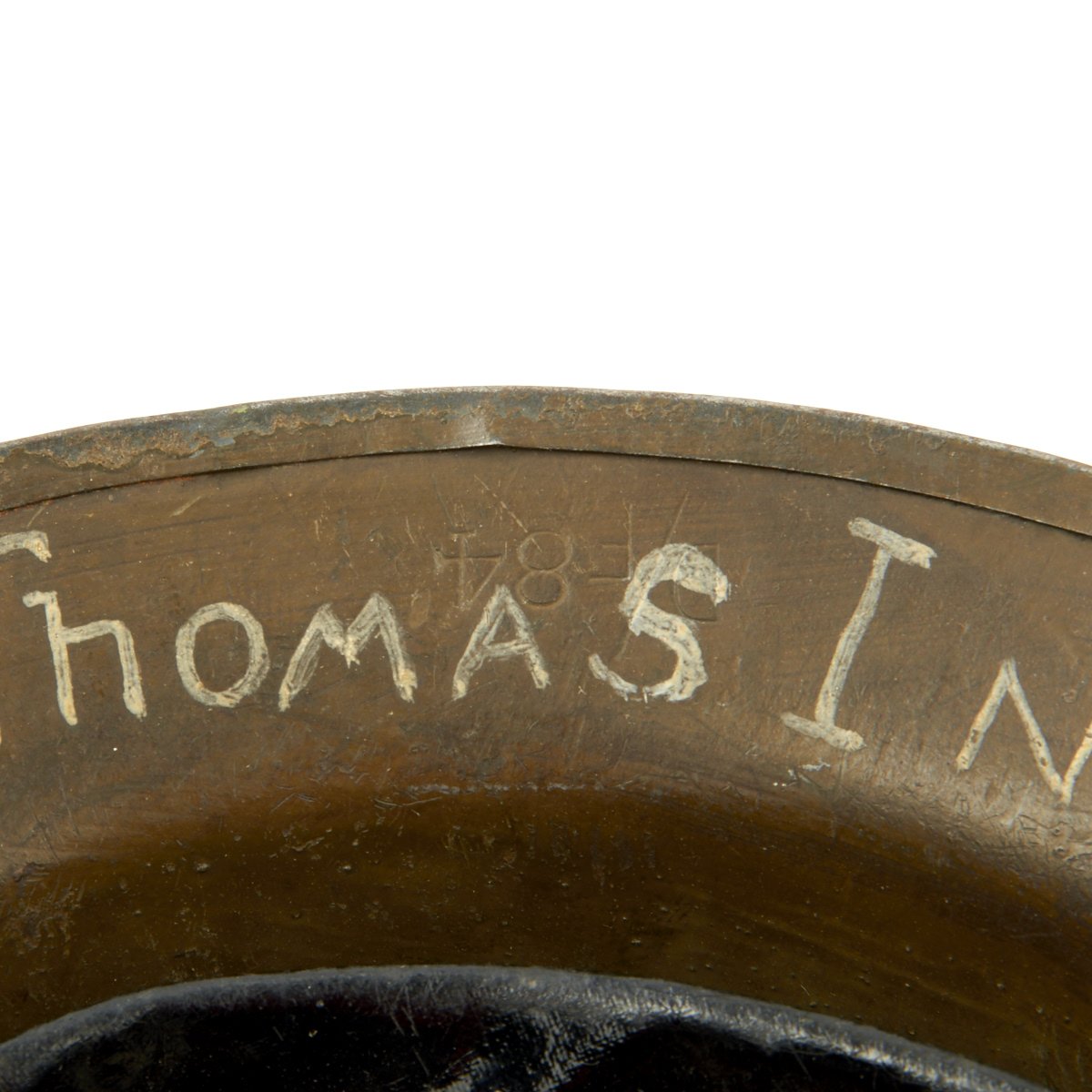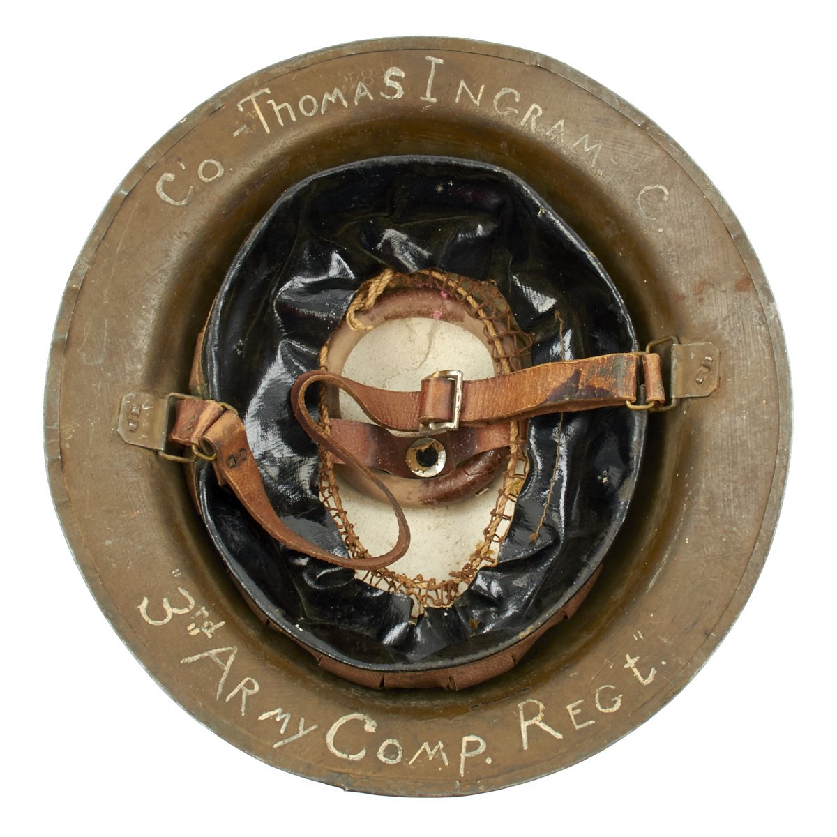 - M1917 Helmet with wonderful vibrant hand painted 3rd Infantry Division insignia to the front. Under the rim it is painted Thomas Ingram Co' C. 3rd Army Comp. Rect. The helmet is complete with liner and chinstrap.