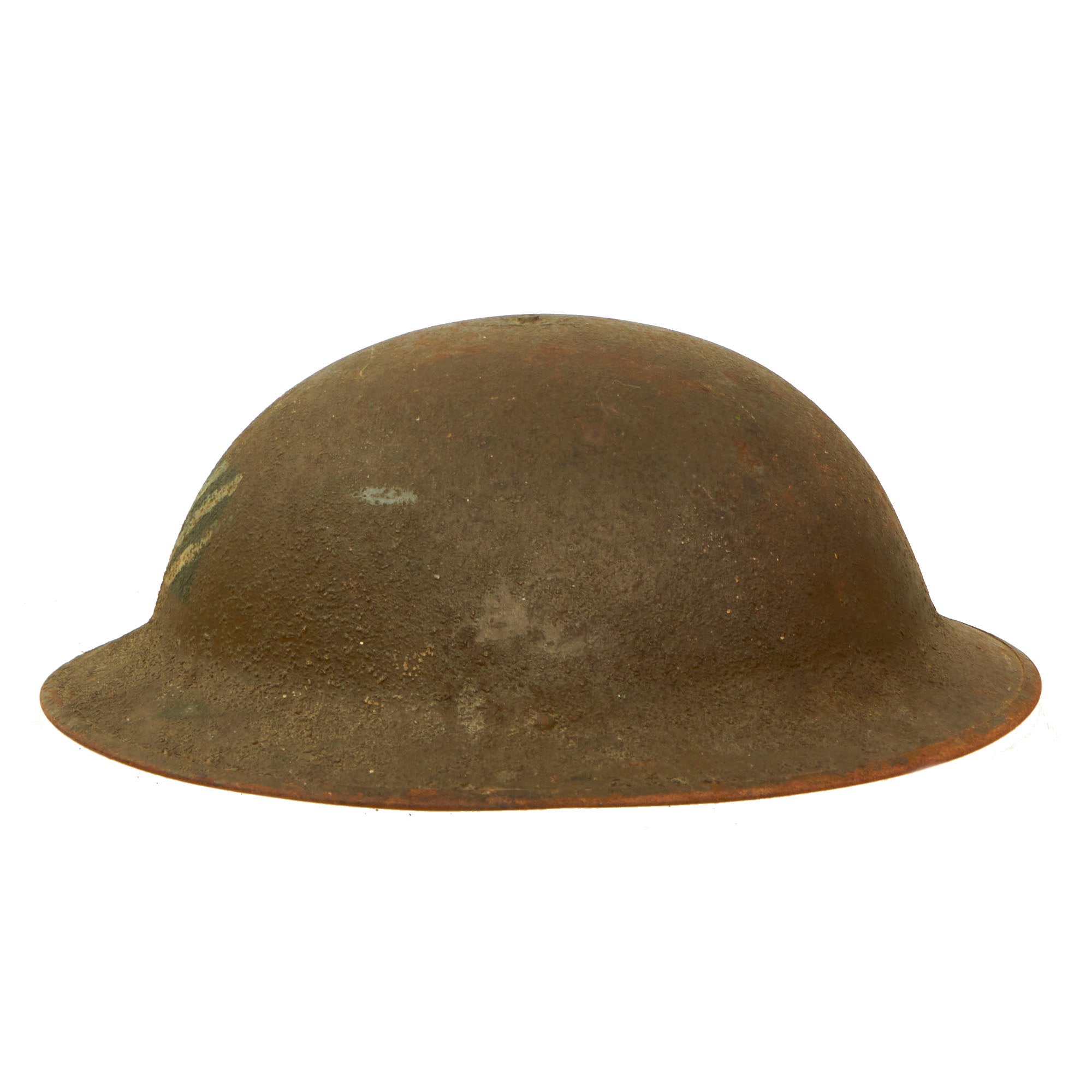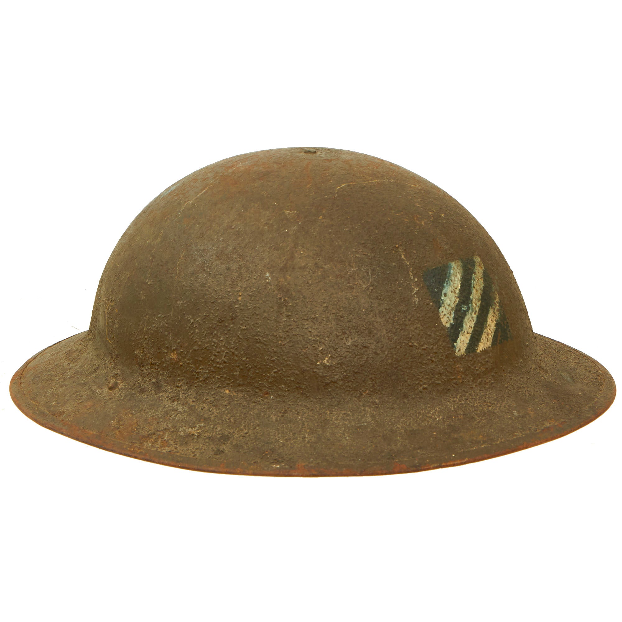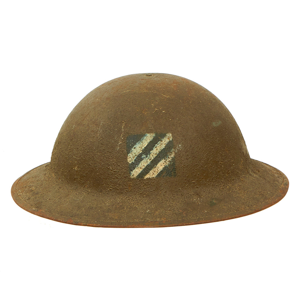 Original Item: Only One Available. This is a very nice example of a U.S. M1917 "Doughboy" helmet, which features original period Dark Green paint and retains much of the original textured paint as well as a beautiful 3rd Infantry Division striped insignia on the front. The division’s insignia consists of three white stripes on a blue field. The stripes symbolize the operations the division participated in during WWI. The blue background represents the loyalty of those who sacrifice their lives serving in this division to protect American liberty and democracy.