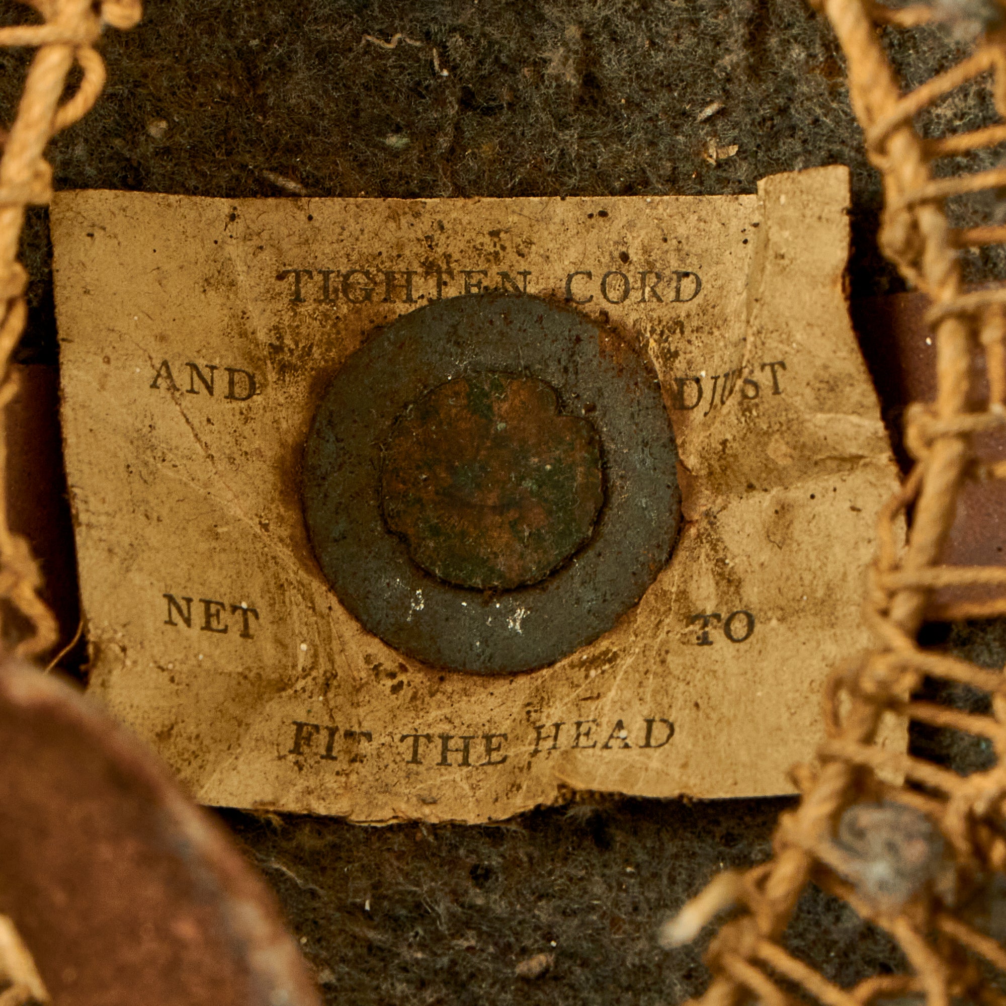 M1917 helmet liners typically show a paper label at the crown and the dome rivet head. The liner is set up as on the British versions, with an oilcloth band and net configuration, attached to a leather strap, riveted to the shell. The chinstrap is leather with a steel buckle.