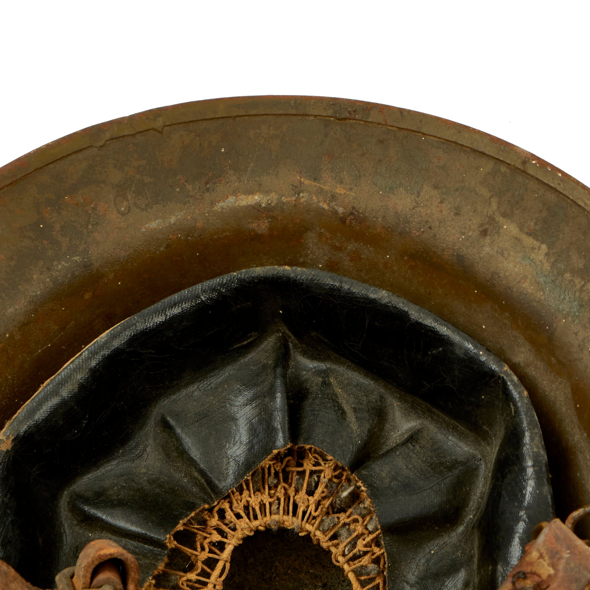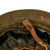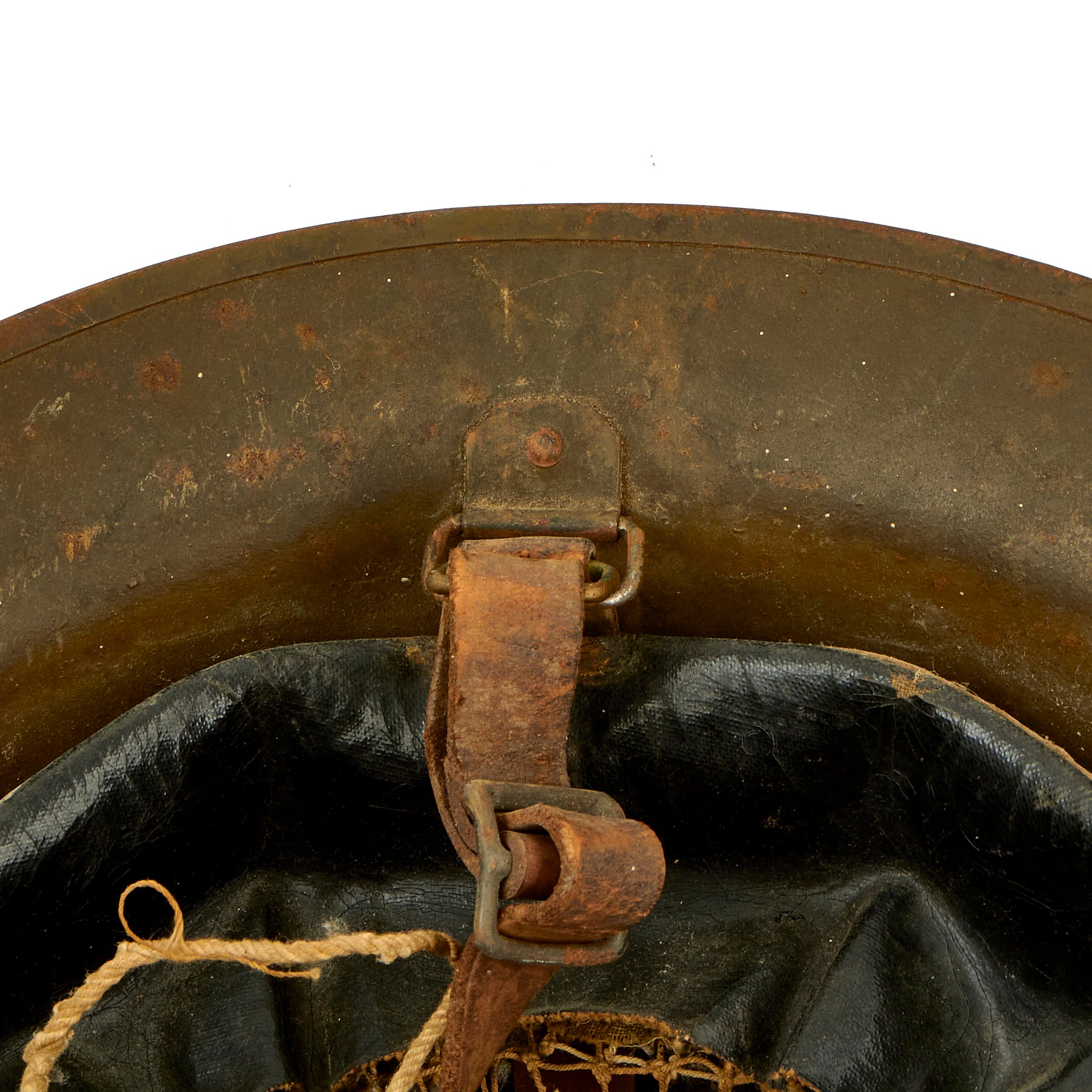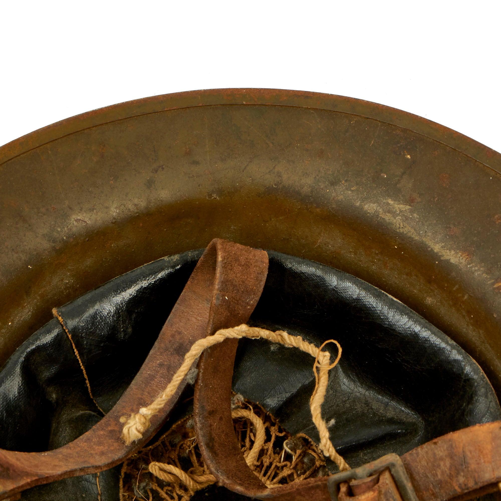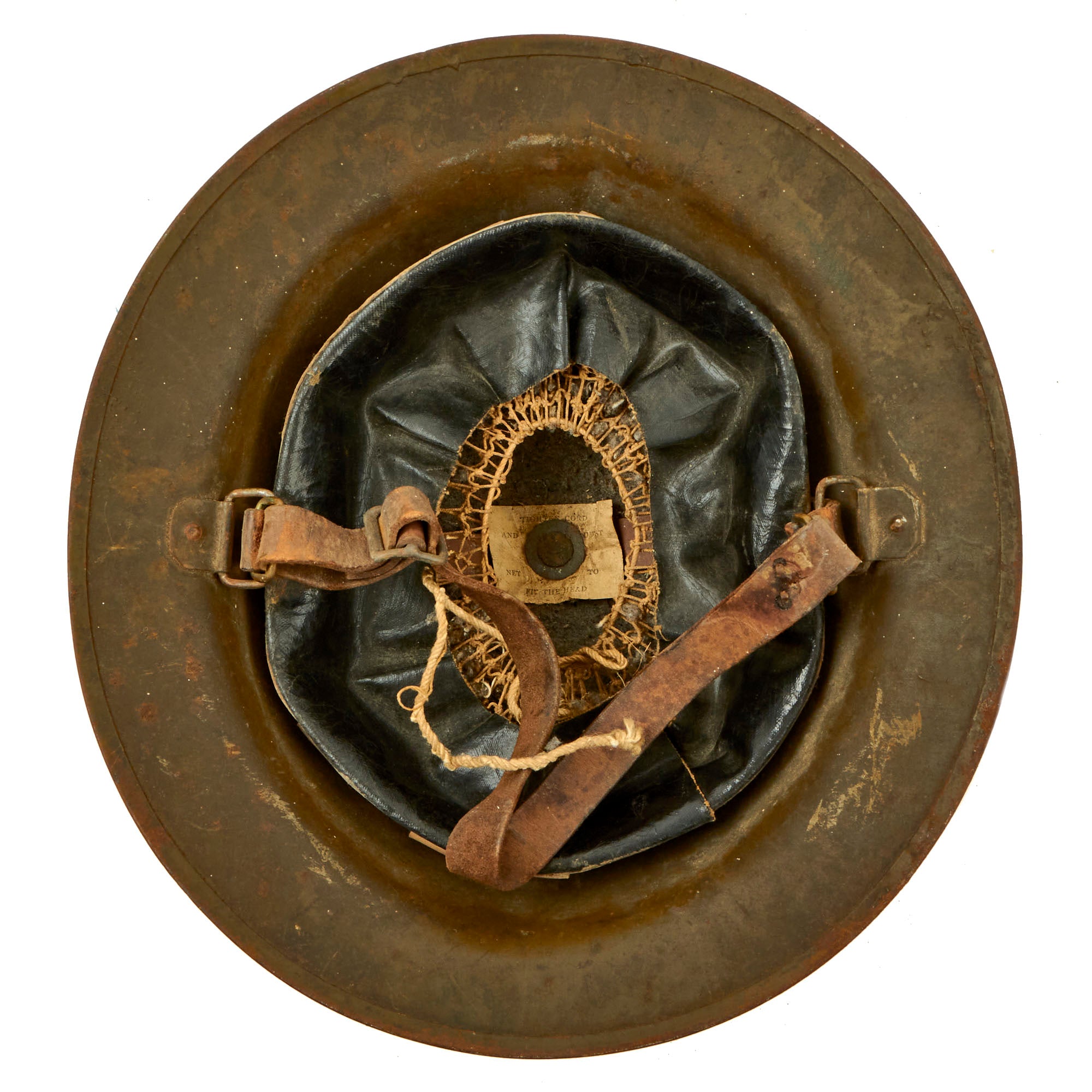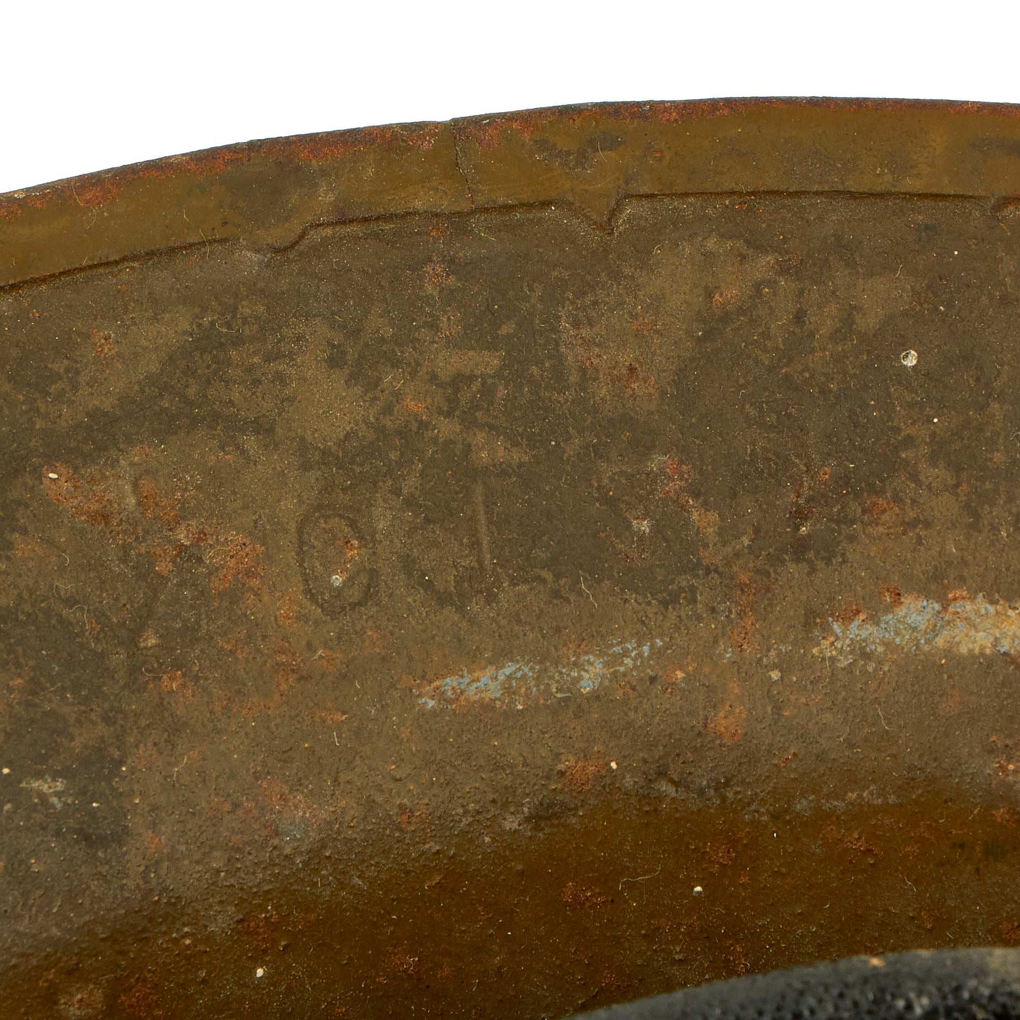 The solid rivets on the chin strap bales is another method of identifying the helmet as being American made. The liner and chinstrap is present and still solid. The liner still retains the original top felt pad as well as a complete paper label.