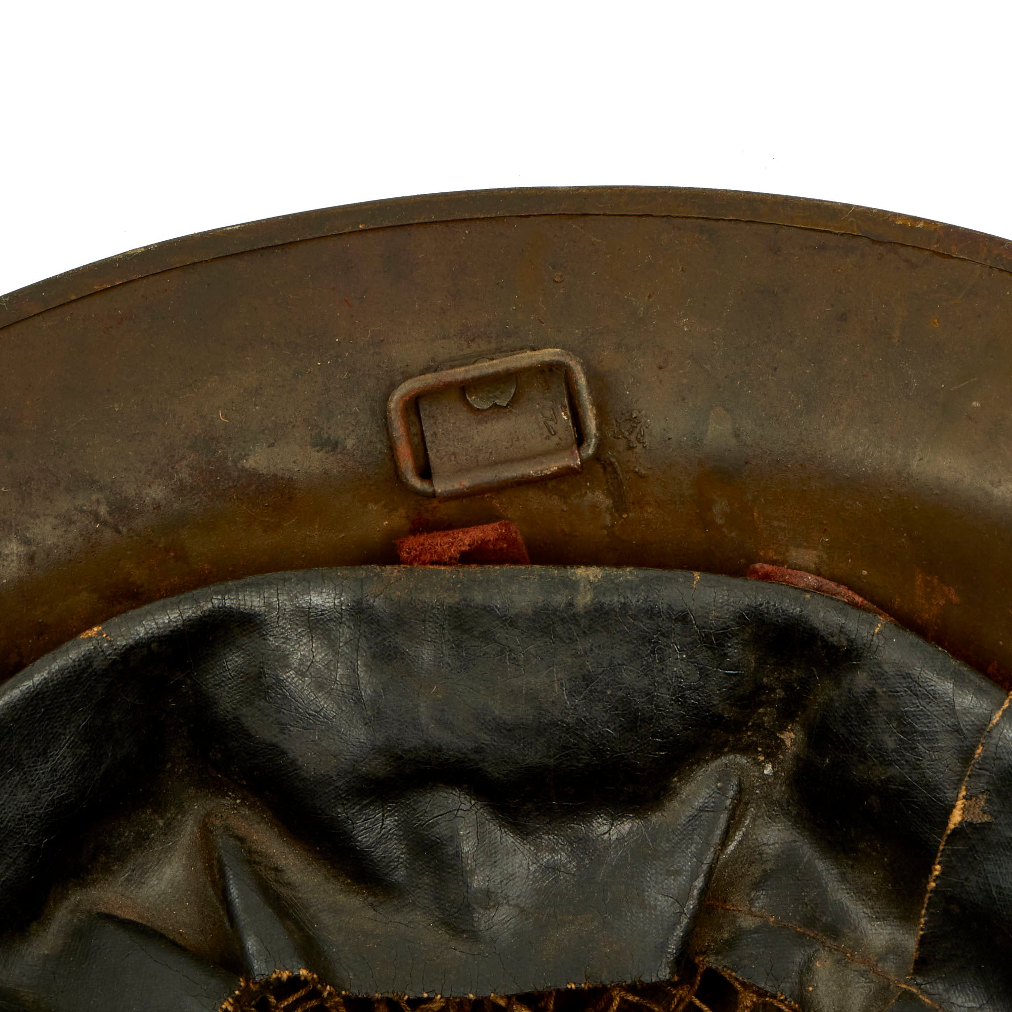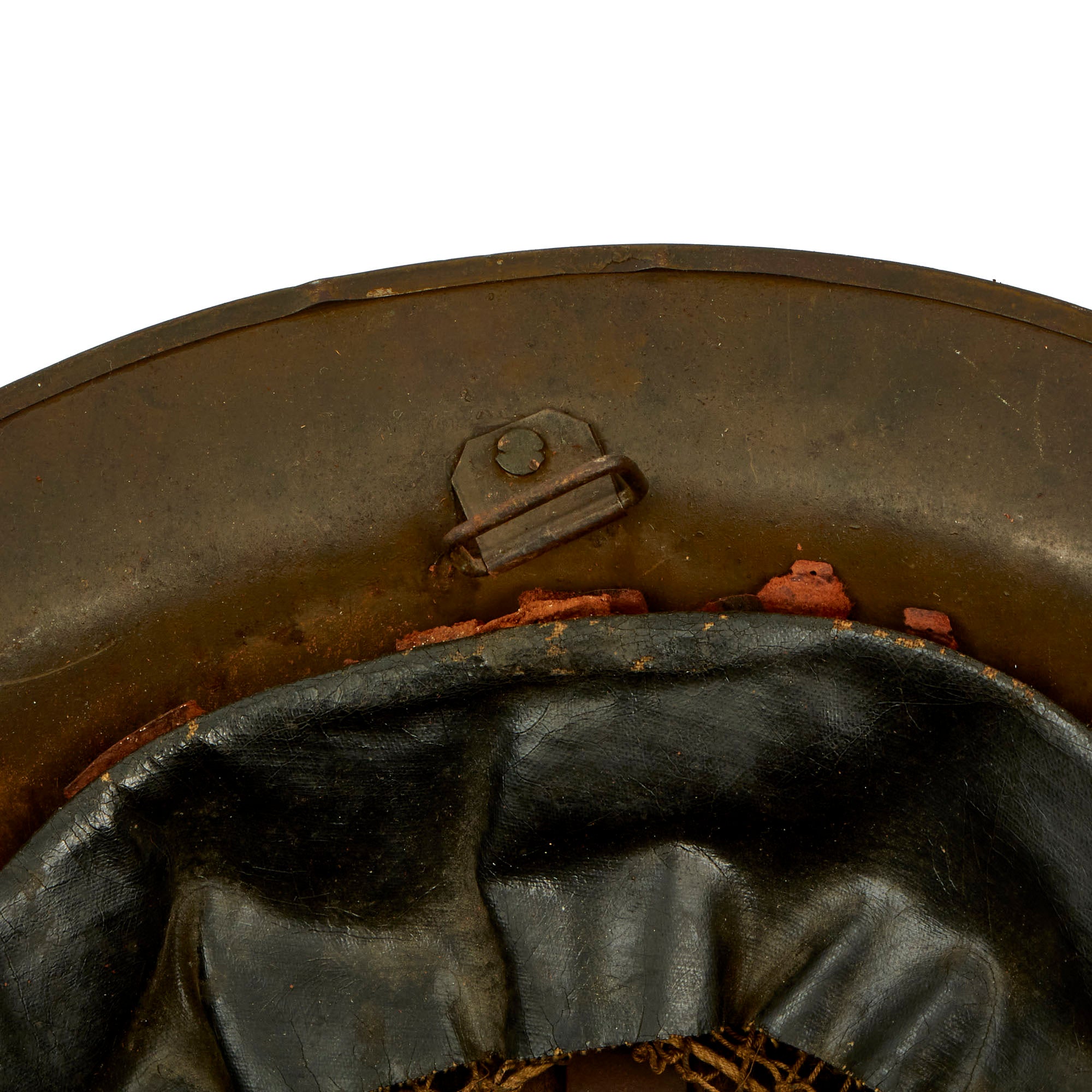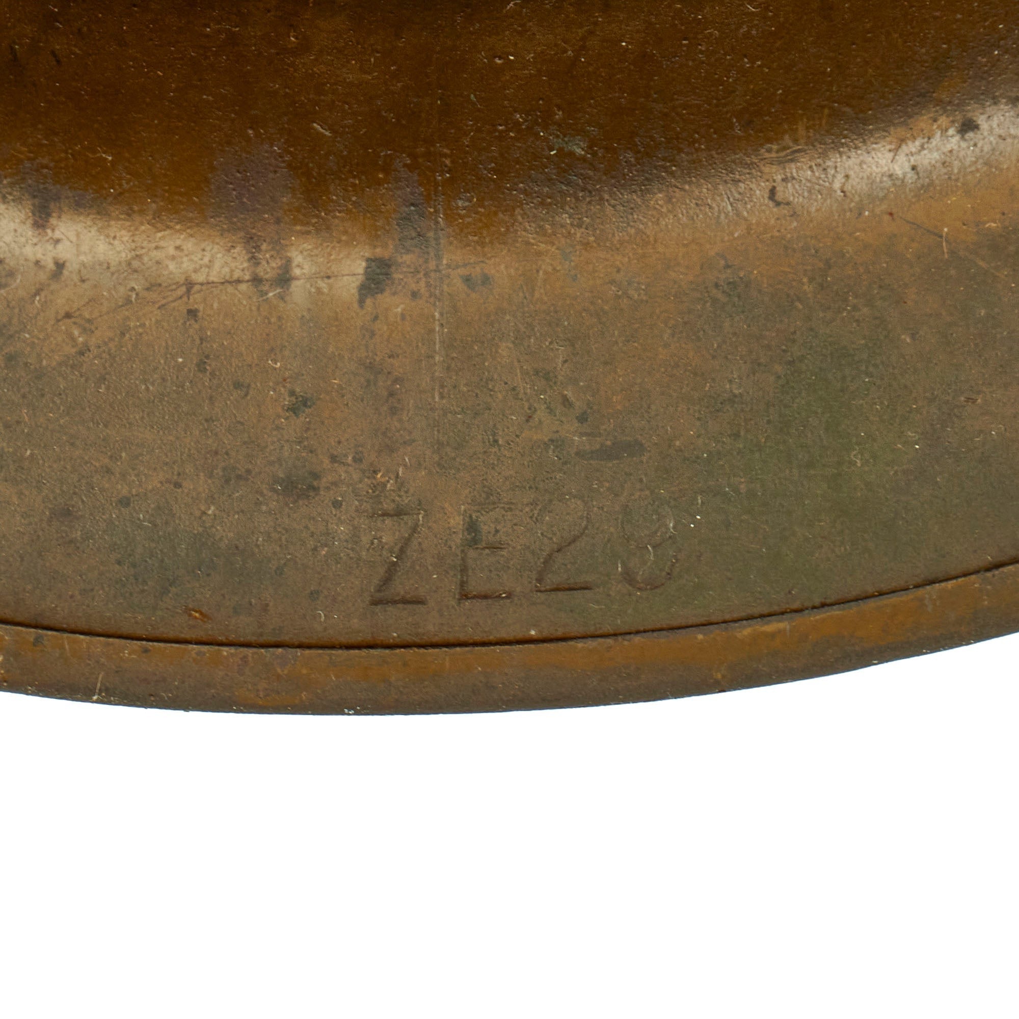 The paint is somewhat worn, and definitely shows use, but it has a great look and the colors are still easily discernible. The underside of the rim is stamped ZE 29 indicating it was produced in the United States, and can be seen on the underside of the skirt towards the front. The solid rivets on the chin strap bales is another method of identifying the helmet as being American made. The liner is still present as is the top felt pad with paper label, but the entire lower portion of the chinstrap is missing.