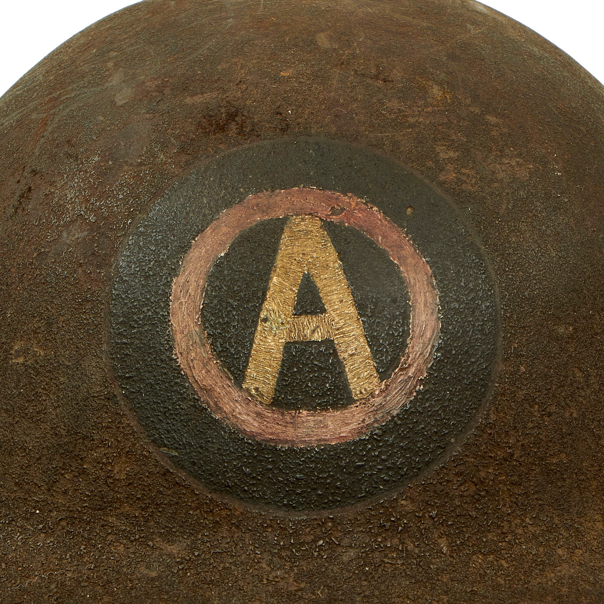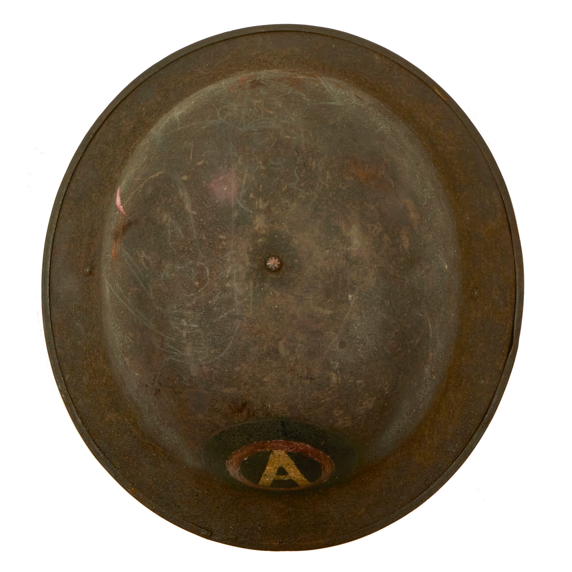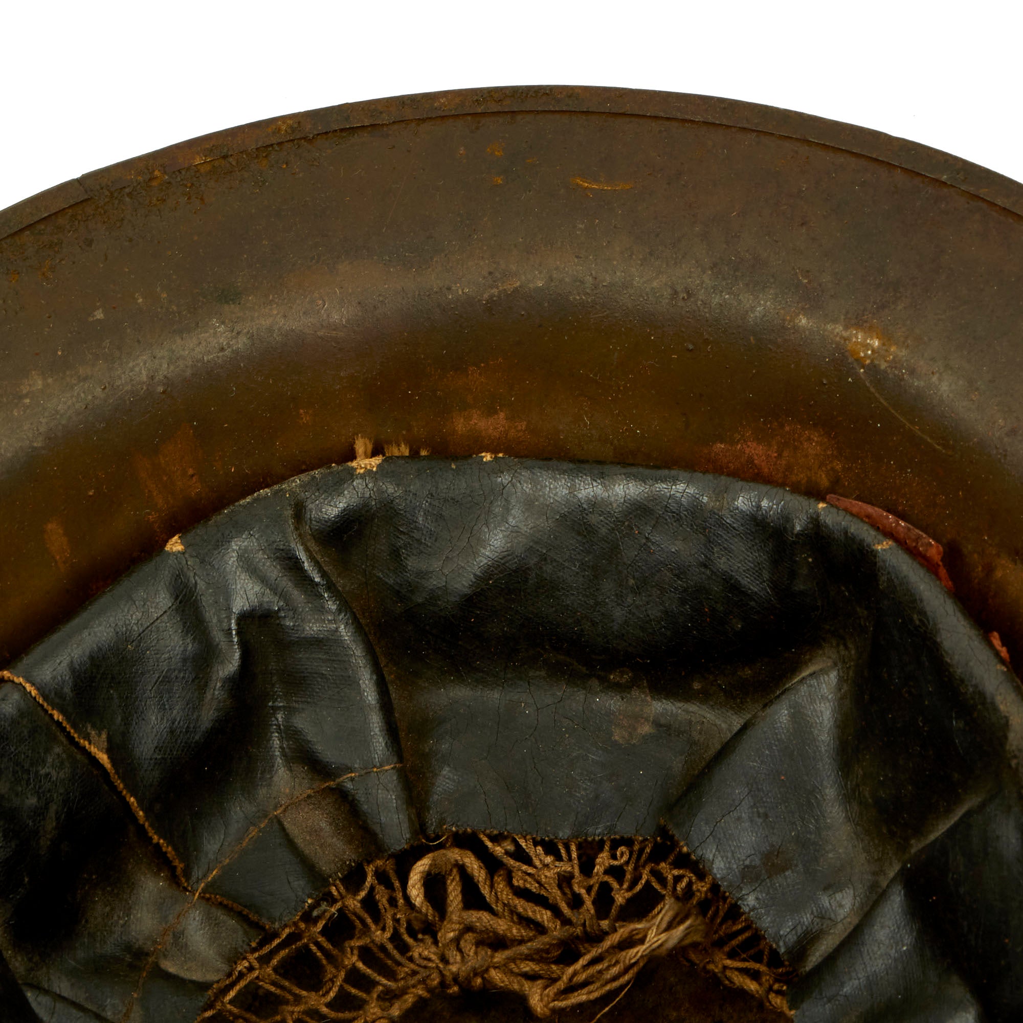 The paint is somewhat worn, and definitely shows use, but it has a great look and the colors are still easily discernible. The underside of the rim is stamped ZE 29 indicating it was produced in the United States, and can be seen on the underside of the skirt towards the front. The solid rivets on the chin strap bales is another method of identifying the helmet as being American made. The liner is still present as is the top felt pad with paper label, but the entire lower portion of the chinstrap is missing.