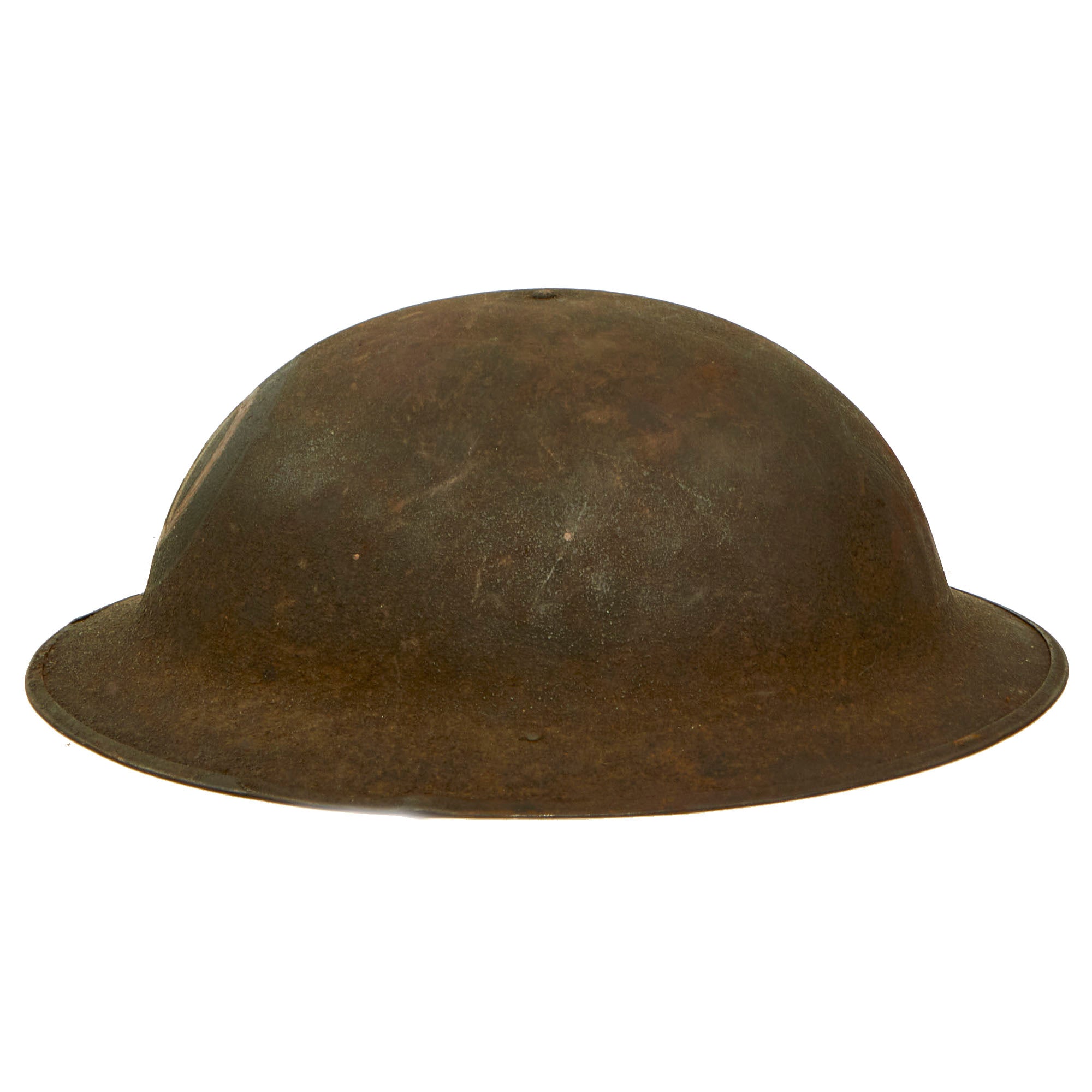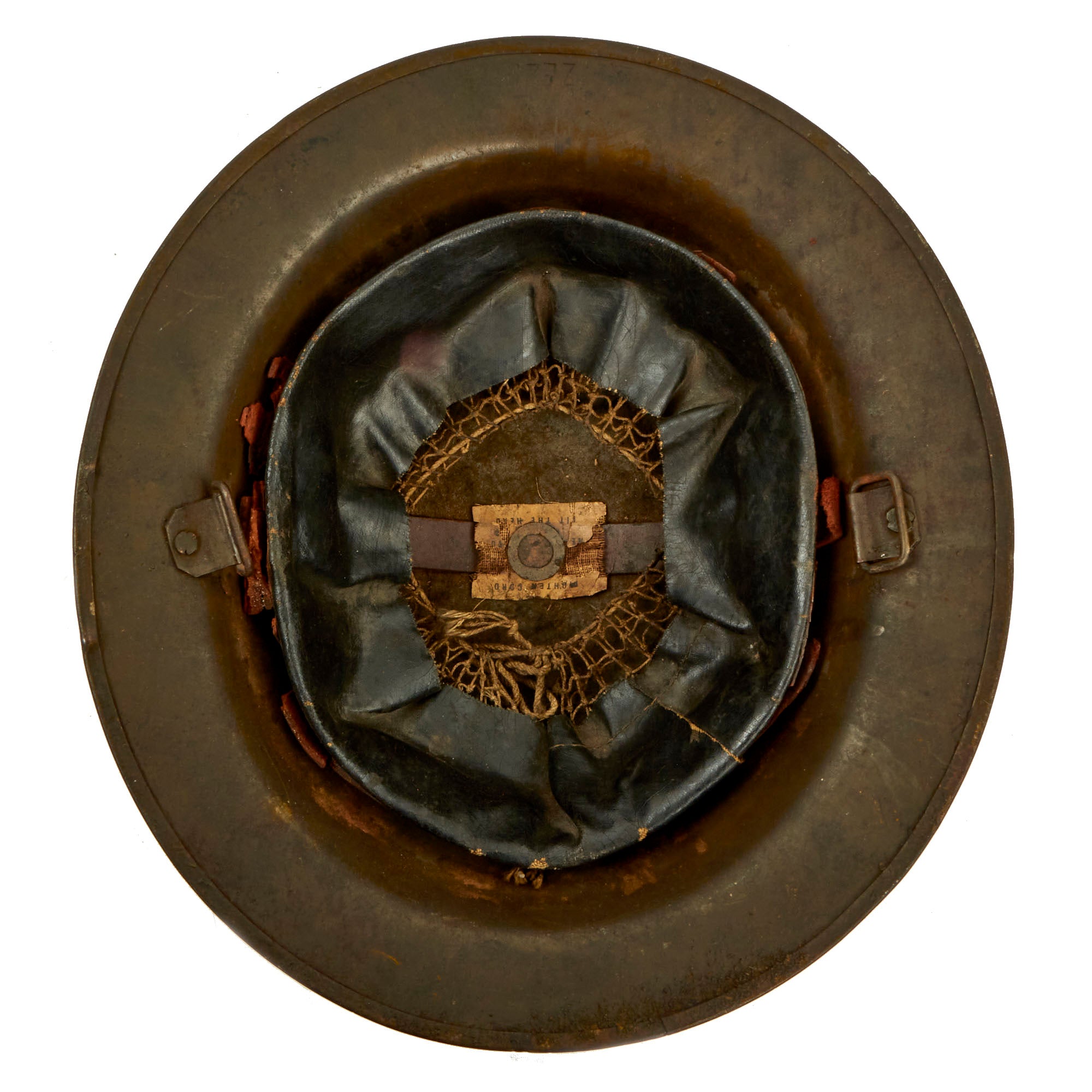 The M-1917 helmet was very similar to the British Mk. I helmet. The helmet was basically an inverted bowl stamped out of a single piece of manganese alloy, which was made up of 13 percent manganese and was .036" thick. This differed from the British helmet, as the Mk. I helmet was made up of 12 percent manganese. Thus ballistically, the M-1917 helmet increased protection for the wearer by 10 percent over the British Mk. I helmet, and could withstand a .45 caliber pistol bullet traveling at 600 feet per second fired at a distance of 10 feet. A rim was spot welded to the edge of the steel bowl, with the ends butted, as opposed to lapped, which was done on the British Mk. I helmet. Riveted to the steel bowl were two flexible guiding loops for the chin strap. Here again, the U.S. M-1917 helmet differed from the British Mk. I helmet. On the U.S. helmet the loops were secured by solid machined rivets, whereas the British Mk. I helmet used split rivets. An adjustable leather chin strap was riveted to the steel bowl and consisted of two halves, each joined together by metal loops which were secured to the ends of the leather halves by steel split rivets. Also riveted to the steel bowl was the helmet lining. The lining was also similar to that of the British Mk. I helmet and consisted of a number of items described below: