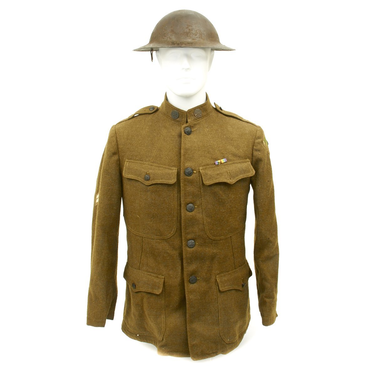- 1917 Wool uniform tunic with fantastic rare 47th Infantry Regiment insignia patch to the left shoulder, 47th collar device, HQ company collar device, Corporal chevron and overseas service bars. World War I Victory Medal ribbon with two bronze battle stars. Size is approximately a US 38. Named in ink on internal pocket 2003918 Koressel. Offered in excellent condition.
