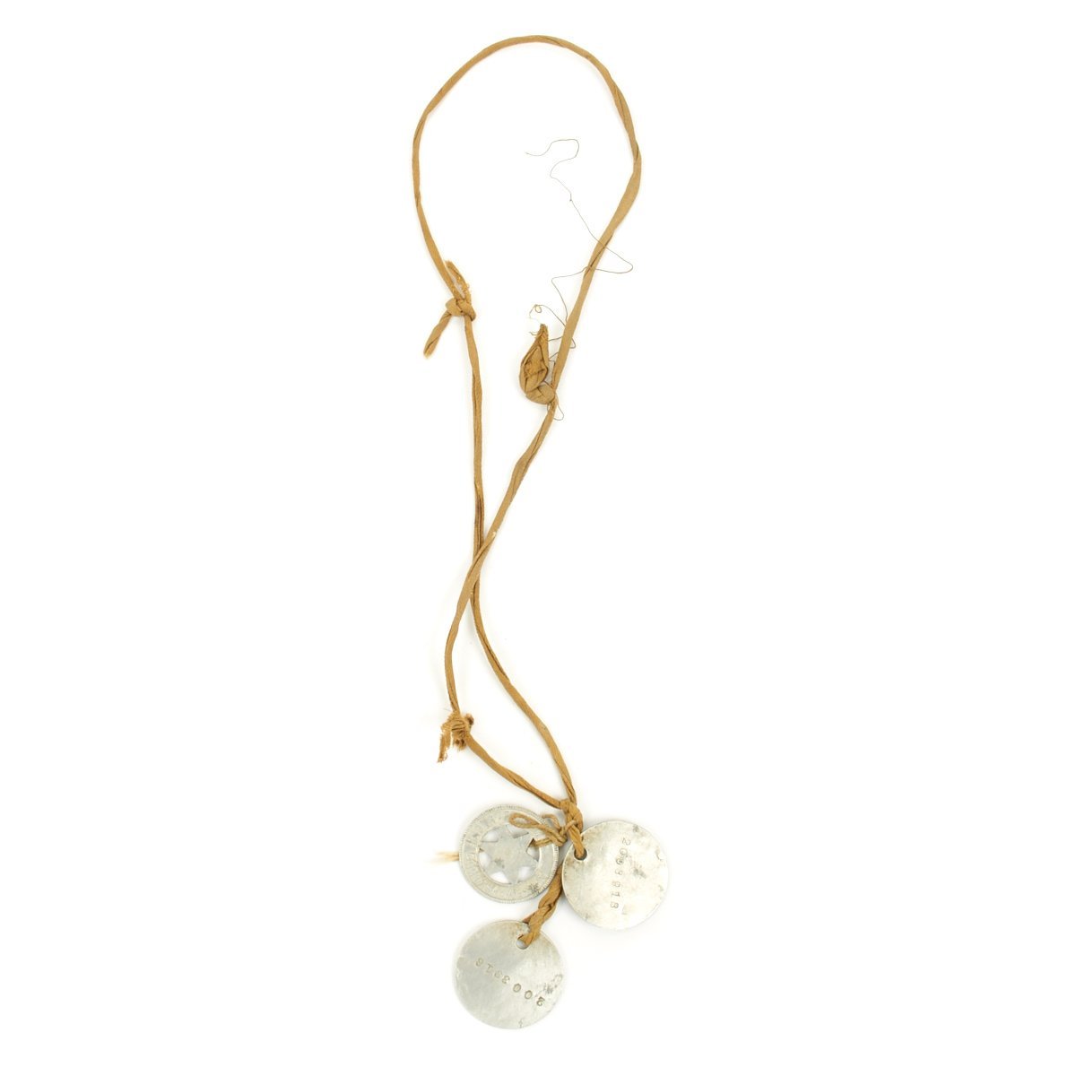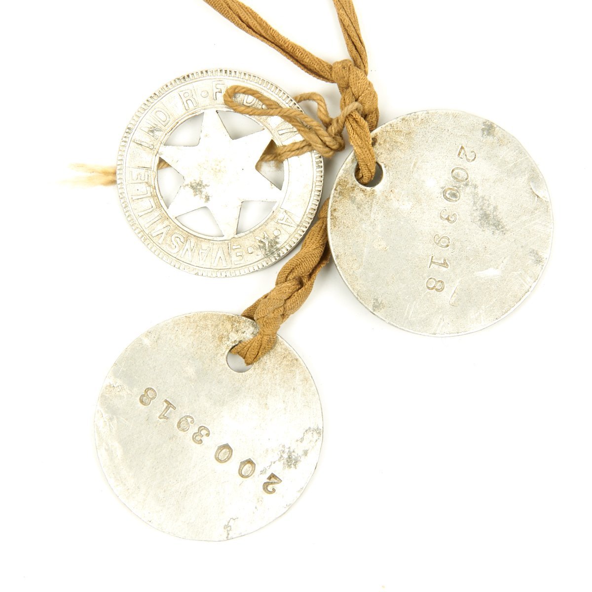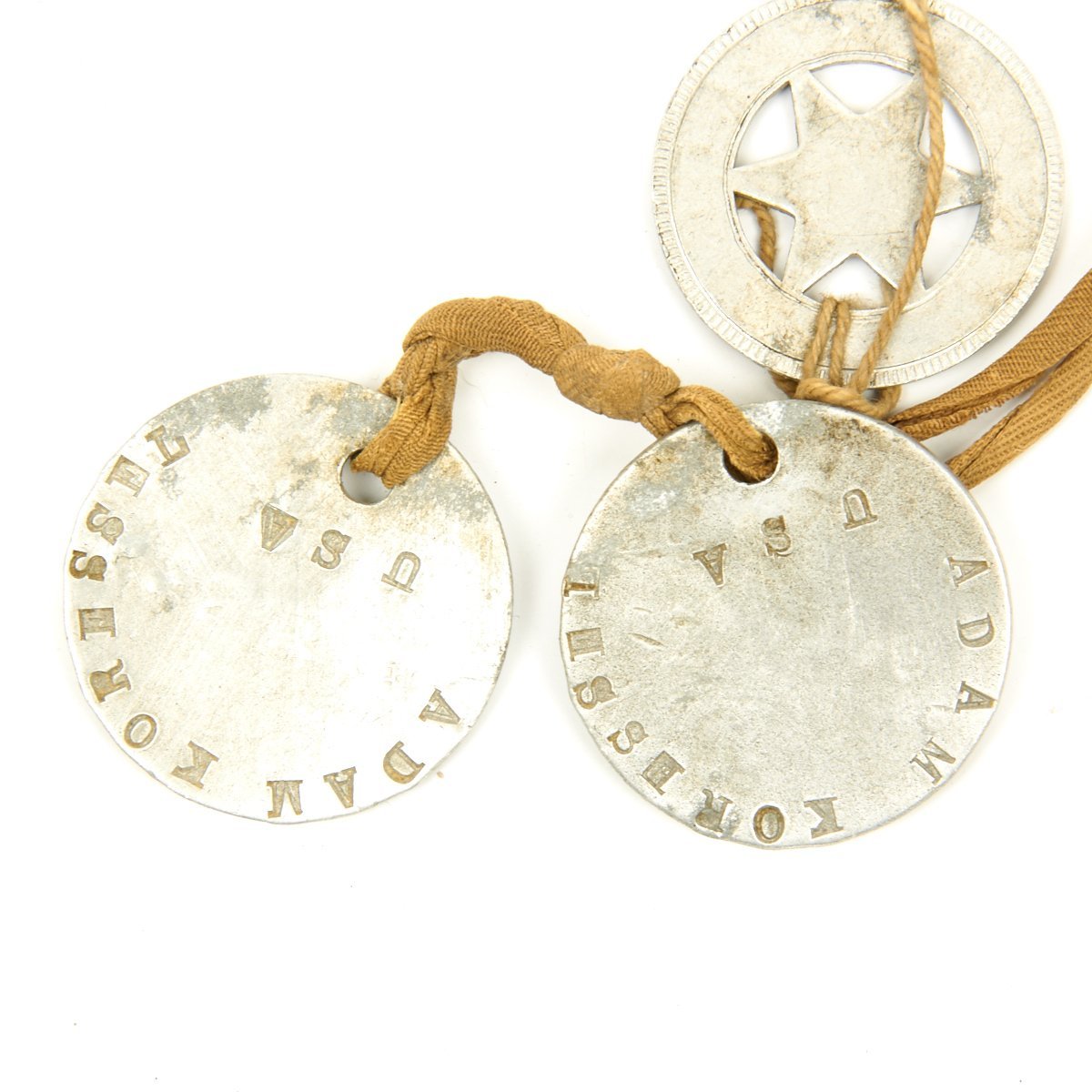 - Adam Koressel 2003918 U.S. Army WWI Dog Tags with original lanyard and Evansville, Indiana recruiter badge.